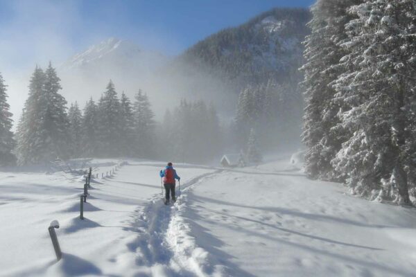 Schneeschuhwandern auf dem Arnisee Trail im Urnerland bei Amsteg – eine herrliche Schneeschuhwanderung durch eine verträumte ruhige Winterlandschaft, abseits von Tourismushochburgen.