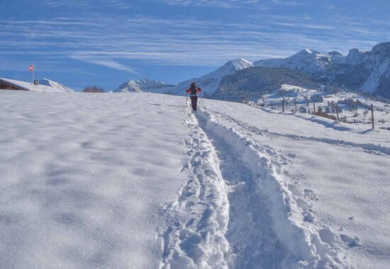 Schöne Schneeschuhwanderung in Amden, auf der Sonnenterrasse hoch über dem Walensee. Von Arvenbüel führt der Vorder Höhi Schneeschuh-Trail zur gleichnamigen Alpwirtschaft. Grandiose Panoramaausblicke über die Glarner Alpen, das Toggenburg mit den Churfirsten bis zum Alpstein warten.