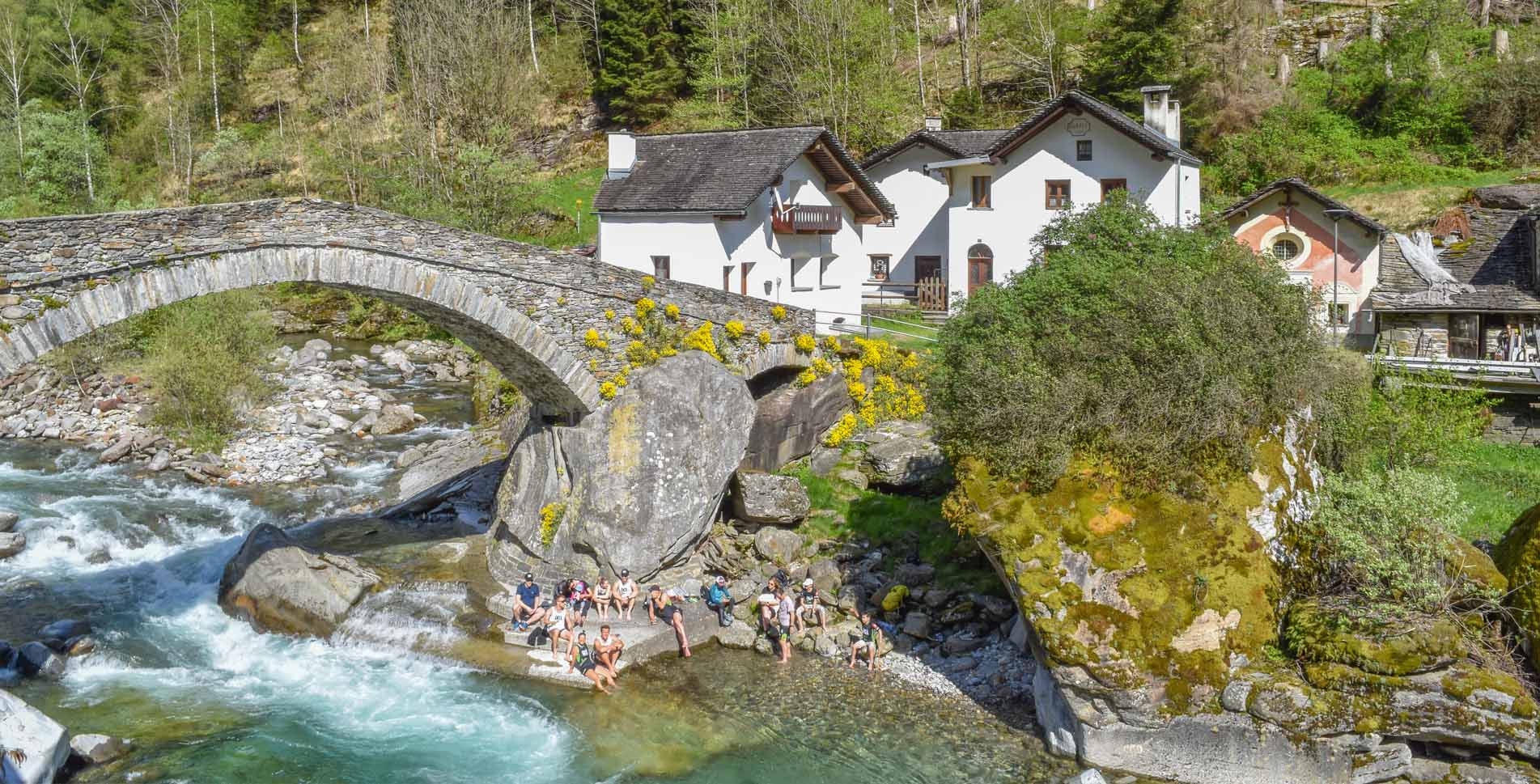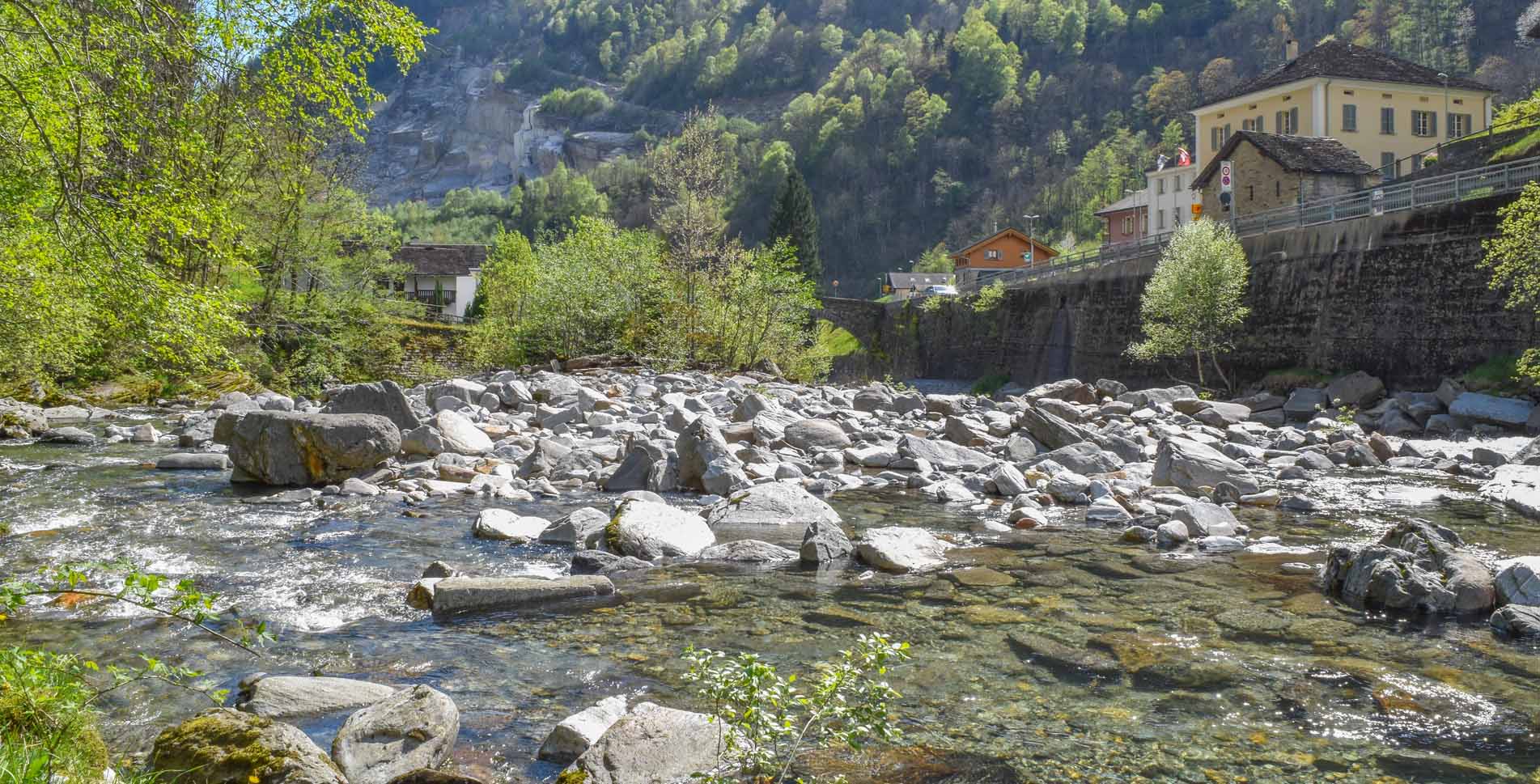 Zum Schluss noch ein Highlight: die schöne, steinerne Bogenbrücke, die auf die andere Flussseite führt. Gleich bei der Bushaltestelle Arvigo Paese befindet sich das Ristorante Germinia (+41 91 828 10 21) für eine letzte Einkehr. Etwas unterhalb von Arvigo befindet sich übrigens ein Steinbruch, wo seit mehr als 100 Jahren Gneis abgebaut wird.
