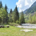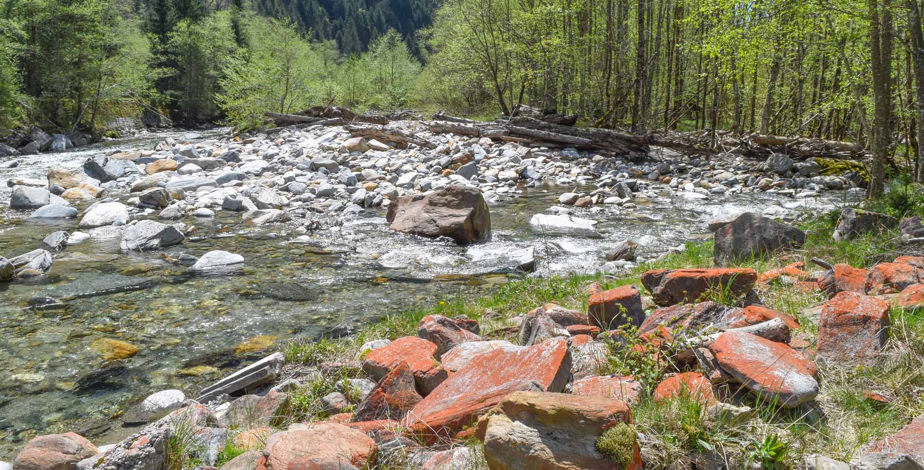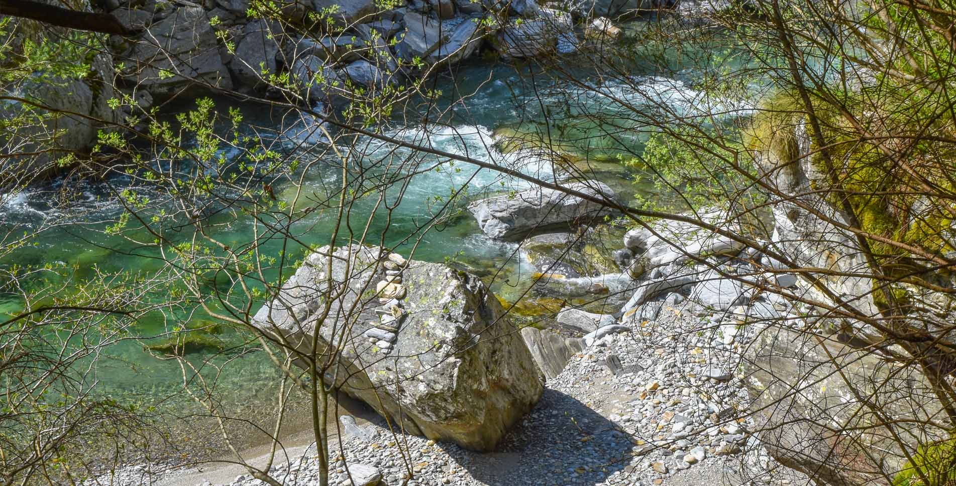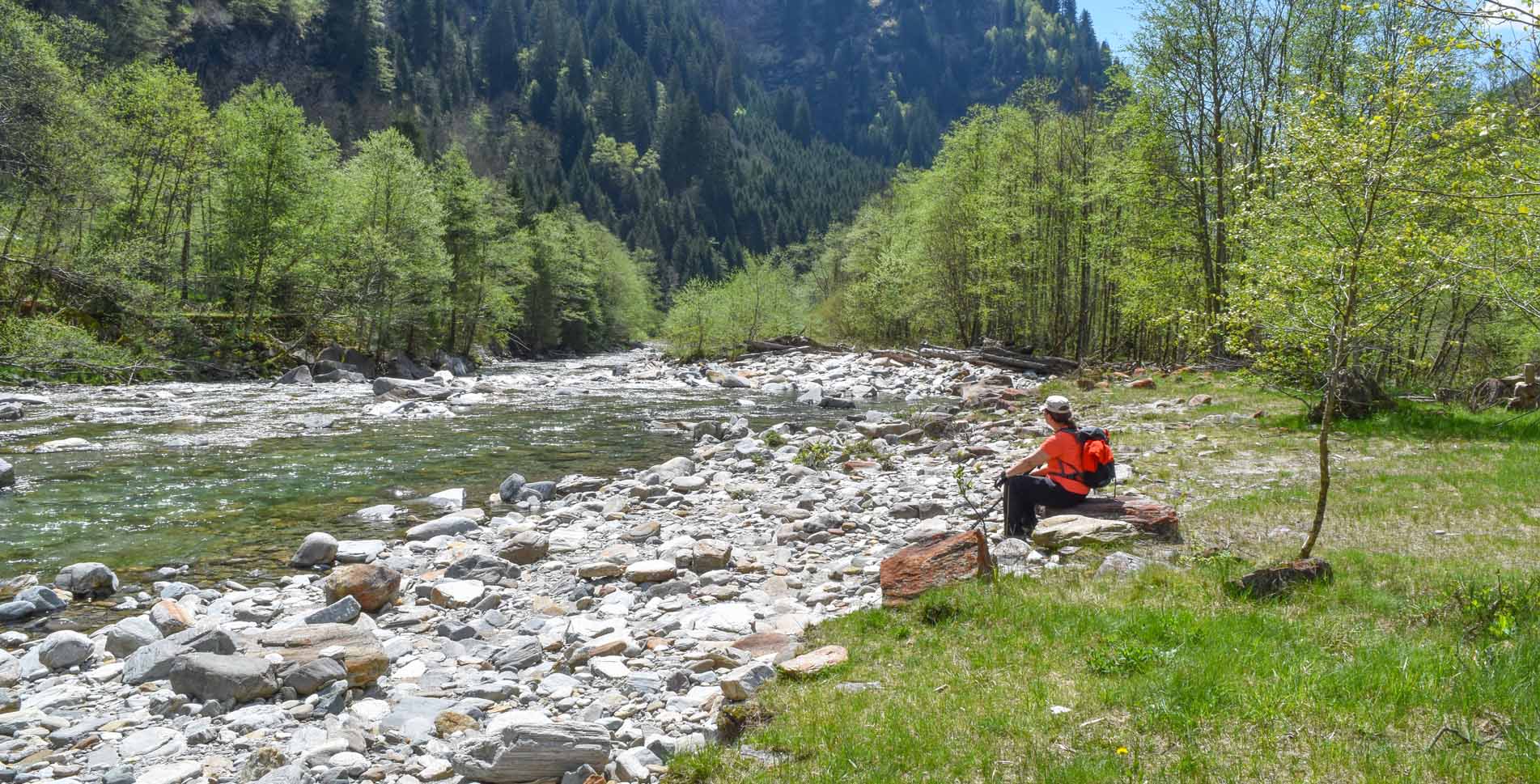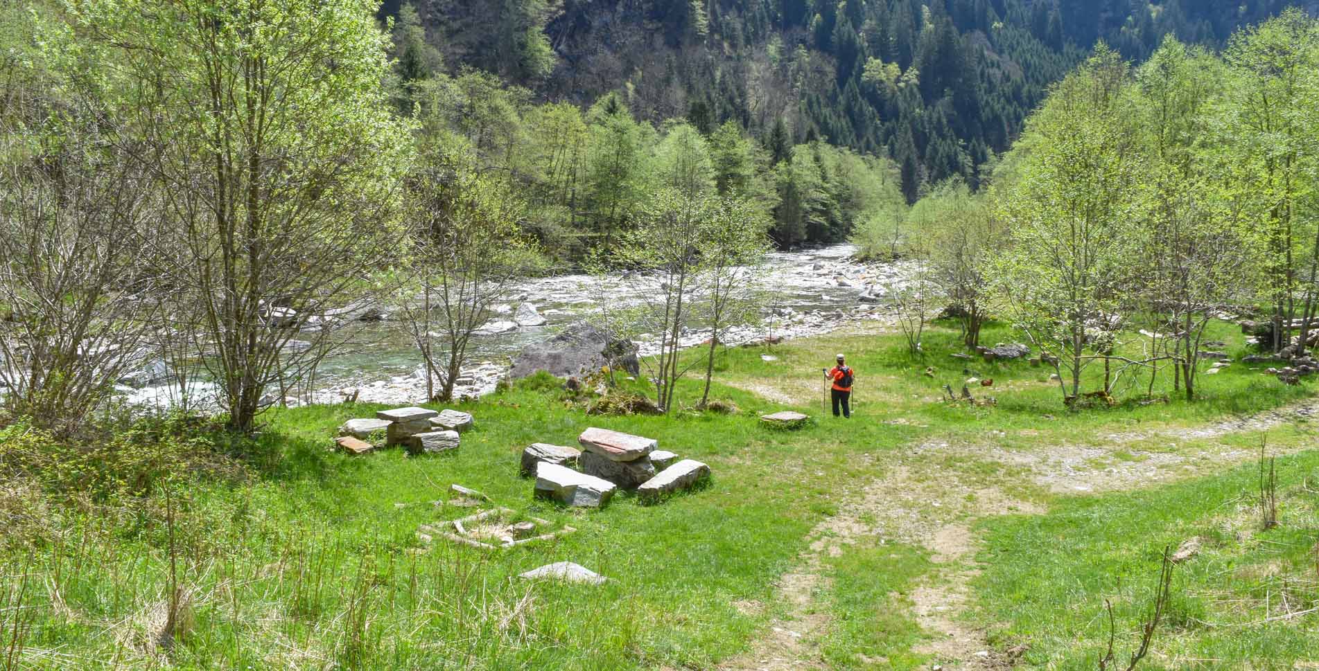 Der Weg führt zum Fluss und über die Brücke, wo man nach links abbiegt und dem Flusslauf folgt. Nach wenigen Minuten ist ein wunderschöner Picknickplatz mit einfachen Tischen und Hockern erreicht. Ein herrlicher Platz, direkt am Wildwasserfluss und im Auengebiet. Breite Kiesbänke, eine kleine bewaldete Aueninsel – wild und idyllisch. Die Calancasca entspringt südlich des Zapporthorns und am Pizzo de Stabi. Nach 31 Kilometern mündet der Wildwasserfluss bei Roveredo in die Moesa.