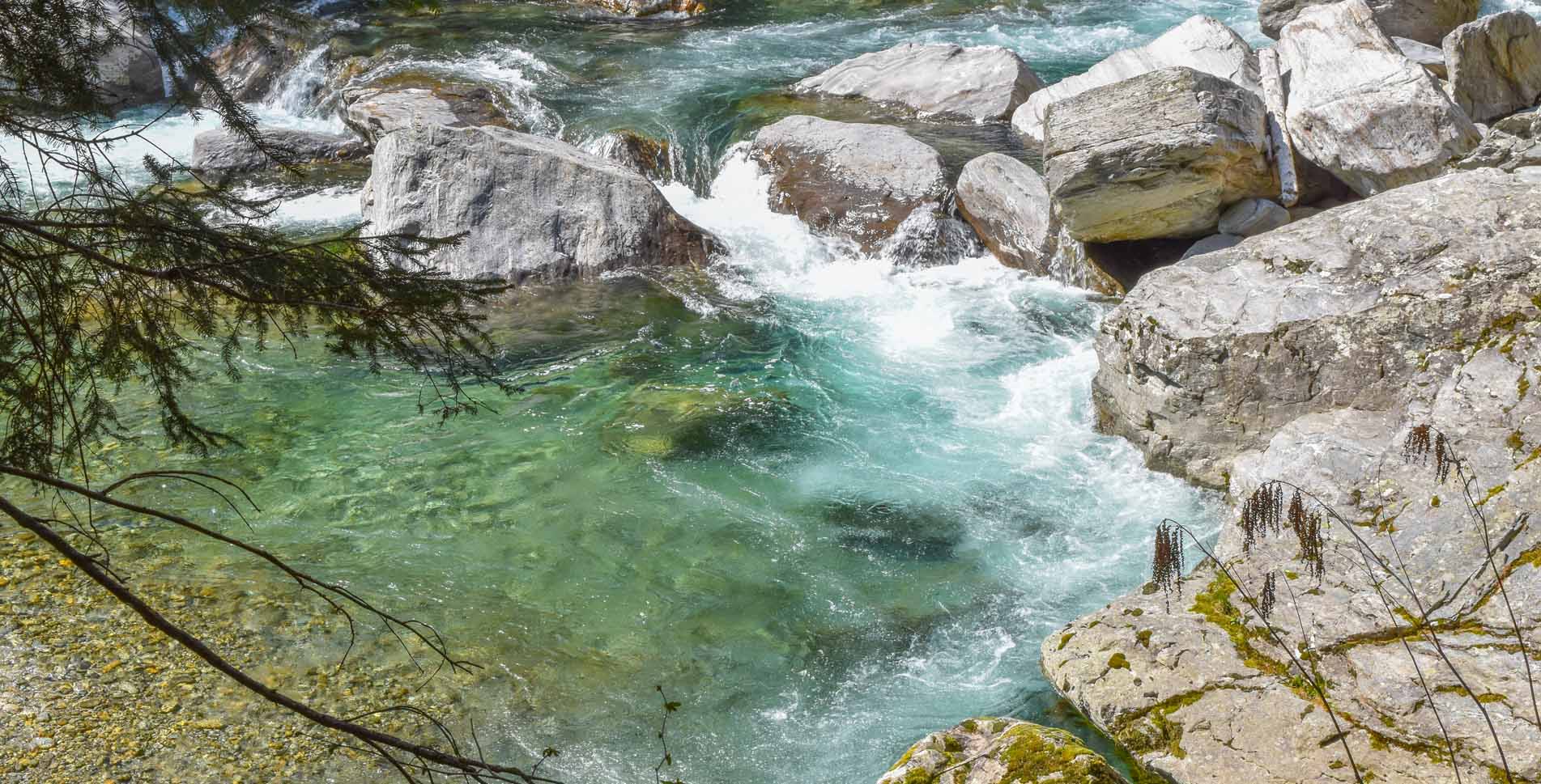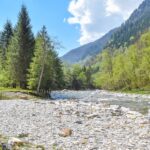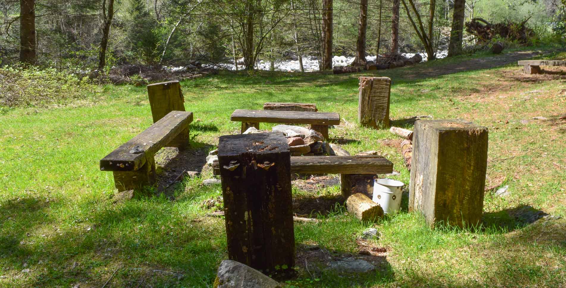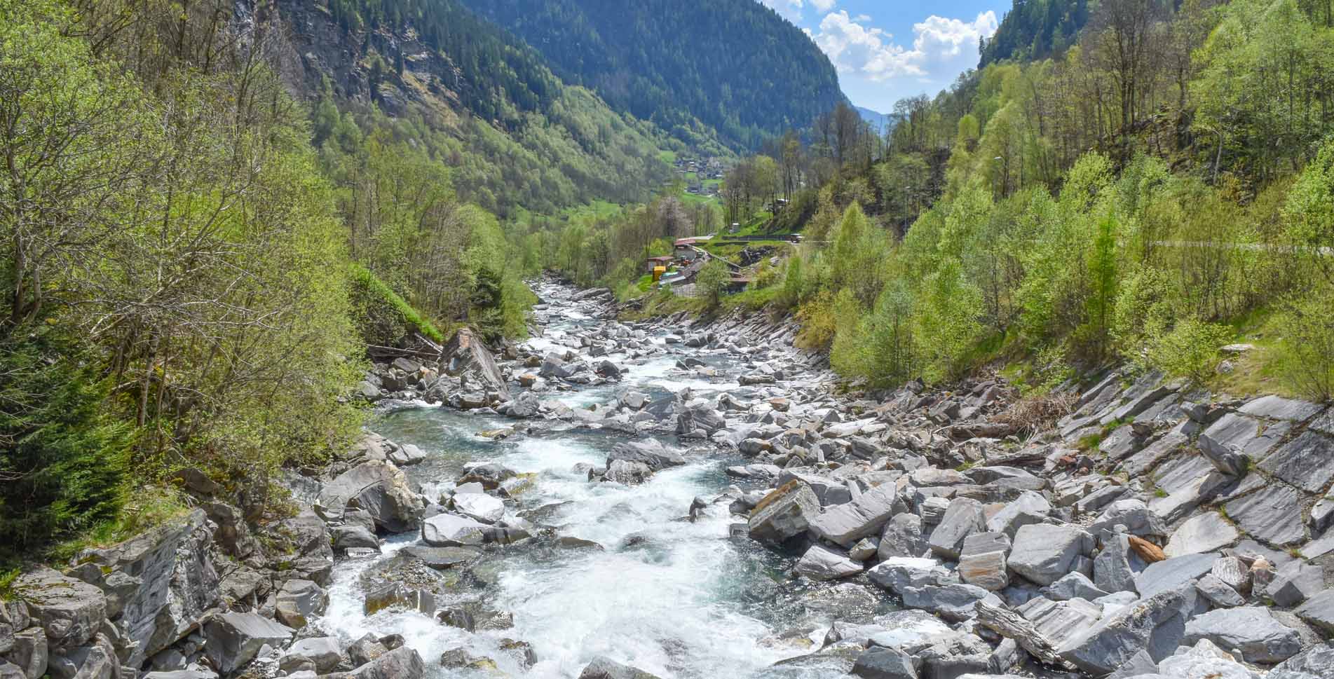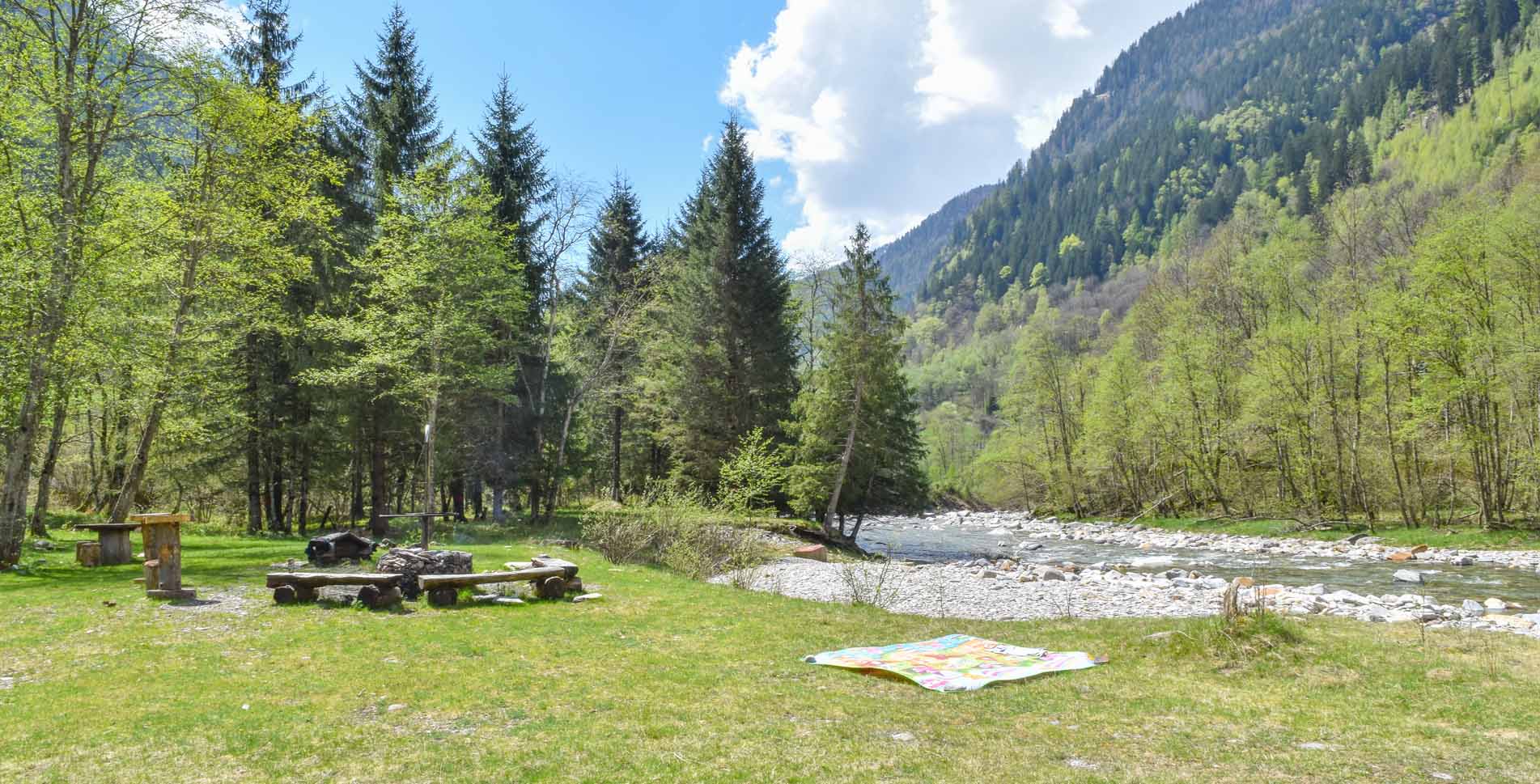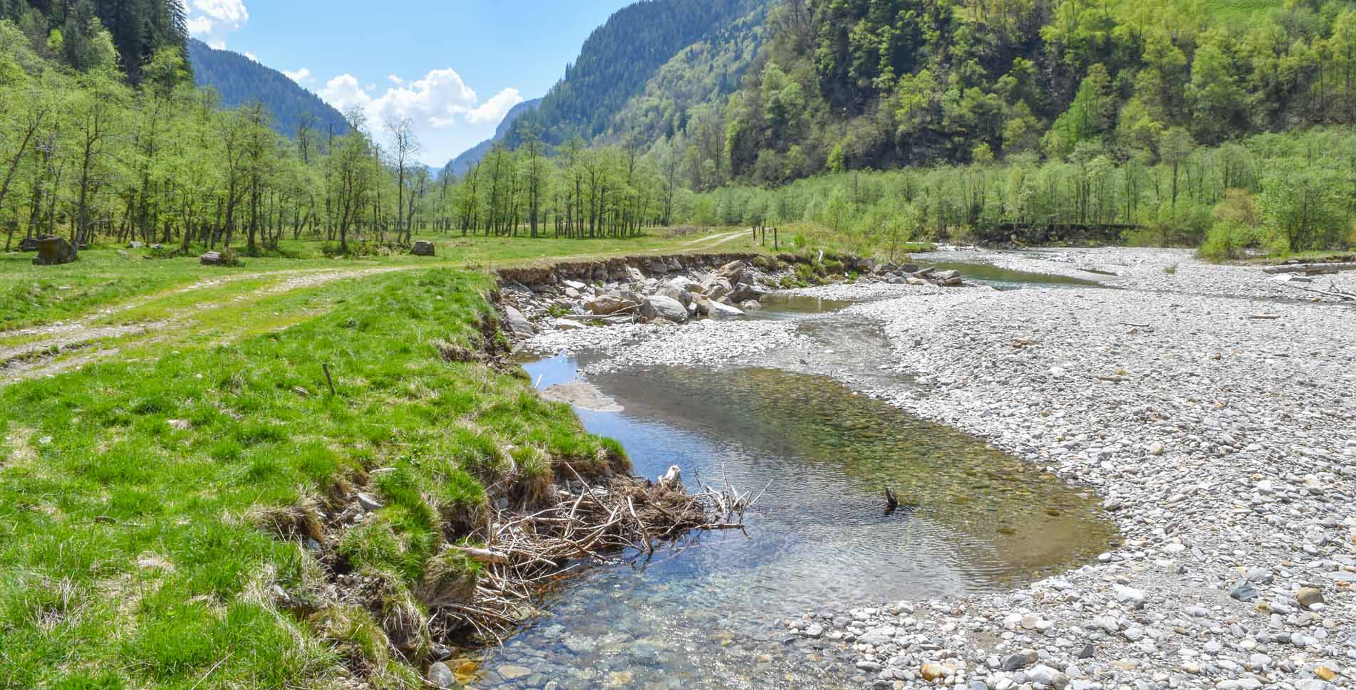 Der Weg führt zum Fluss und über die Brücke, wo man nach links abbiegt und dem Flusslauf folgt. Nach wenigen Minuten ist ein wunderschöner Picknickplatz mit einfachen Tischen und Hockern erreicht. Ein herrlicher Platz, direkt am Wildwasserfluss und im Auengebiet. Breite Kiesbänke, eine kleine bewaldete Aueninsel – wild und idyllisch. Die Calancasca entspringt südlich des Zapporthorns und am Pizzo de Stabi. Nach 31 Kilometern mündet der Wildwasserfluss bei Roveredo in die Moesa.