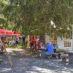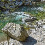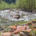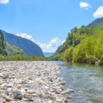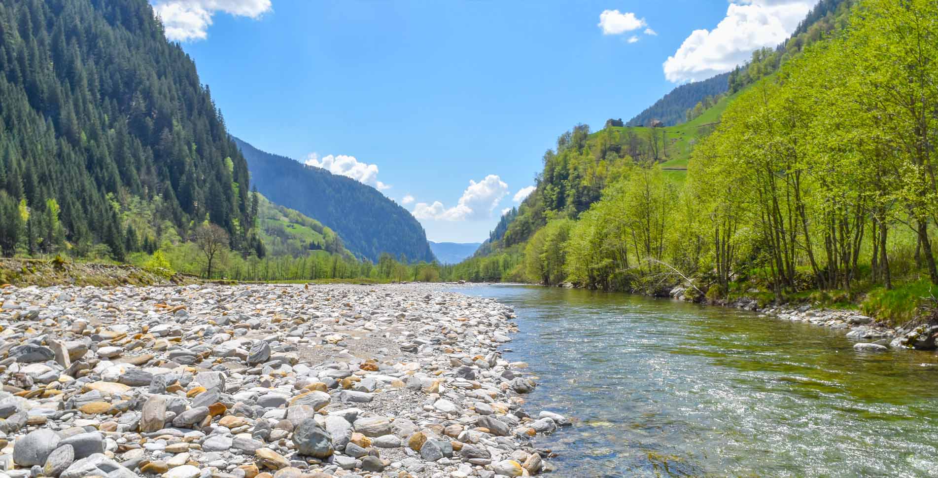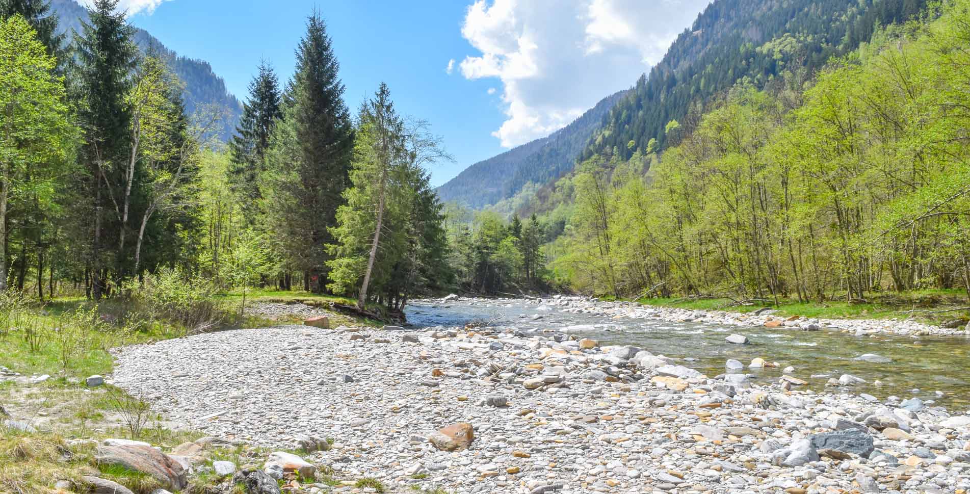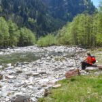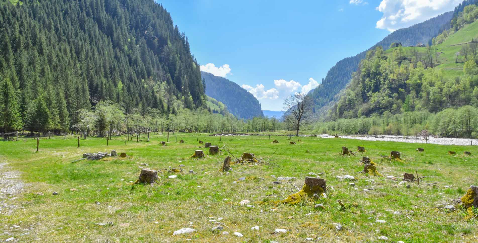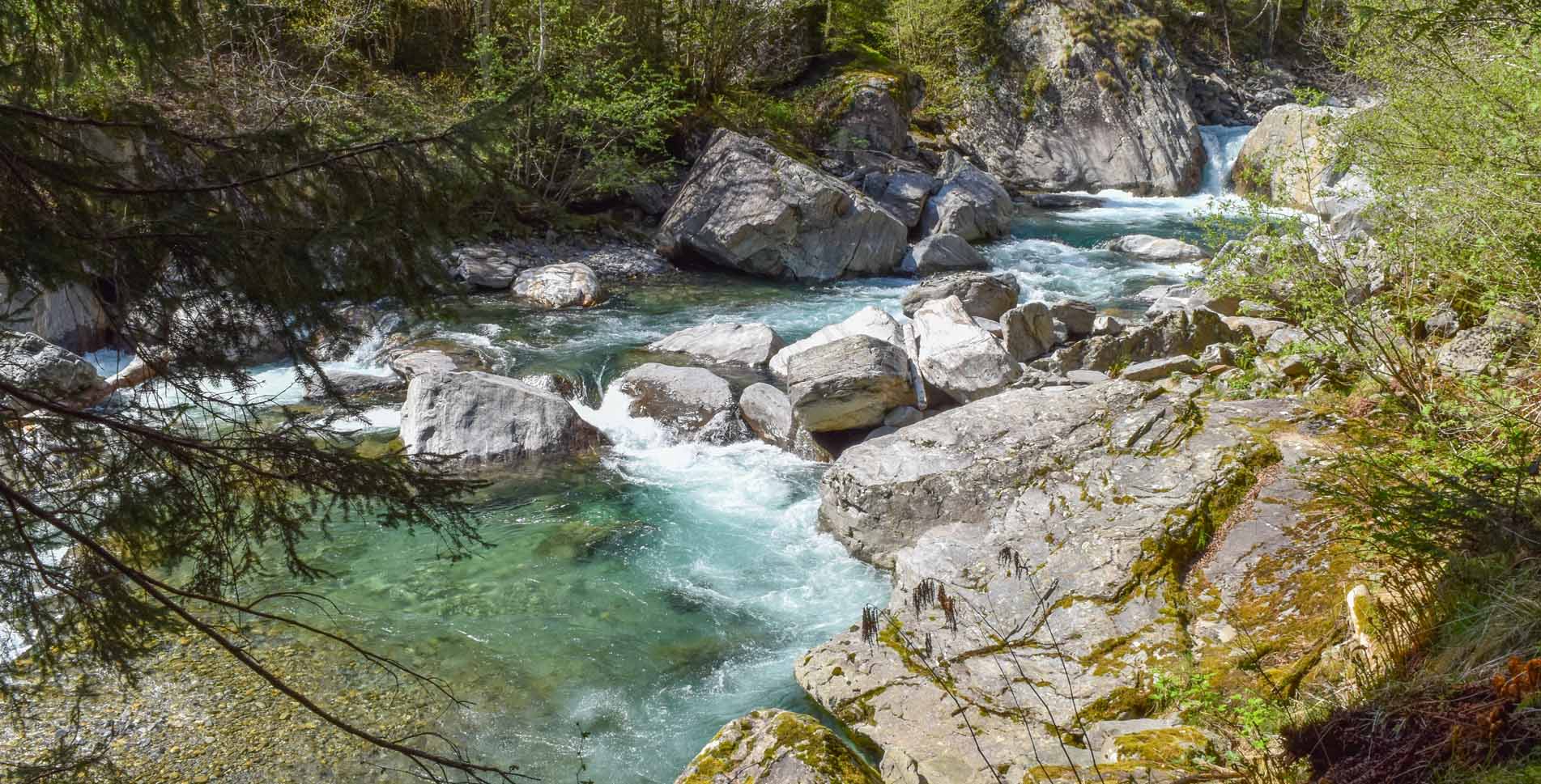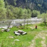 Der Weg führt zum Fluss und über die Brücke, wo man nach links abbiegt und dem Flusslauf folgt. Nach wenigen Minuten ist ein wunderschöner Picknickplatz mit einfachen Tischen und Hockern erreicht. Ein herrlicher Platz, direkt am Wildwasserfluss und im Auengebiet. Breite Kiesbänke, eine kleine bewaldete Aueninsel – wild und idyllisch. Die Calancasca entspringt südlich des Zapporthorns und am Pizzo de Stabi. Nach 31 Kilometern mündet der Wildwasserfluss bei Roveredo in die Moesa.