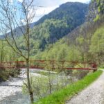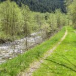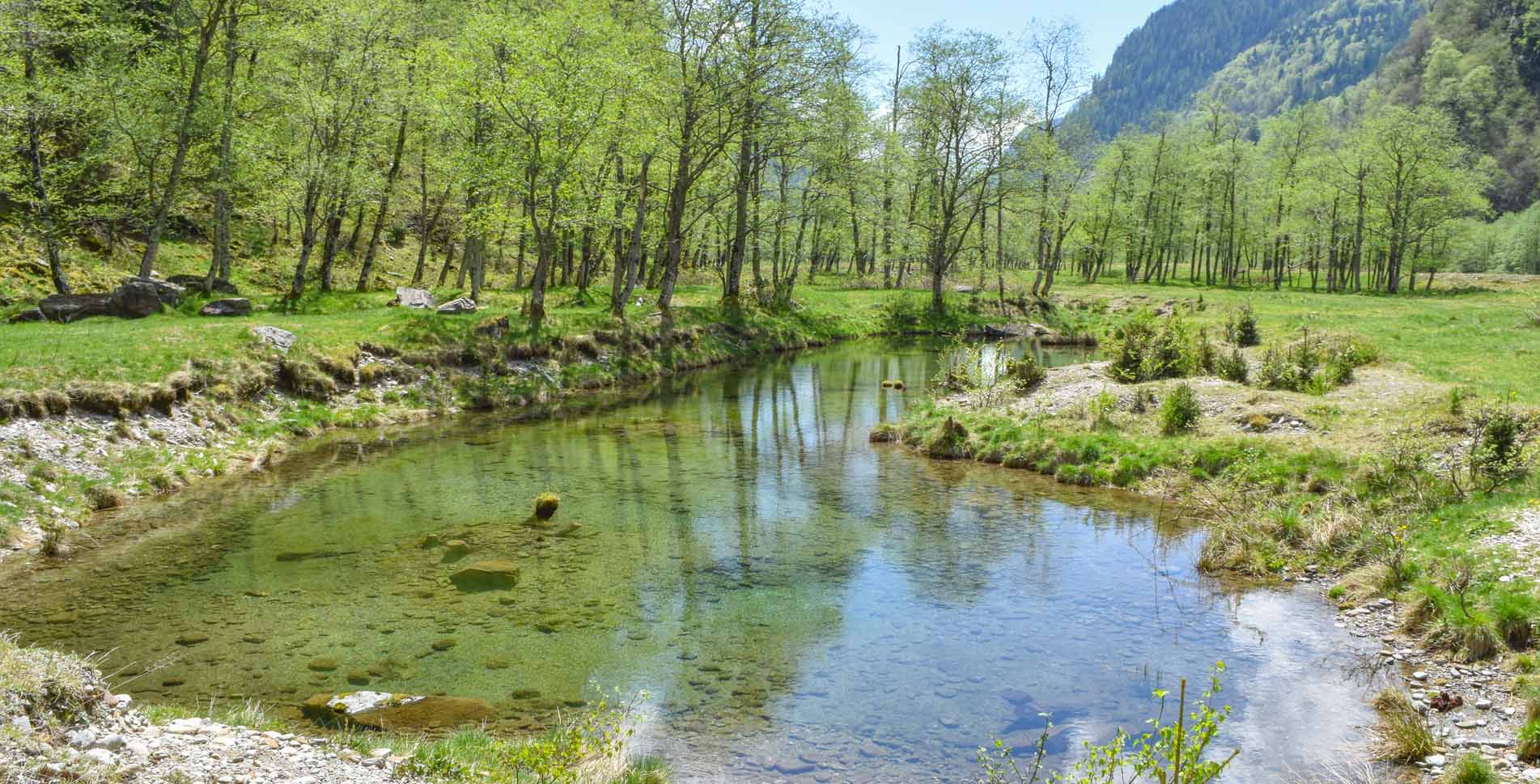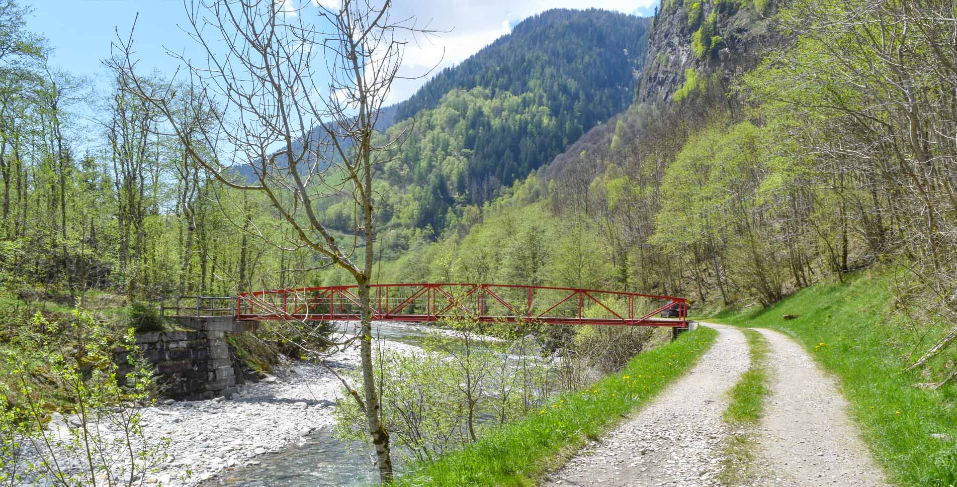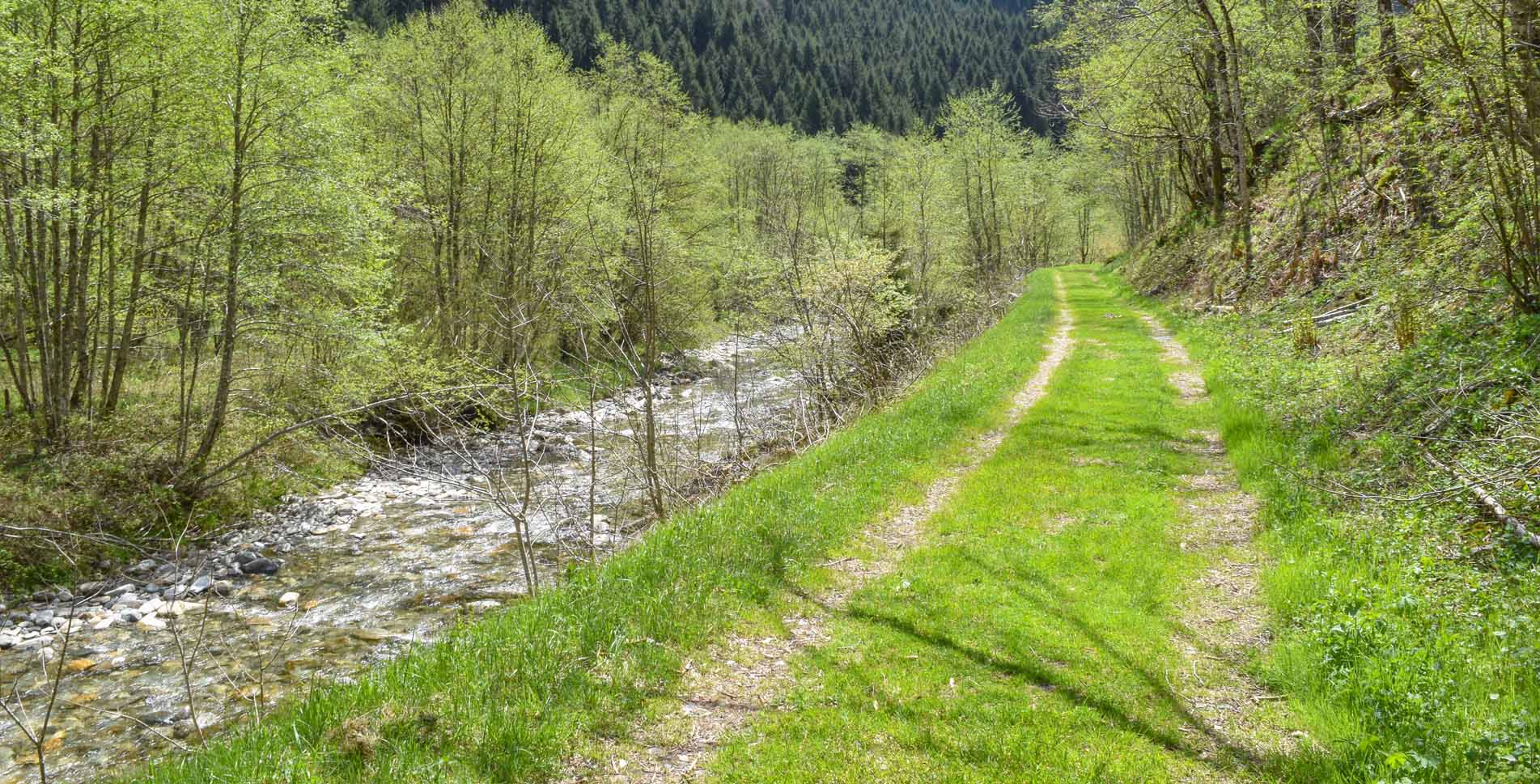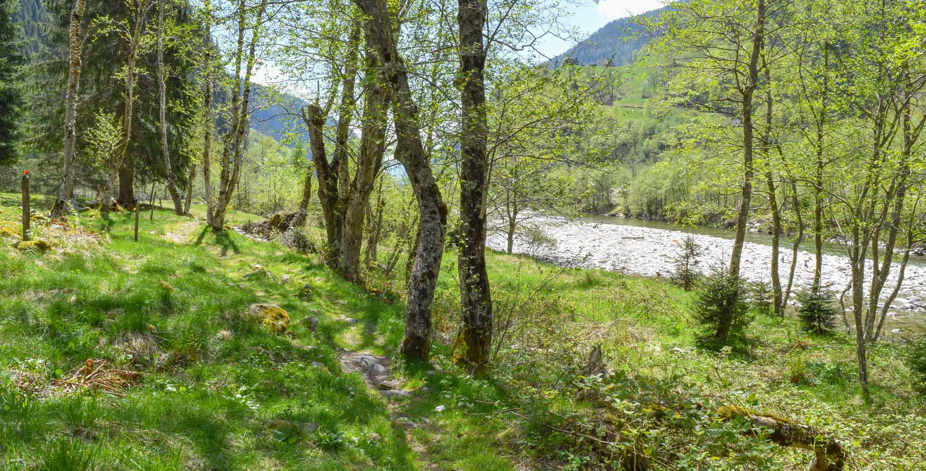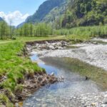 Weiter am Flussufer entlang, dann über die rote Brücke und der Wanderweg wird noch schöner. Auf schmalen Pfaden folgt man dem Flussufer, je nach Wasserstand, mit breiten, langen Kiesstränden. Dann mündet der Pfad auf einen breiten Weg, der durch die ausgedehnte Hochebene der Aue Pian di Alne führt. Das grösste Auengebiet entlang der Calancasa und ein kleines Paradies mit lichtem Auenwald, kleinen Wasserläufen und Weihern. Ein wertvoller Lebensraum für zahlreiche Blumenarten, Schmetterlinge, Amphibien und Reptilien, Vögel und Fische.