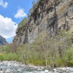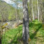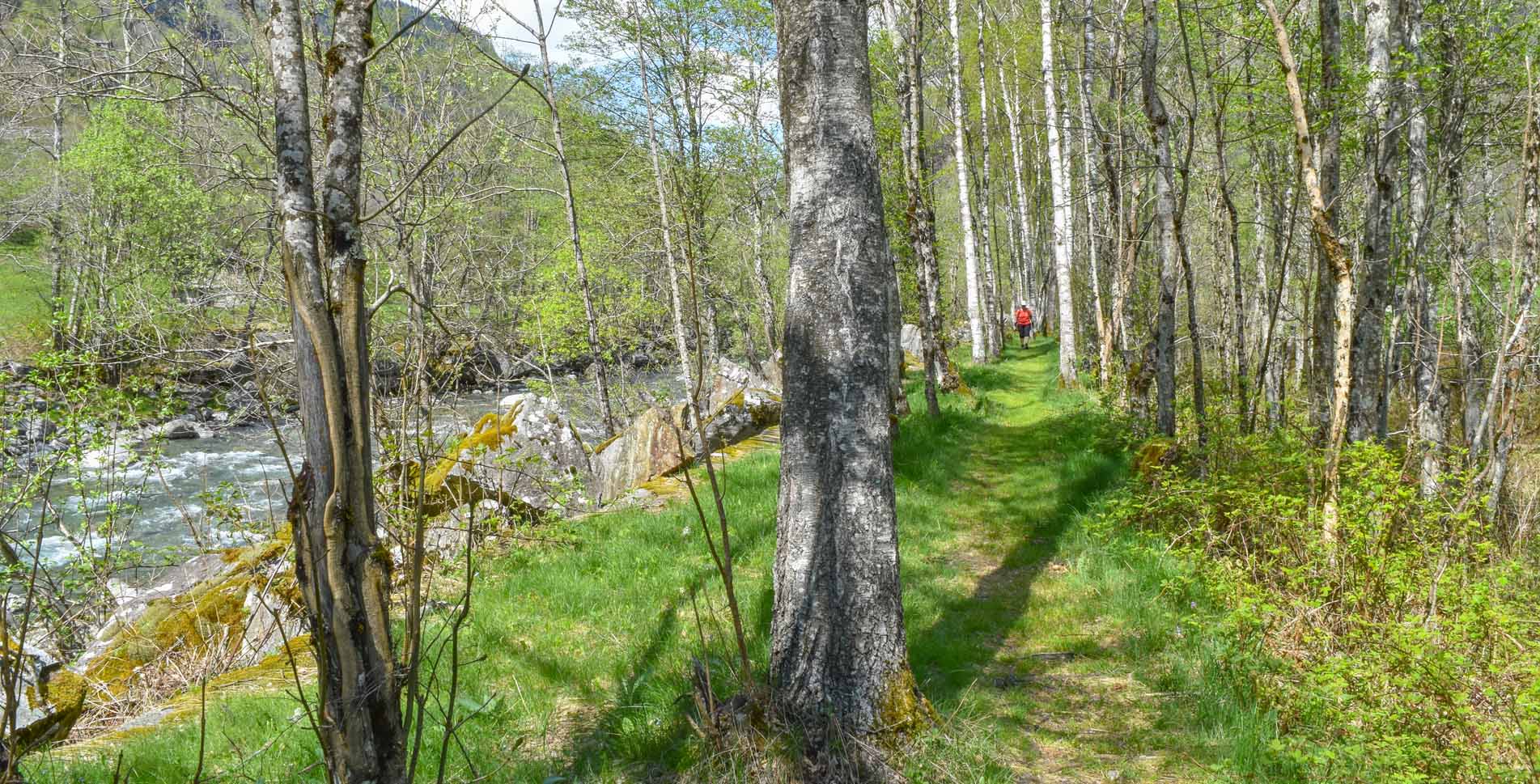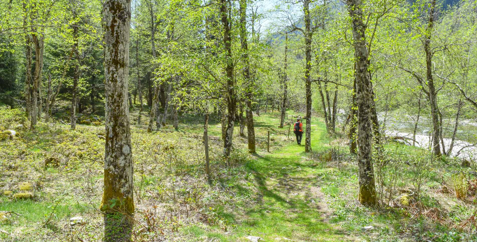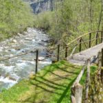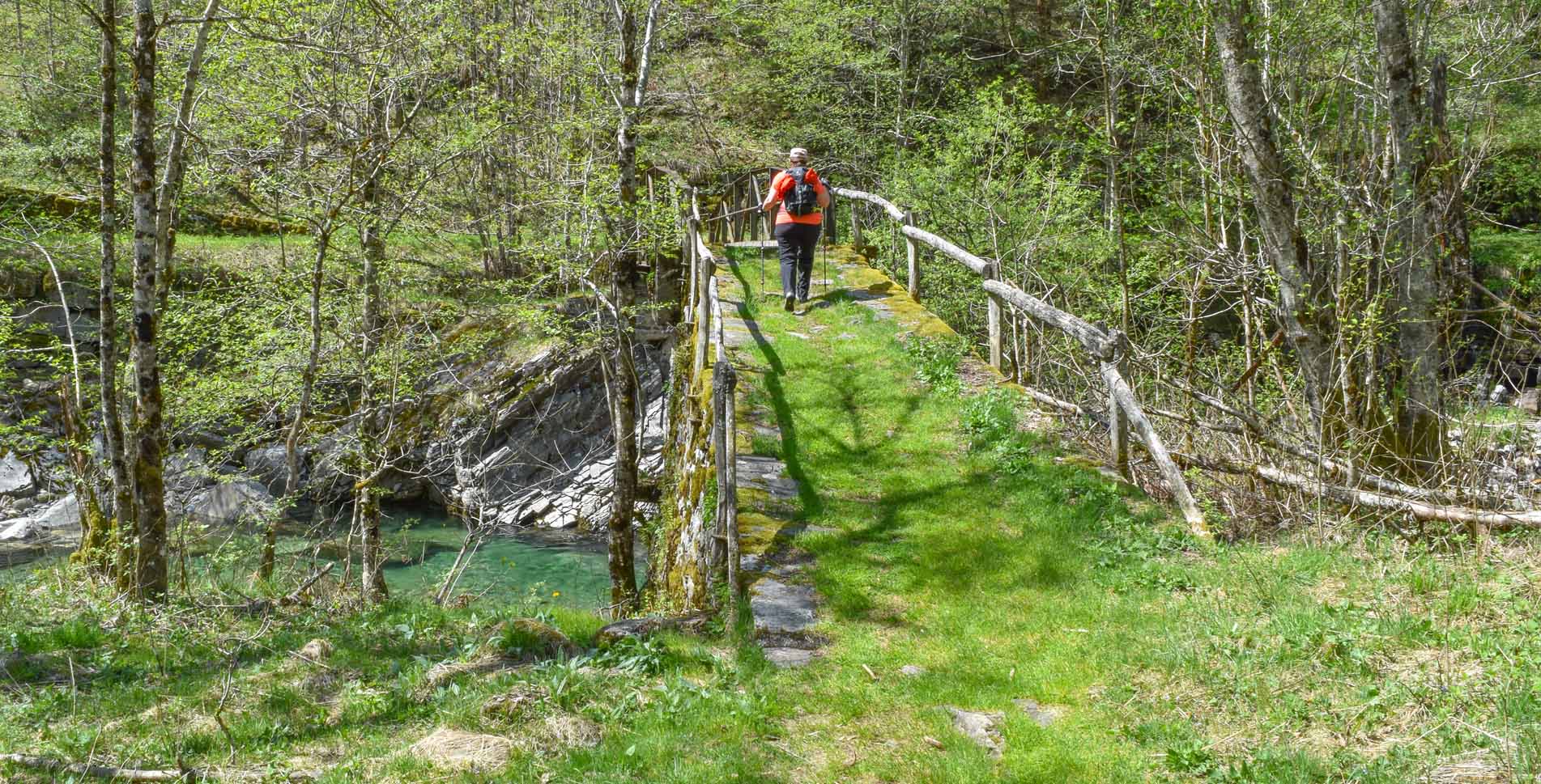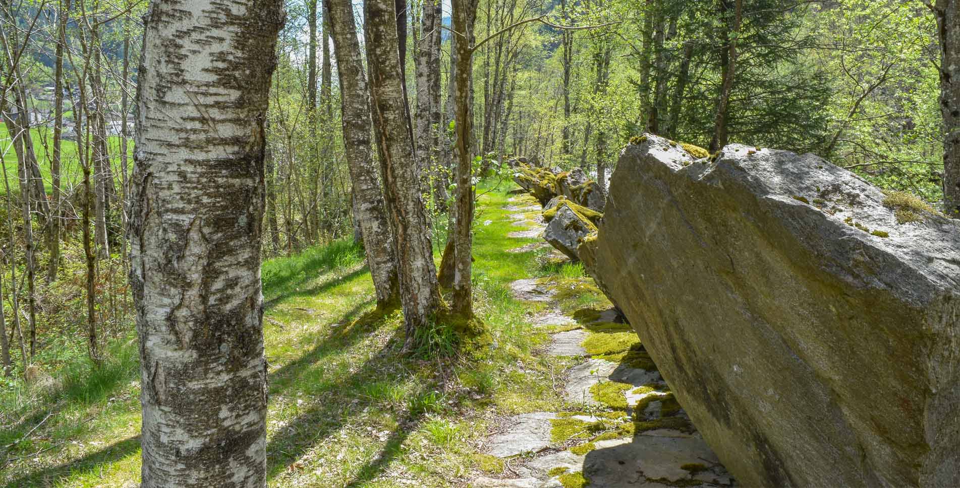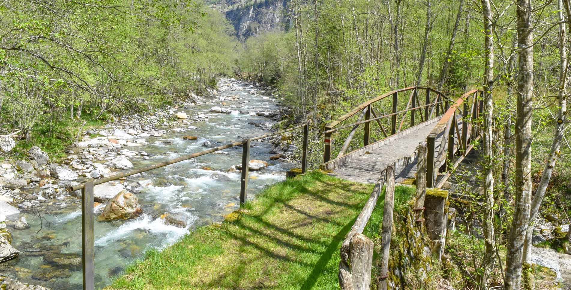 Die Route führt zum Weiler Cauco, wo man über die Brücke zur Bushaltestelle und dann der Strasse entlang talwärts weiter geht. In rund 5 Minuten ist die Bushaltestelle Bodio GR (Cauco) erreicht, wo man nach links abbiegt und wieder zur Calancasca gelangt. Bald geht man über die nächste Brücke auf die andere Flussseite. Zunächst auf dem breiten Wanderweg, dann immer direkt dem Flussufer folgend, auf schmalem Pfad weiter. Ein herrlicher Wegabschnitt, gesäumt mit Birken, grossen Steinplatten und dem Wildbach zur Rechten, wie eine Allee.