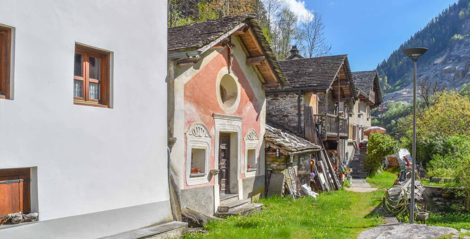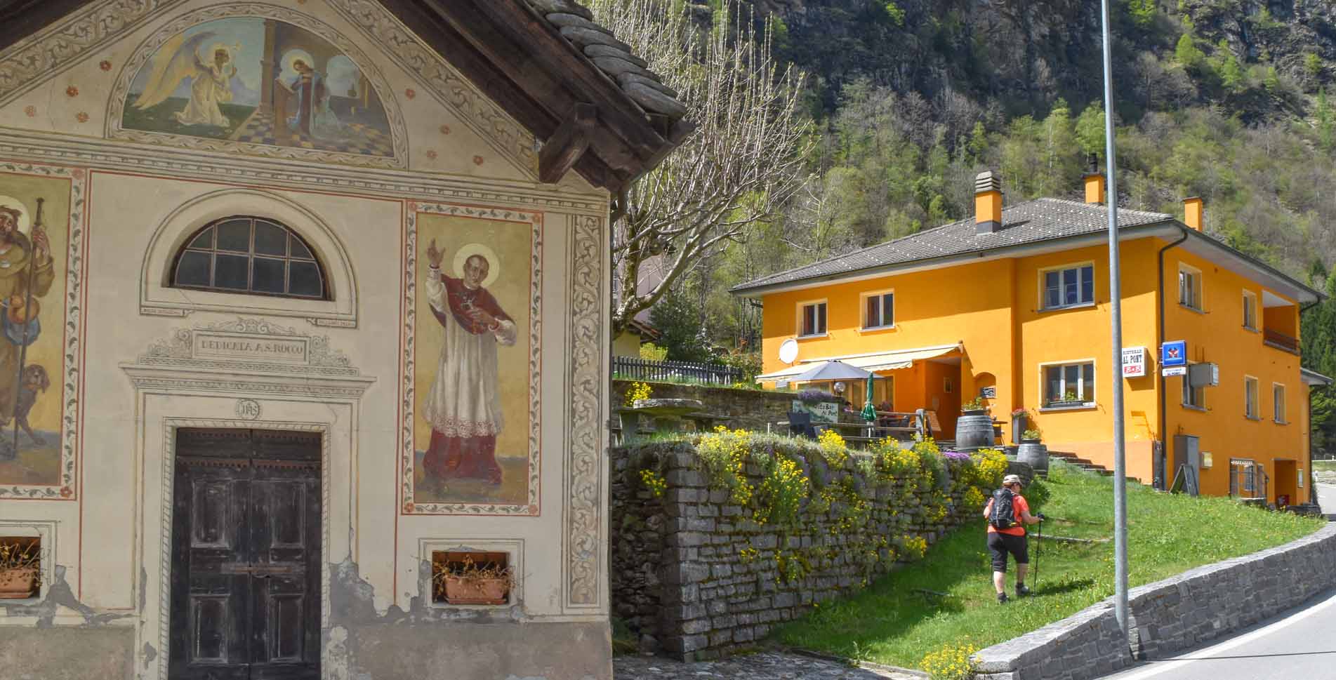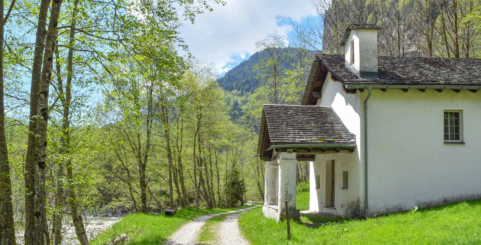 Nun wandert man am Flussufer entlang und kommt zu einer Kapelle. Hier könnte man nach Sta. Domenica abbiegen. Besonders sehenswert ist dort die Pfarrkirche Santa Domenica mit Fresken von Francesco Antonio Giorgioli. Einer der bedeutendsten Barockkirchen Graubündens.