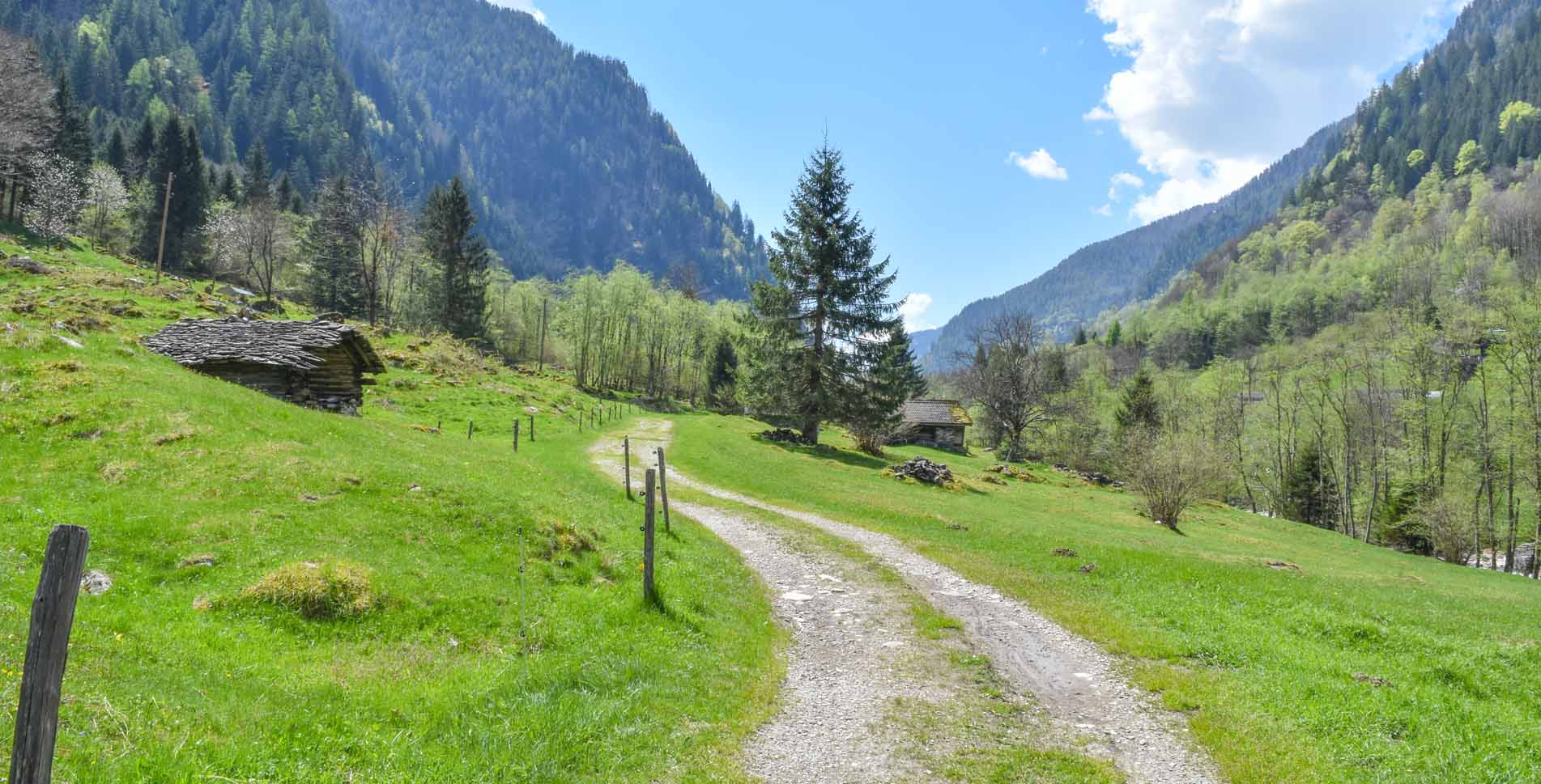 Die Route führt an den Fischweihern «Pesca sportiva Augio» (+41 91 828 11 35) vorbei. Hier gibt es ein schönes Beizli. Kurz danach biegt man links ab und geht über die Brücke. Auf dem breiten Kiesweg wandert man fast eben durch das hier noch breite Tal und erreicht eine schöne Feuerstelle, die direkt an der Calancasca gelegen ist. Nun folgt man dem breiten Weg, bis man bei einer Holzbank nach rechts abbiegt und an einer Kunstinstallation in Form eines Holzwürfels vorbei geht. Achtung: Der Abzweiger ist hier nur spärlich an einem Baum signalisiert!