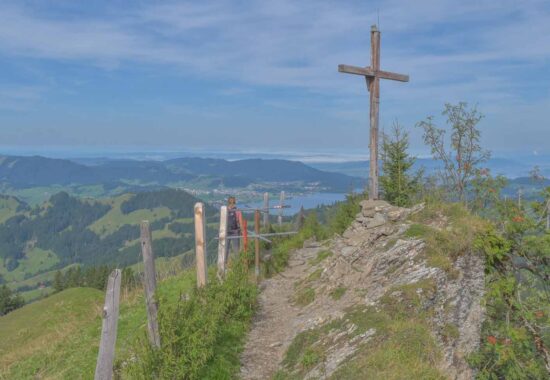 Beim Sihlseeufer angekommen, biegt man nach links ab und folgt dem pinken Wegweiser Schützenried-Rundweg Nr. 560 in Richtung Unteriberg. Der Weg führt am Ufer des Sihlsees mit schönen Schilfbeständen vorbei. Nach rund 15 Minuten erreicht man einen Picknickplatz mit Feuerstelle, Tischen und Sitzbänken. Dann geht’s ein kurzes Stück auf dem Trottoir an der Strasse entlang und über eine Autobrücke, die die Sihl überquert. Nach der Brücke folgt eine Weggablung, wo man dem Wegweiser in Richtung Unteriberg und Hübsch Blätz folgt. Nun geht es wieder auf dem Wanderweg, der zunächst parallel zur Strasse und wenig später nach rechts wieder ans Seeufer führt.