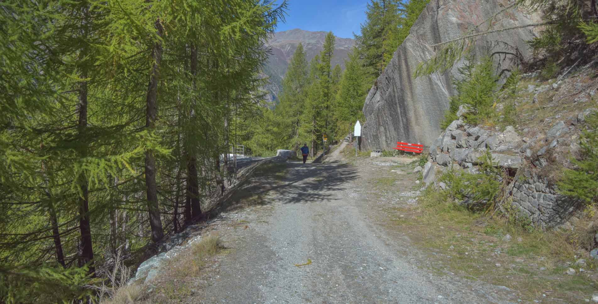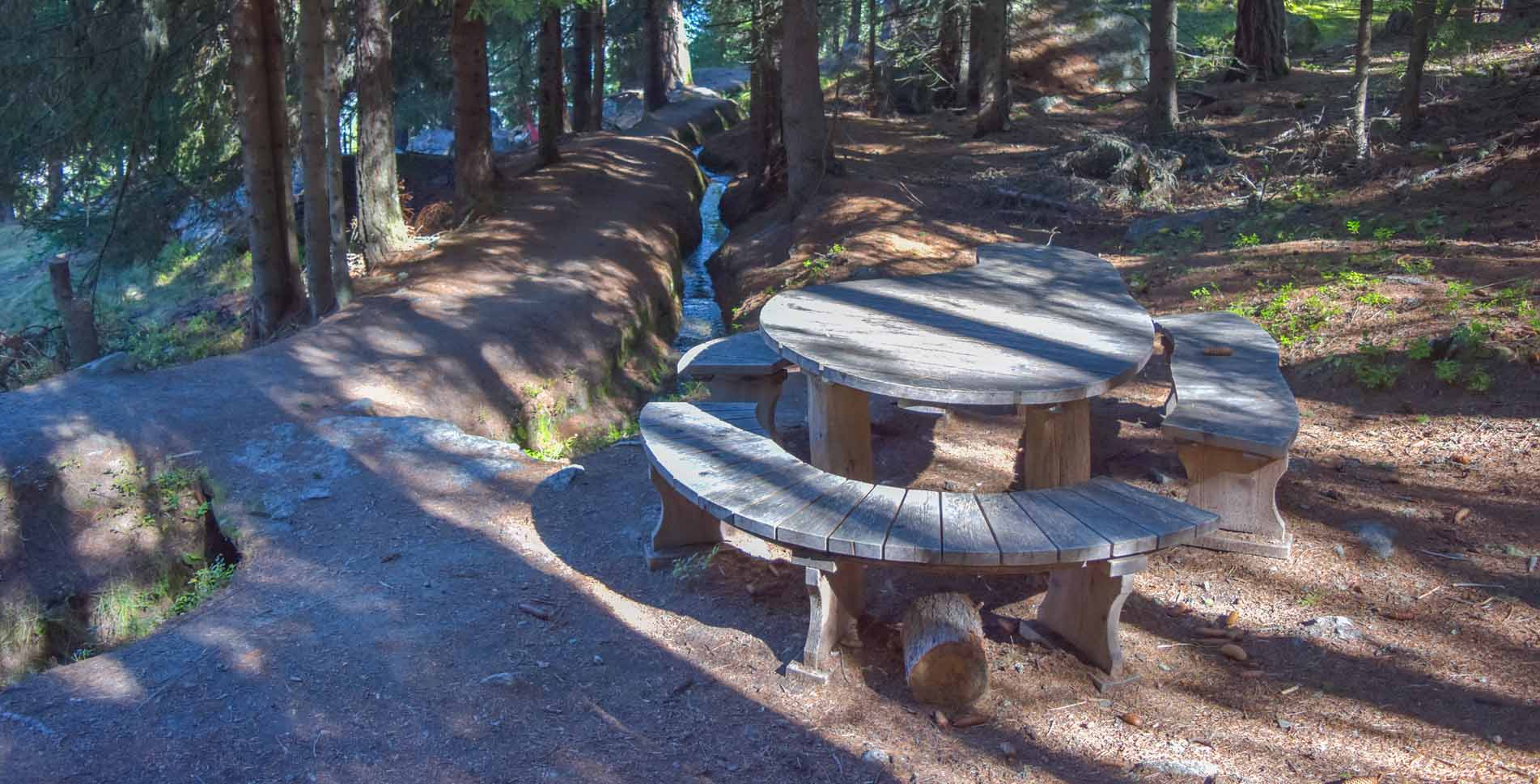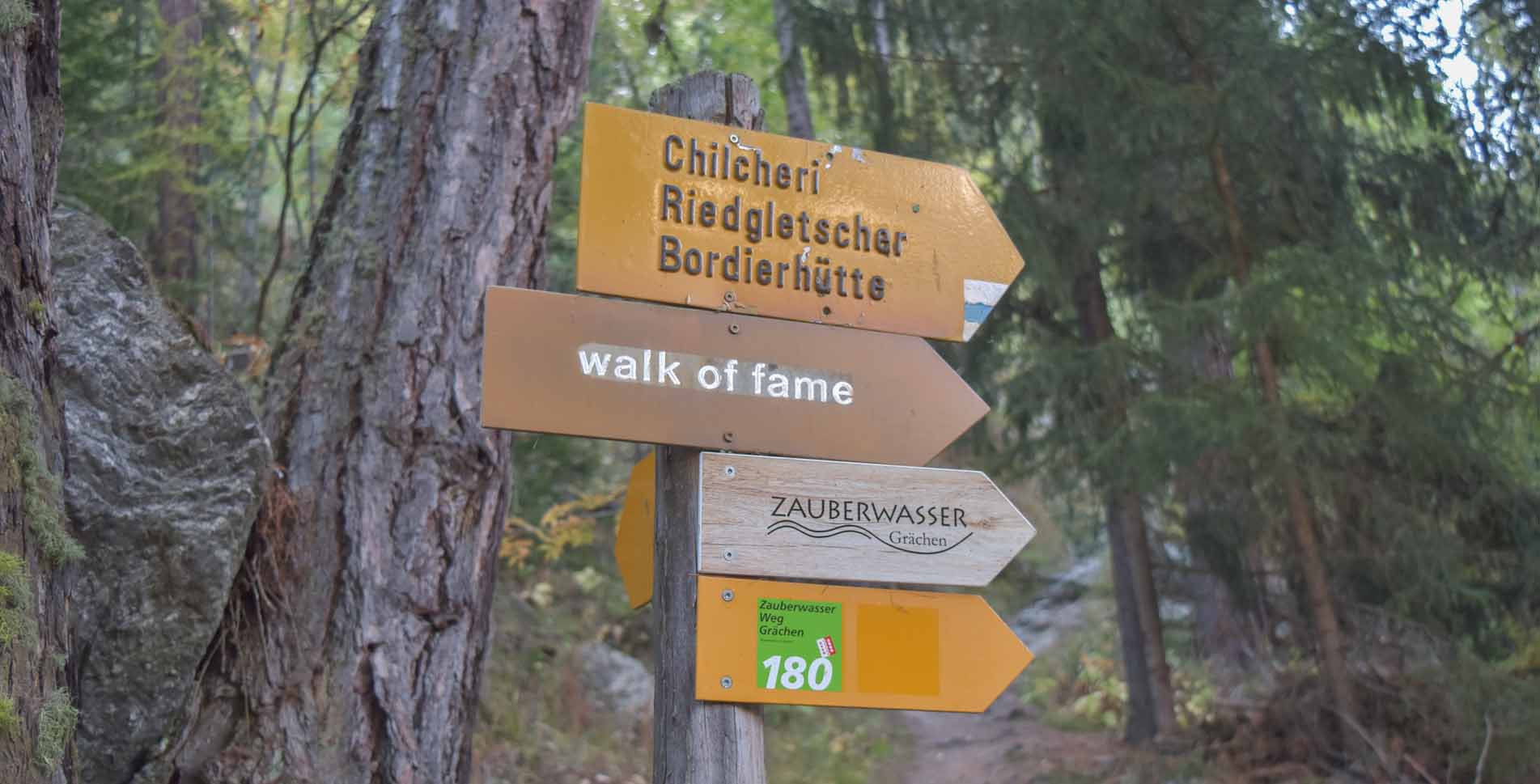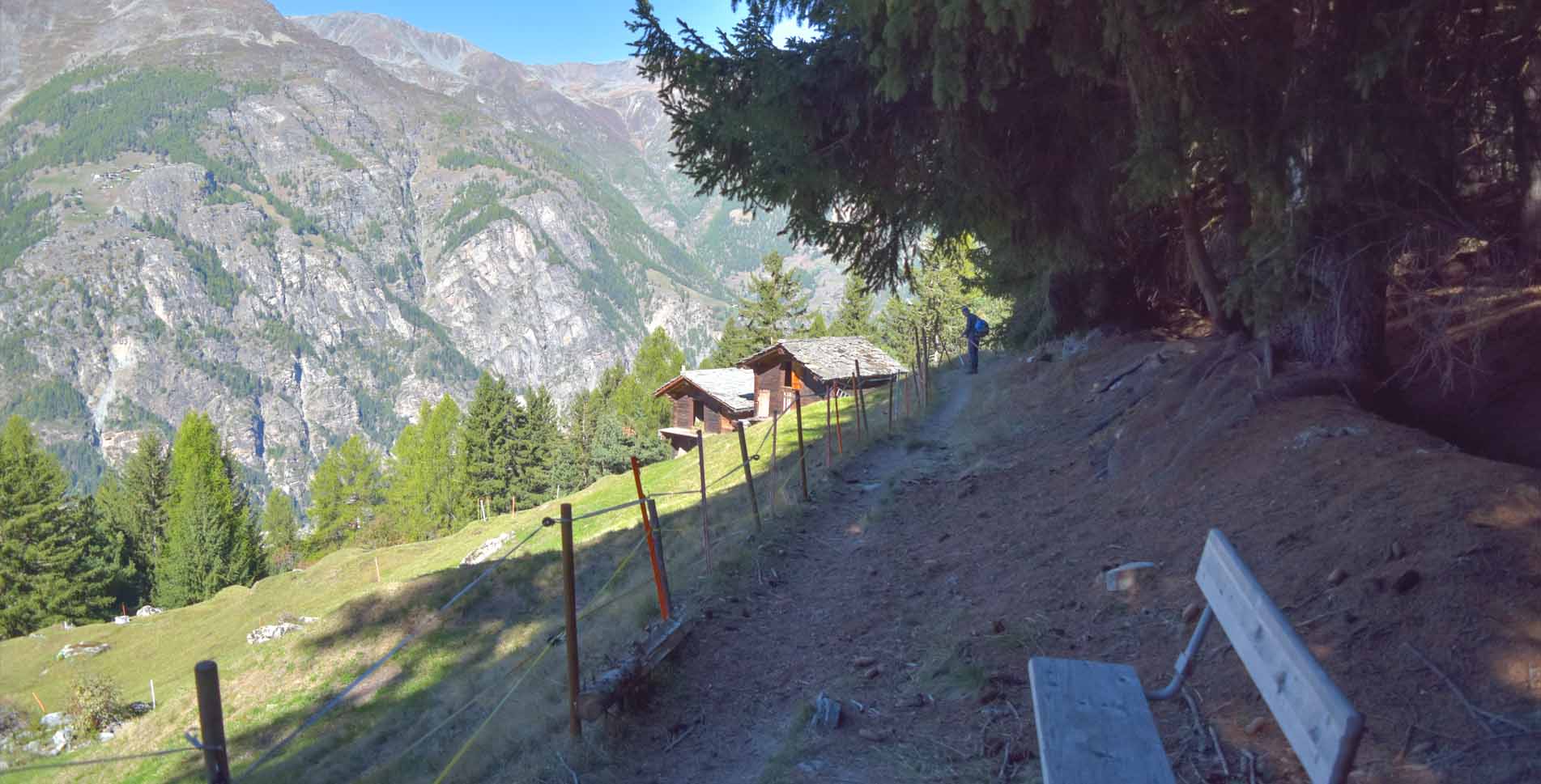 Wenige Minuten später erreicht man eine schöne Feuerstelle mit Tisch und Sitzbank. In einer Steinruine befindet sich die Grillstelle, auch bereitgestelltes Holz gibt es. Von dort geht es am Waldrand entlang, mit Blick auf die Bergriesen. Wenige Schritte nach dem kommenden Wegweiser verlässt man den Zauberwasser-Weg und folgt der Wasserleite Riederi geradeaus. Eine Hinweistafel mahnt auch hier auf dem Weg von erhöhter Steinschlaggefahr. Beim Wegweiser Riederi ist man beim Riedbach und Wasserkraftwerk angekommen. Dem Wegweiser Grächen via Gasenried folgend, wandert man auf dem breiten Forstweg hinab. Nach ein paar Kurven lichtet sich der Wald etwas, und man sieht links den Riedgletscher weit oben. Den Eingang zur Wasserleite Drieri passierend, geht es ein kleines Stück weiter auf dem Forstweg hinab, dann ist man bei der Wasserleite Bineri angekommen. Von nun an folgt man der Bineri und der Route Swiss Tour Monte Rosa Nr. 27 in Richtung Heimine und Grächen.
