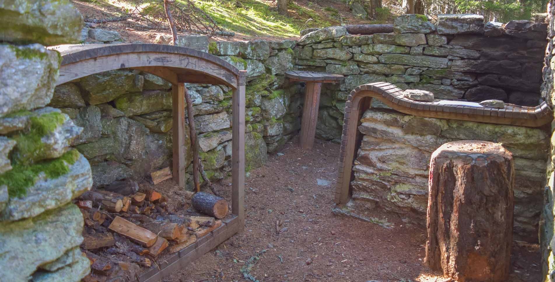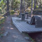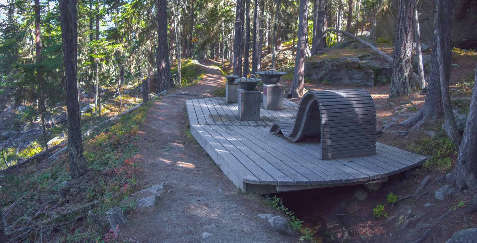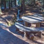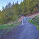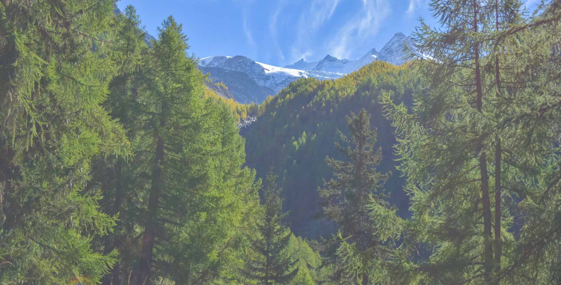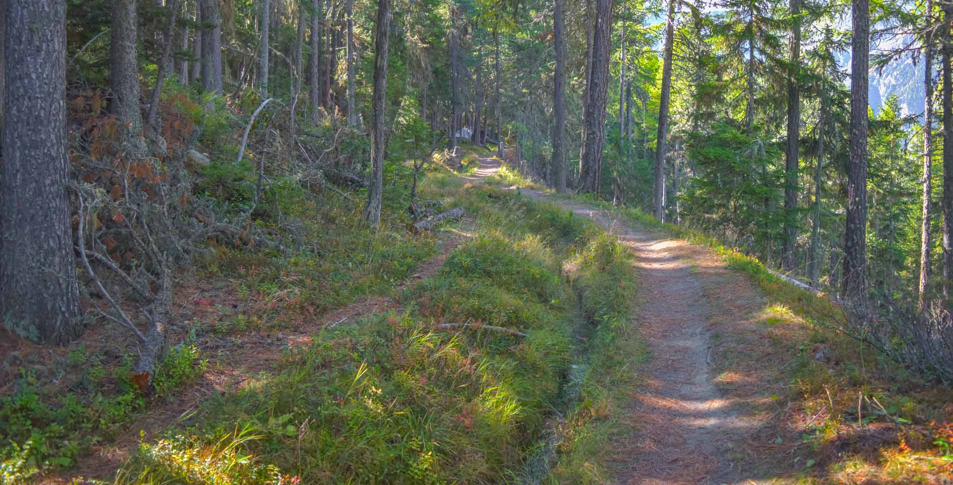 Wenige Minuten später erreicht man eine schöne Feuerstelle mit Tisch und Sitzbank. In einer Steinruine befindet sich die Grillstelle, auch bereitgestelltes Holz gibt es. Von dort geht es am Waldrand entlang, mit Blick auf die Bergriesen. Wenige Schritte nach dem kommenden Wegweiser verlässt man den Zauberwasser-Weg und folgt der Wasserleite Riederi geradeaus. Eine Hinweistafel mahnt auch hier auf dem Weg von erhöhter Steinschlaggefahr. Beim Wegweiser Riederi ist man beim Riedbach und Wasserkraftwerk angekommen. Dem Wegweiser Grächen via Gasenried folgend, wandert man auf dem breiten Forstweg hinab. Nach ein paar Kurven lichtet sich der Wald etwas, und man sieht links den Riedgletscher weit oben. Den Eingang zur Wasserleite Drieri passierend, geht es ein kleines Stück weiter auf dem Forstweg hinab, dann ist man bei der Wasserleite Bineri angekommen. Von nun an folgt man der Bineri und der Route Swiss Tour Monte Rosa Nr. 27 in Richtung Heimine und Grächen.