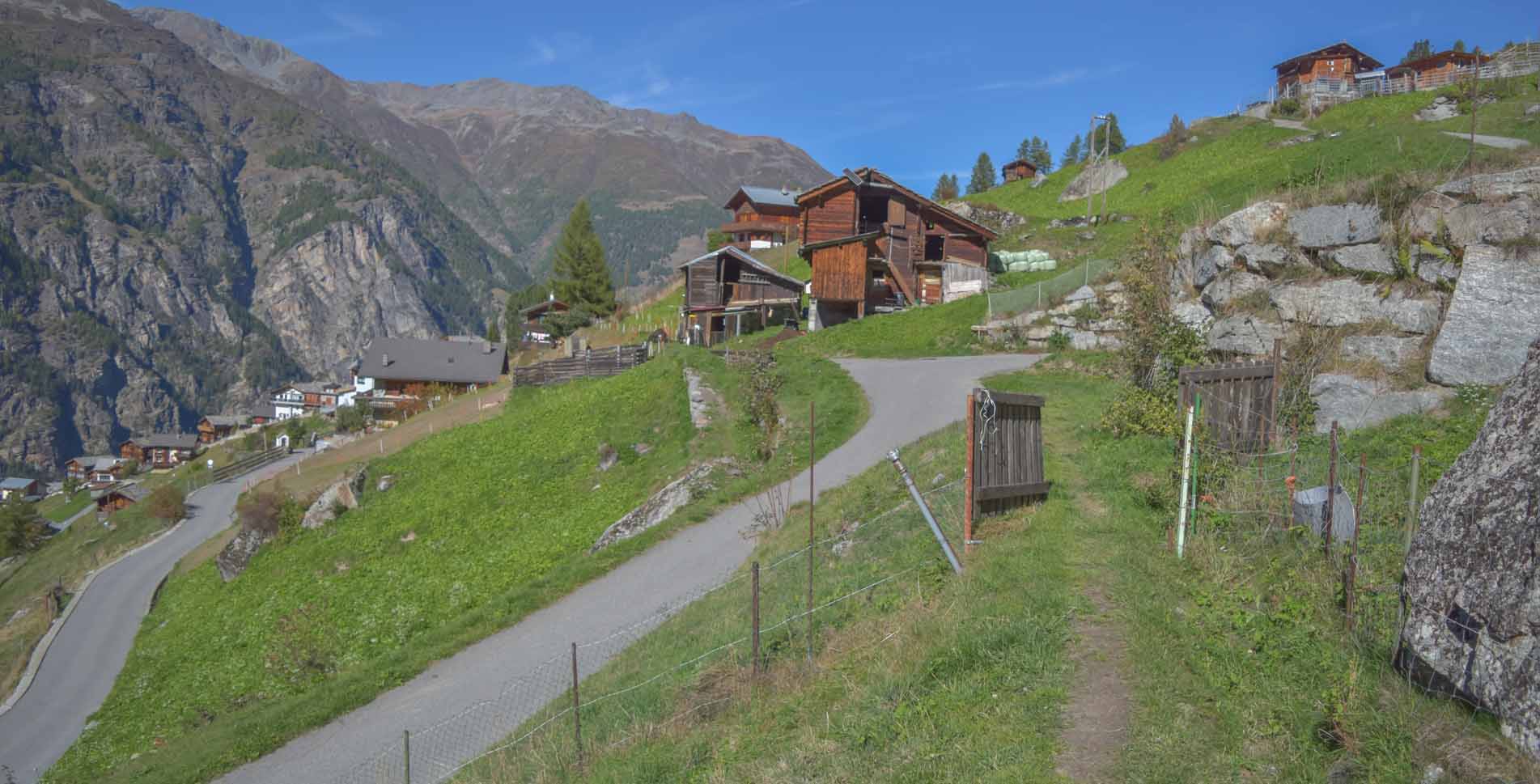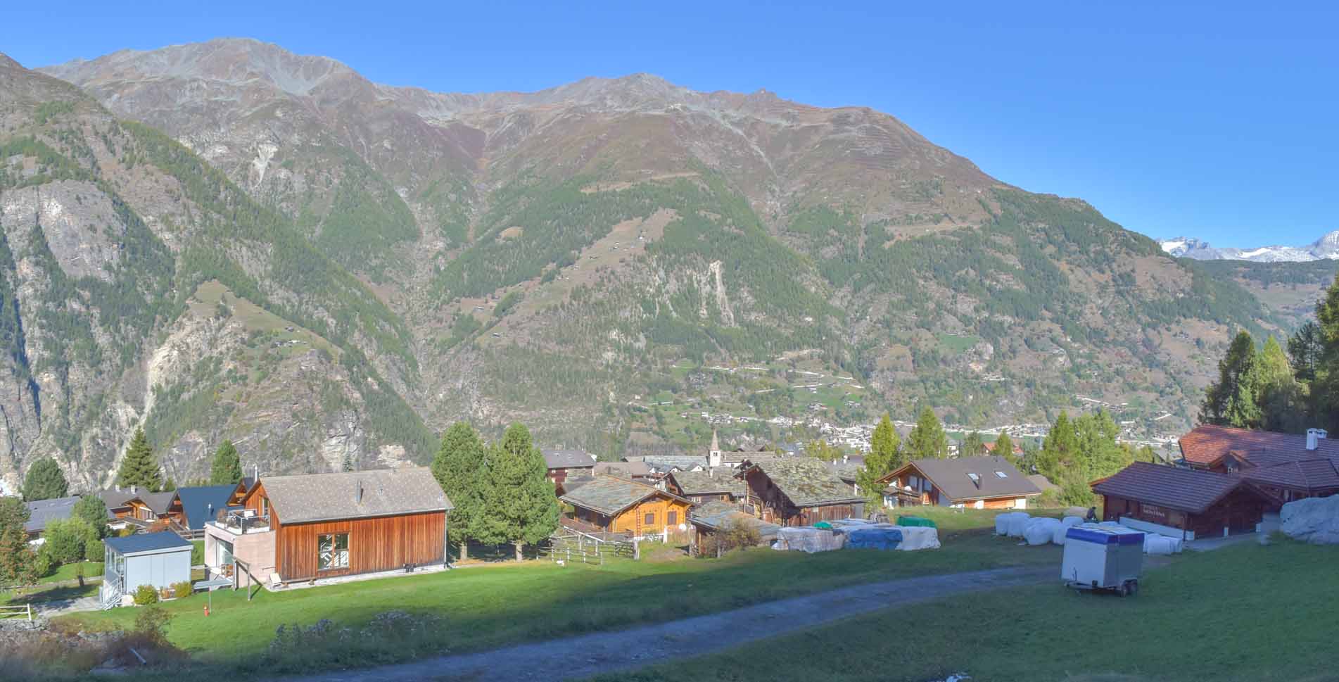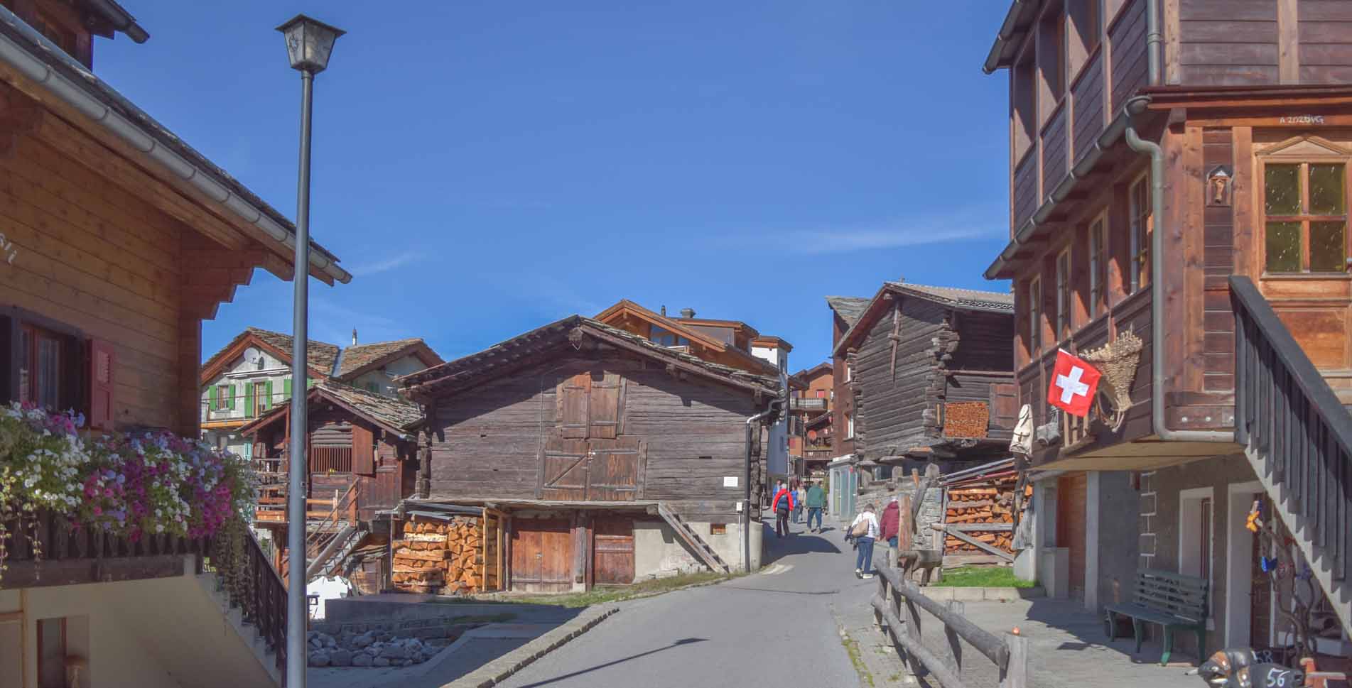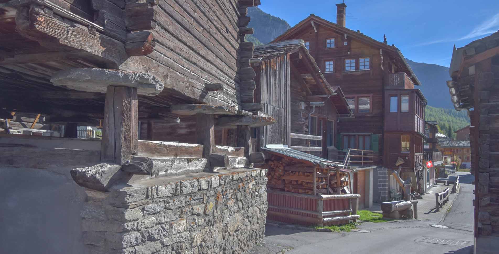 - Autofreie Sonnenterrasse Grächen mit historischen Gebäuden
