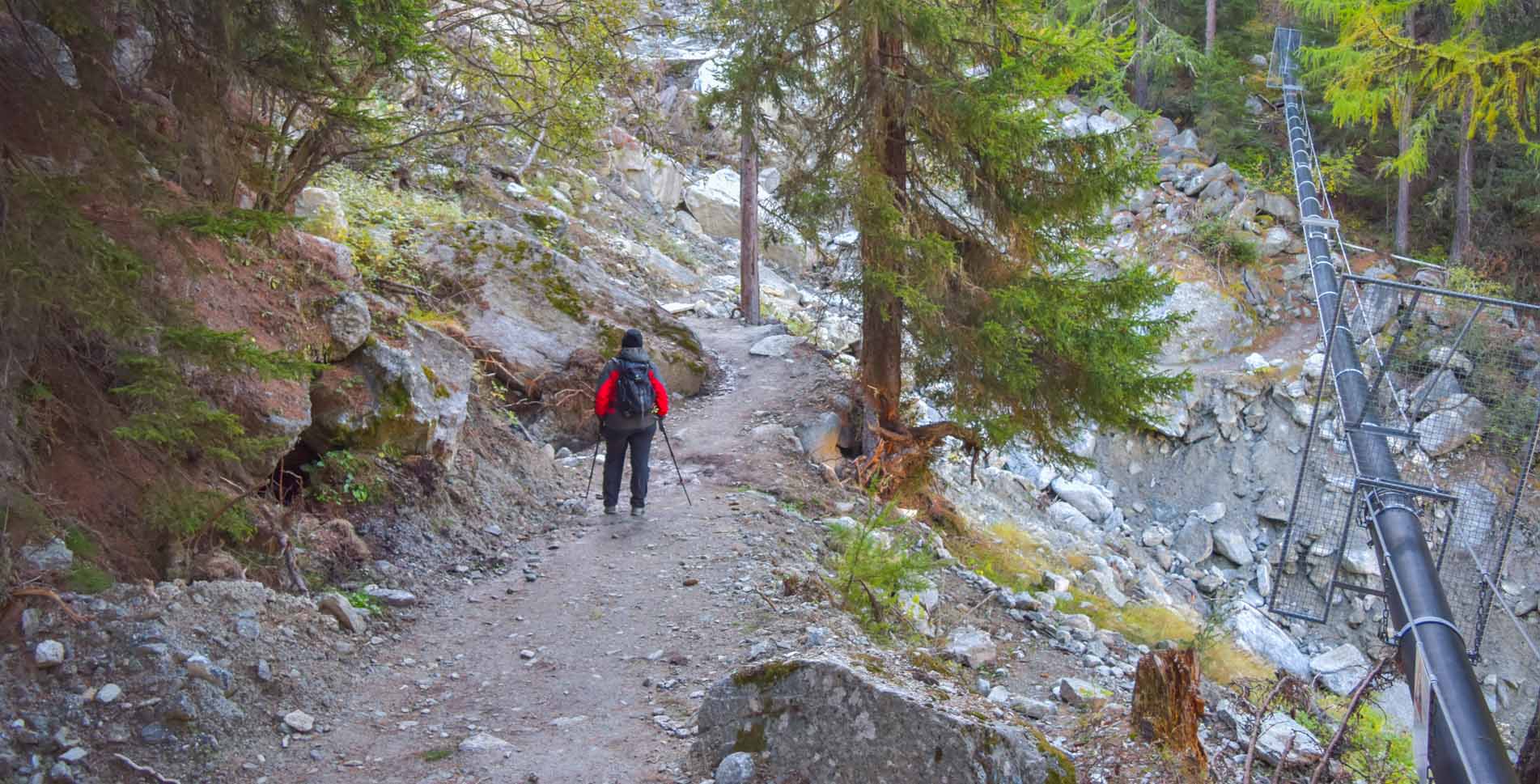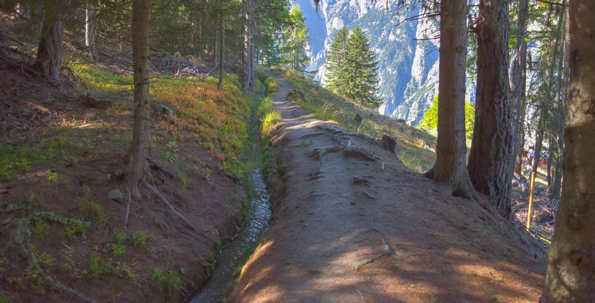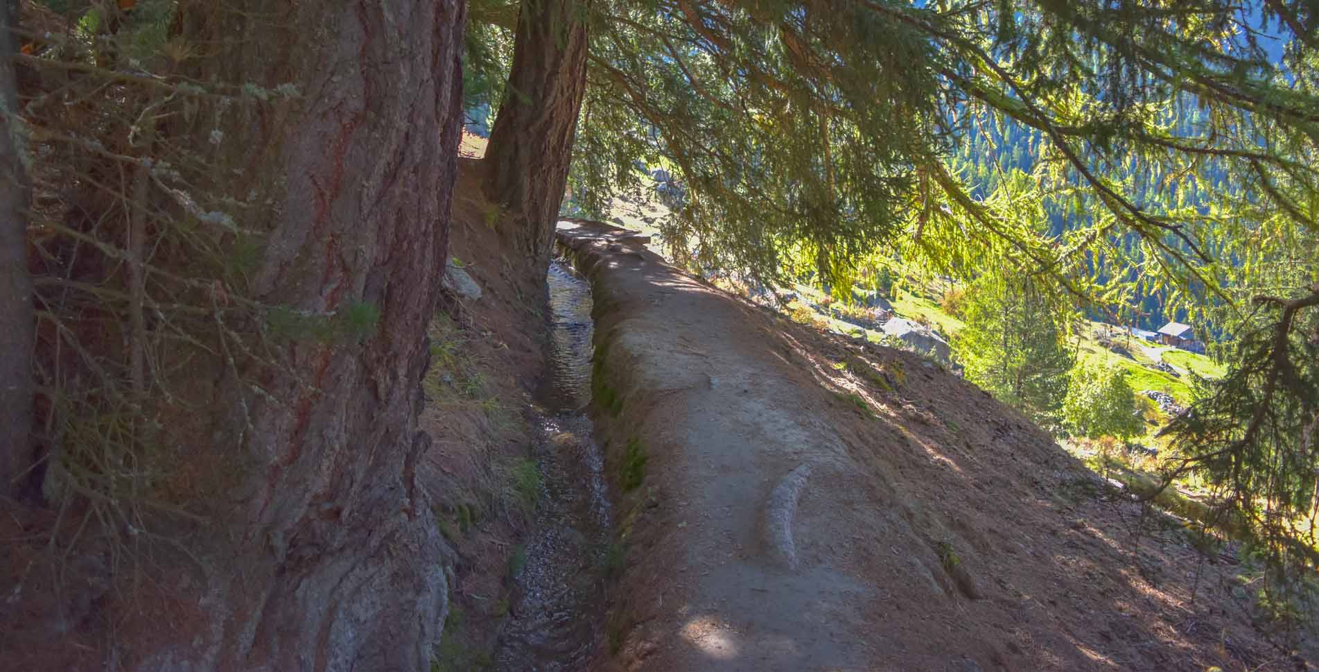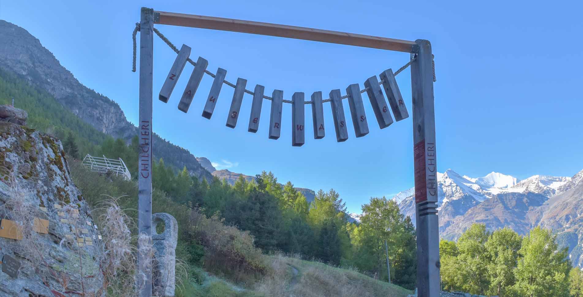 Zunächst führt der Weg durch Wald, dann durch offenes Gelände zum markierten Eingang der Wasserleite Chilcheri. Ab dort passiert man unterwegs auf dem Zauberwasser-Weg Grächen Infotafeln zum Thema Wasser. Immer am plätschernden Wasserkanal entlang durch den zauberhaften Lärchenwald, der da und dort durchsetzt ist mit riesigen Steinbrocken. Hinweistafeln mahnen, dass man sich nun in einem Gebiet mit erhöhter Steinschlaggefahr befindet. Dieses zügig ohne stehen zu bleiben durchqueren. Eindrücklich zeigt sich das Geschiebe im Ritigrabe mit wuchtigen Felsblöcken in der tief ausgewaschenen Runse, die man durchquert. Je nach Wegzustand ist dieser Abschnitt als T2 zu bewerten. Eine Tafel mahnt vor Murganggefahr. Ist der Ritigrabe passiert, wandert man weiter an der Chilcheri und gelangt nach rund 50 Minuten zu einem schönen Pausenplatz mit Klangschalen und einer Holzliege.
