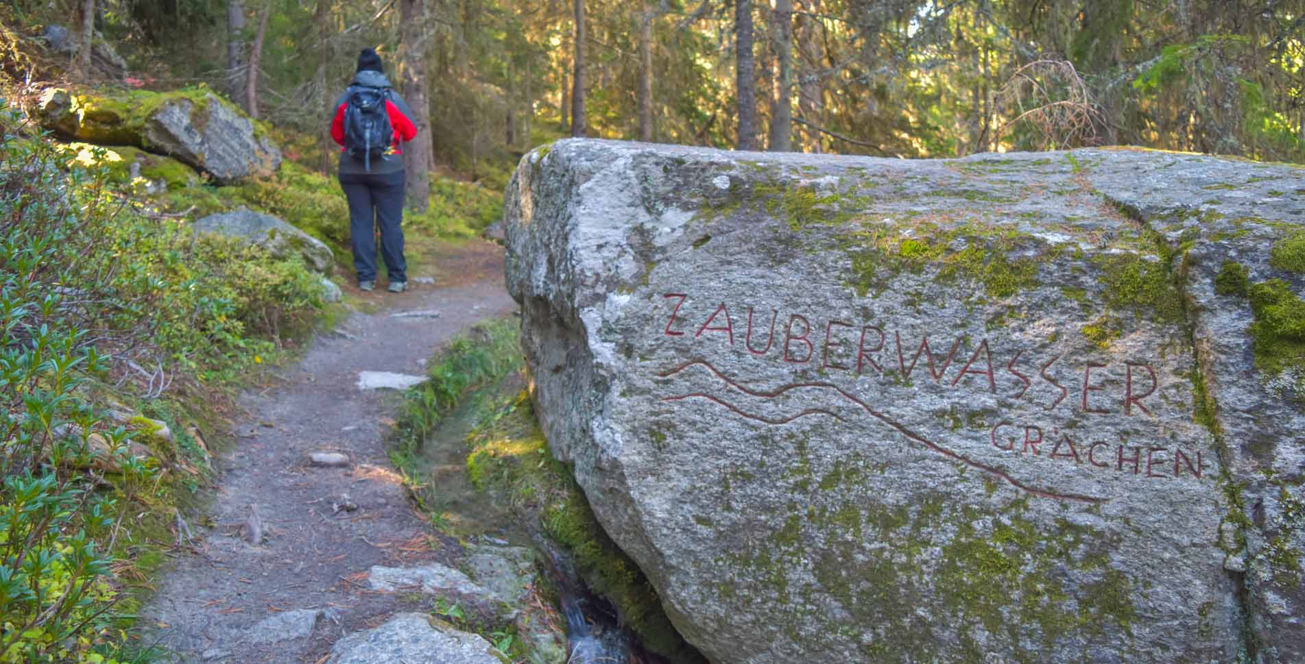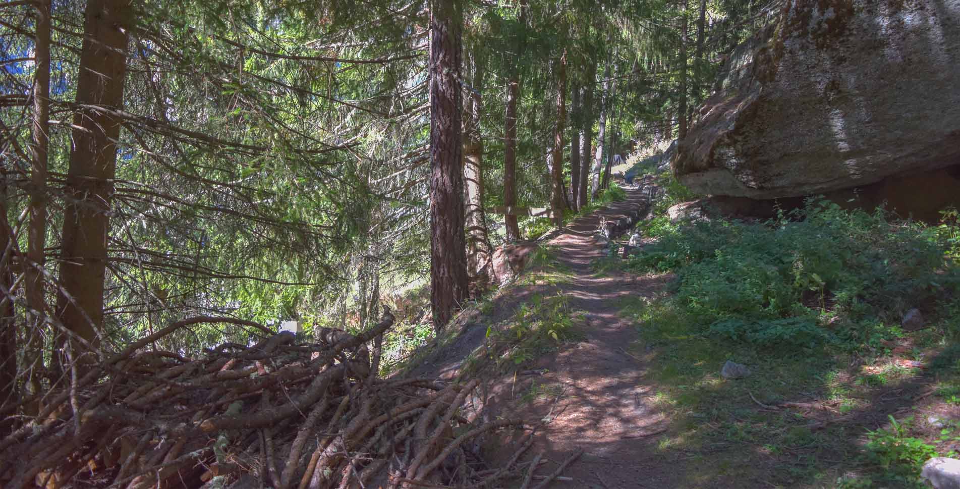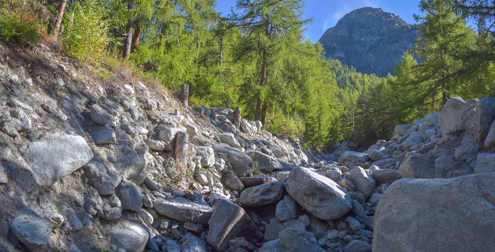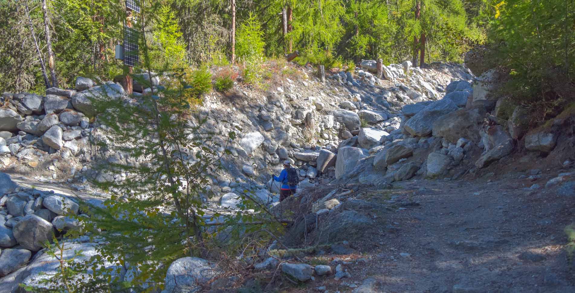 Zunächst führt der Weg durch Wald, dann durch offenes Gelände zum markierten Eingang der Wasserleite Chilcheri. Ab dort passiert man unterwegs auf dem Zauberwasser-Weg Grächen Infotafeln zum Thema Wasser. Immer am plätschernden Wasserkanal entlang durch den zauberhaften Lärchenwald, der da und dort durchsetzt ist mit riesigen Steinbrocken. Hinweistafeln mahnen, dass man sich nun in einem Gebiet mit erhöhter Steinschlaggefahr befindet. Dieses zügig ohne stehen zu bleiben durchqueren. Eindrücklich zeigt sich das Geschiebe im Ritigrabe mit wuchtigen Felsblöcken in der tief ausgewaschenen Runse, die man durchquert. Je nach Wegzustand ist dieser Abschnitt als T2 zu bewerten. Eine Tafel mahnt vor Murganggefahr. Ist der Ritigrabe passiert, wandert man weiter an der Chilcheri und gelangt nach rund 50 Minuten zu einem schönen Pausenplatz mit Klangschalen und einer Holzliege.