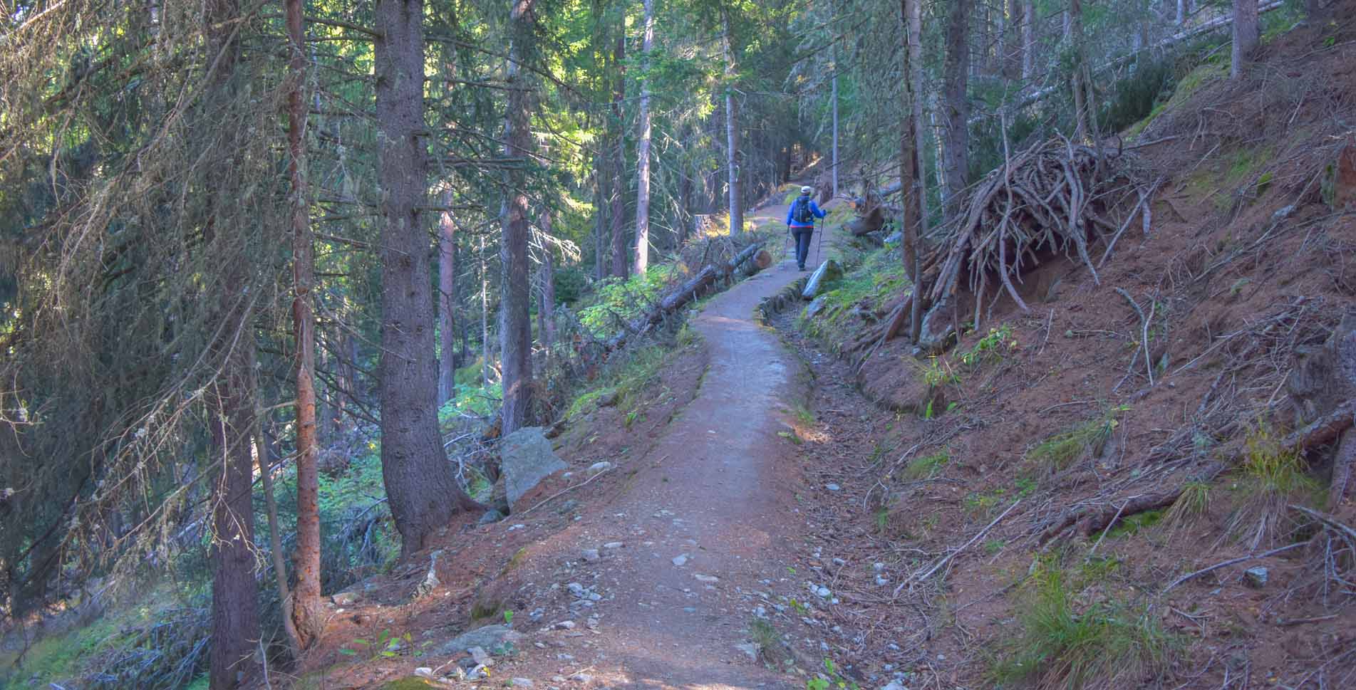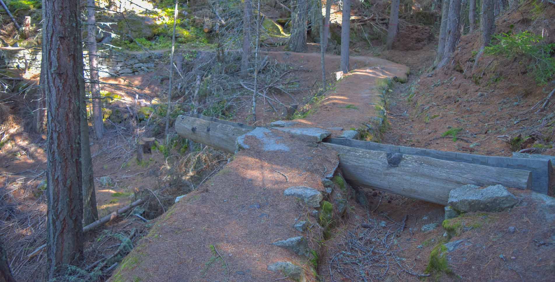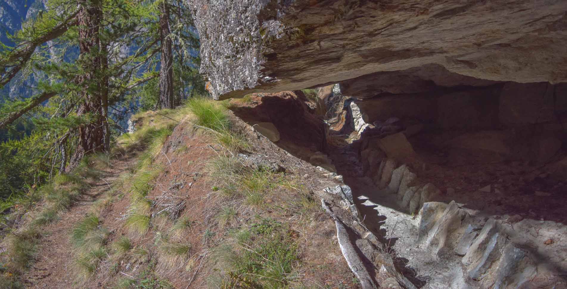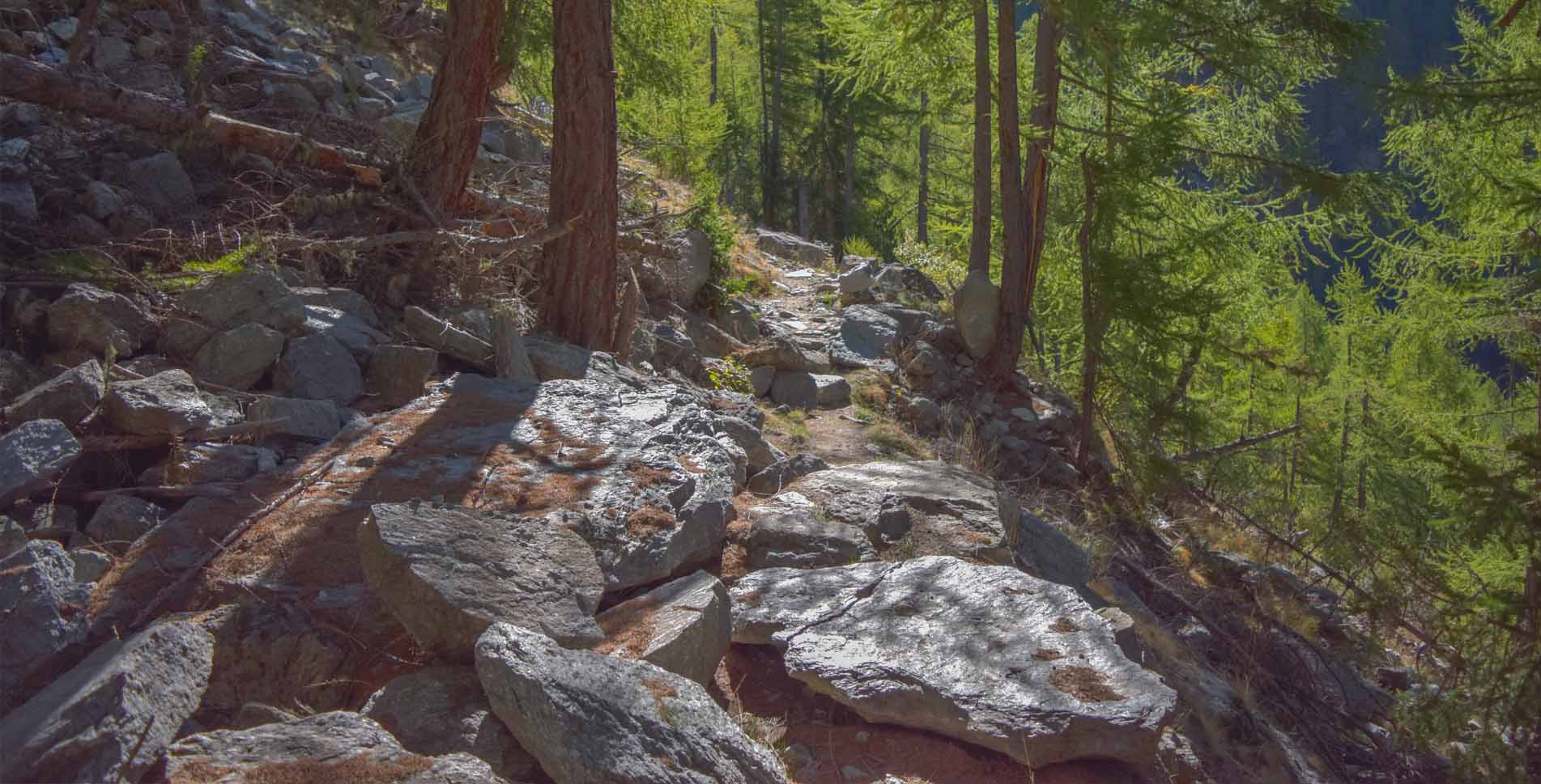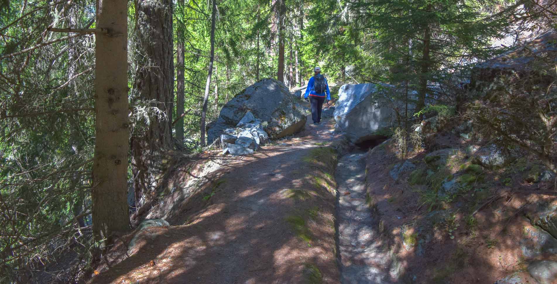 Zunächst führt der Weg durch Wald, dann durch offenes Gelände zum markierten Eingang der Wasserleite Chilcheri. Ab dort passiert man unterwegs auf dem Zauberwasser-Weg Grächen Infotafeln zum Thema Wasser. Immer am plätschernden Wasserkanal entlang durch den zauberhaften Lärchenwald, der da und dort durchsetzt ist mit riesigen Steinbrocken. Hinweistafeln mahnen, dass man sich nun in einem Gebiet mit erhöhter Steinschlaggefahr befindet. Dieses zügig ohne stehen zu bleiben durchqueren. Eindrücklich zeigt sich das Geschiebe im Ritigrabe mit wuchtigen Felsblöcken in der tief ausgewaschenen Runse, die man durchquert. Je nach Wegzustand ist dieser Abschnitt als T2 zu bewerten. Eine Tafel mahnt vor Murganggefahr. Ist der Ritigrabe passiert, wandert man weiter an der Chilcheri und gelangt nach rund 50 Minuten zu einem schönen Pausenplatz mit Klangschalen und einer Holzliege.