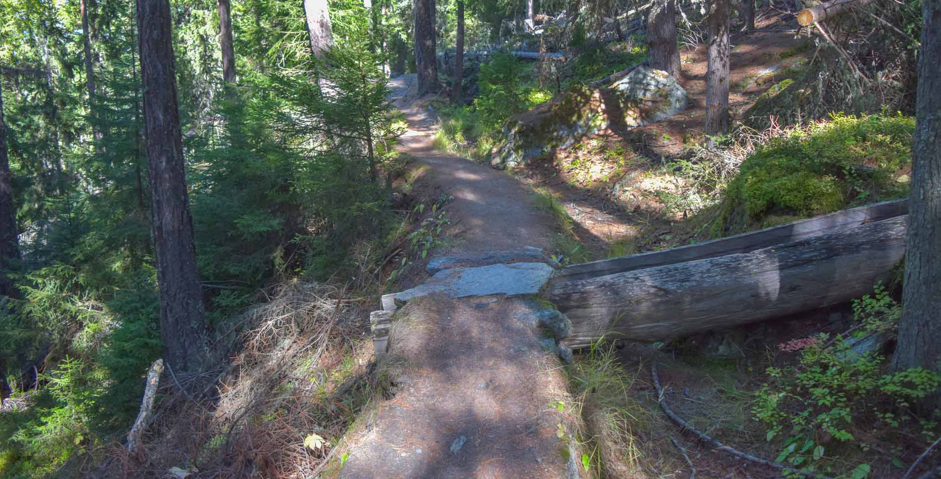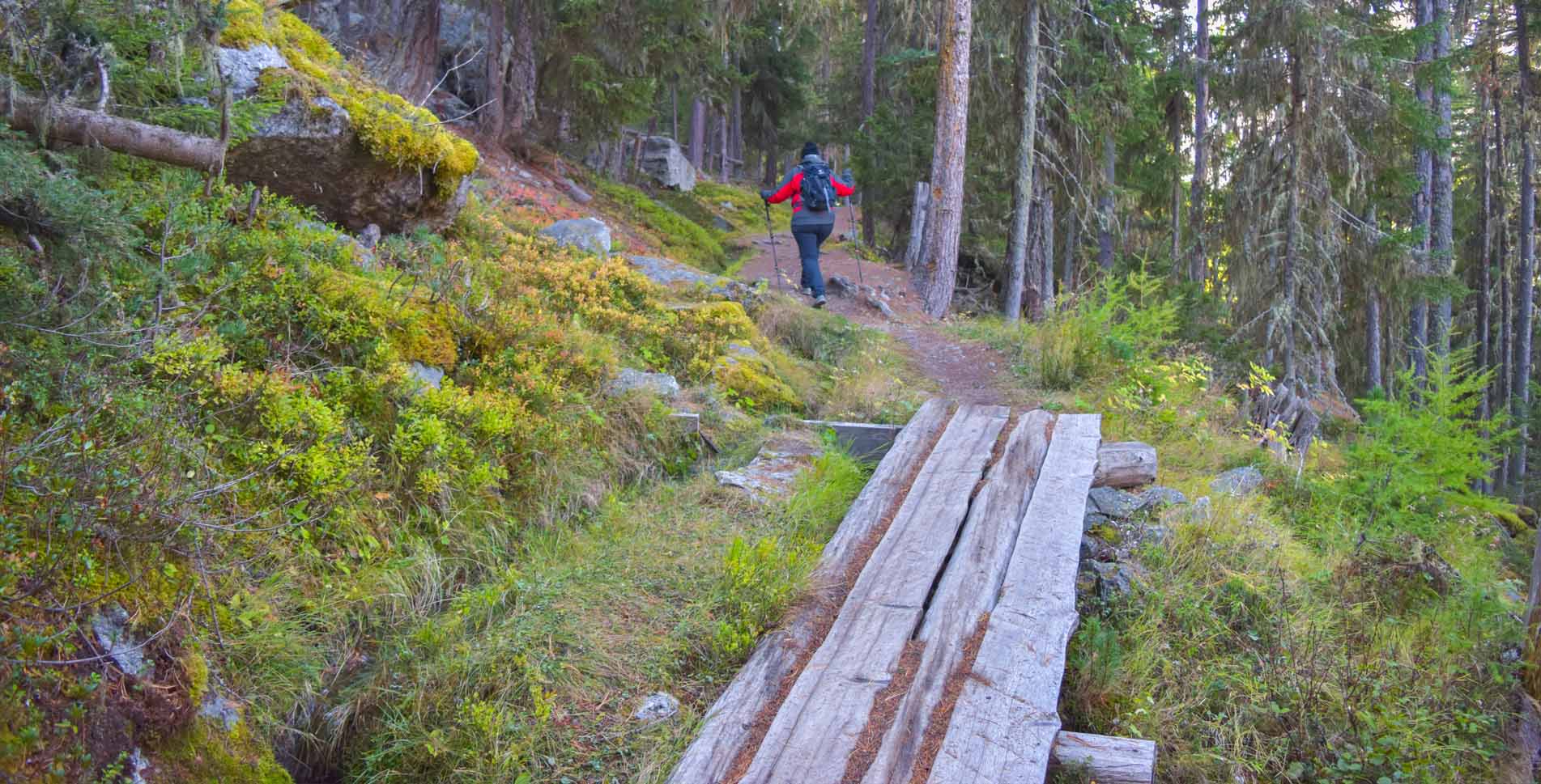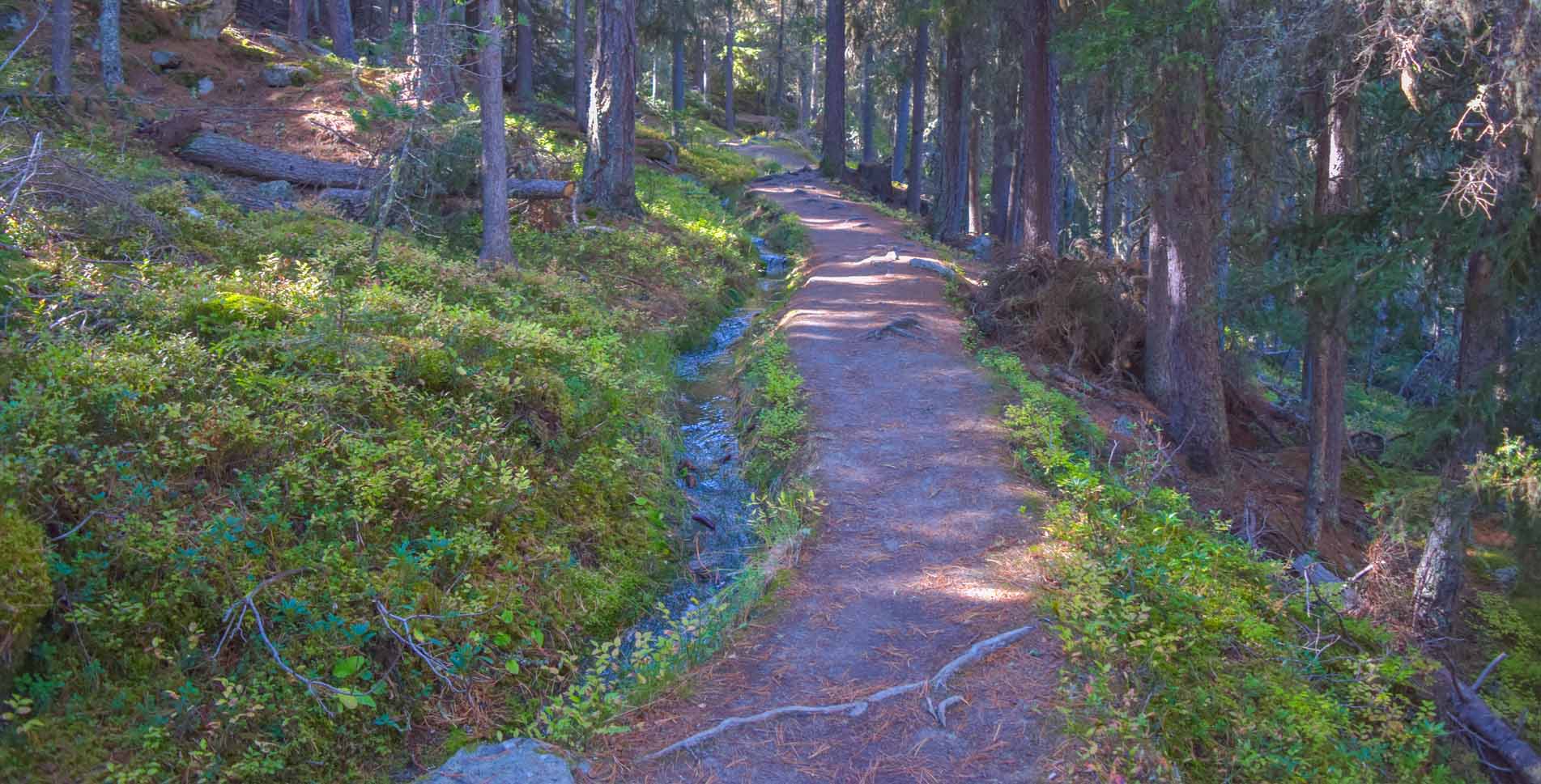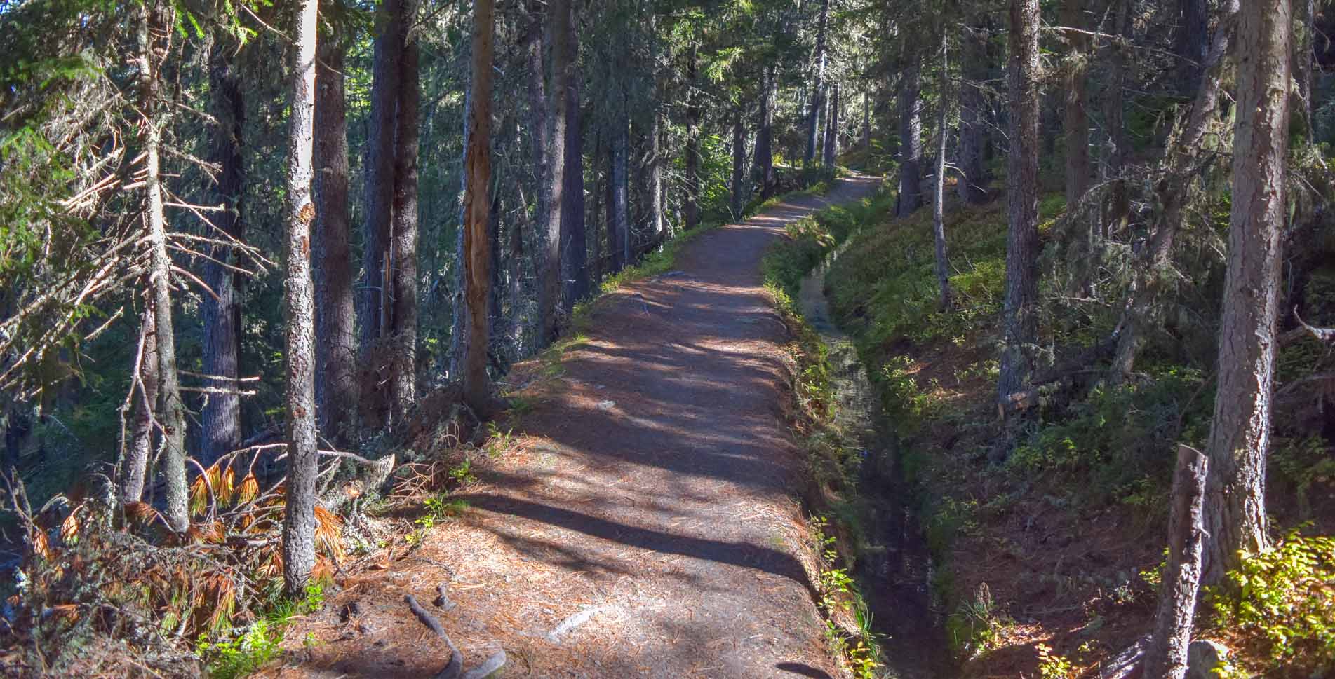Zunächst führt der Weg durch Wald, dann durch offenes Gelände zum markierten Eingang der Wasserleite Chilcheri. Ab dort passiert man unterwegs auf dem Zauberwasser-Weg Grächen Infotafeln zum Thema Wasser. Immer am plätschernden Wasserkanal entlang durch den zauberhaften Lärchenwald, der da und dort durchsetzt ist mit riesigen Steinbrocken. Hinweistafeln mahnen, dass man sich nun in einem Gebiet mit erhöhter Steinschlaggefahr befindet. Dieses zügig ohne stehen zu bleiben durchqueren. Eindrücklich zeigt sich das Geschiebe im Ritigrabe mit wuchtigen Felsblöcken in der tief ausgewaschenen Runse, die man durchquert. Je nach Wegzustand ist dieser Abschnitt als T2 zu bewerten. Eine Tafel mahnt vor Murganggefahr. Ist der Ritigrabe passiert, wandert man weiter an der Chilcheri und gelangt nach rund 50 Minuten zu einem schönen Pausenplatz mit Klangschalen und einer Holzliege.