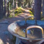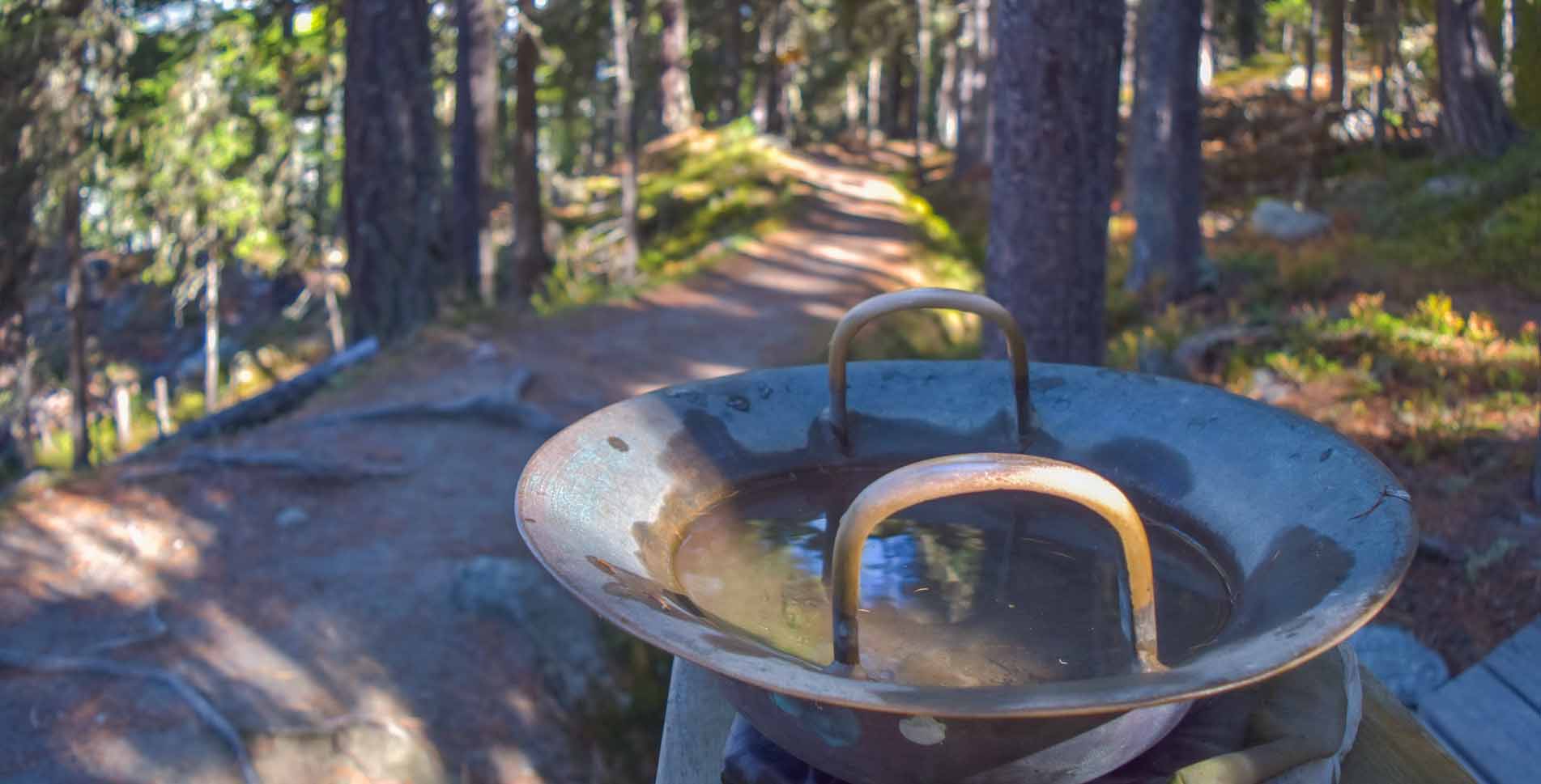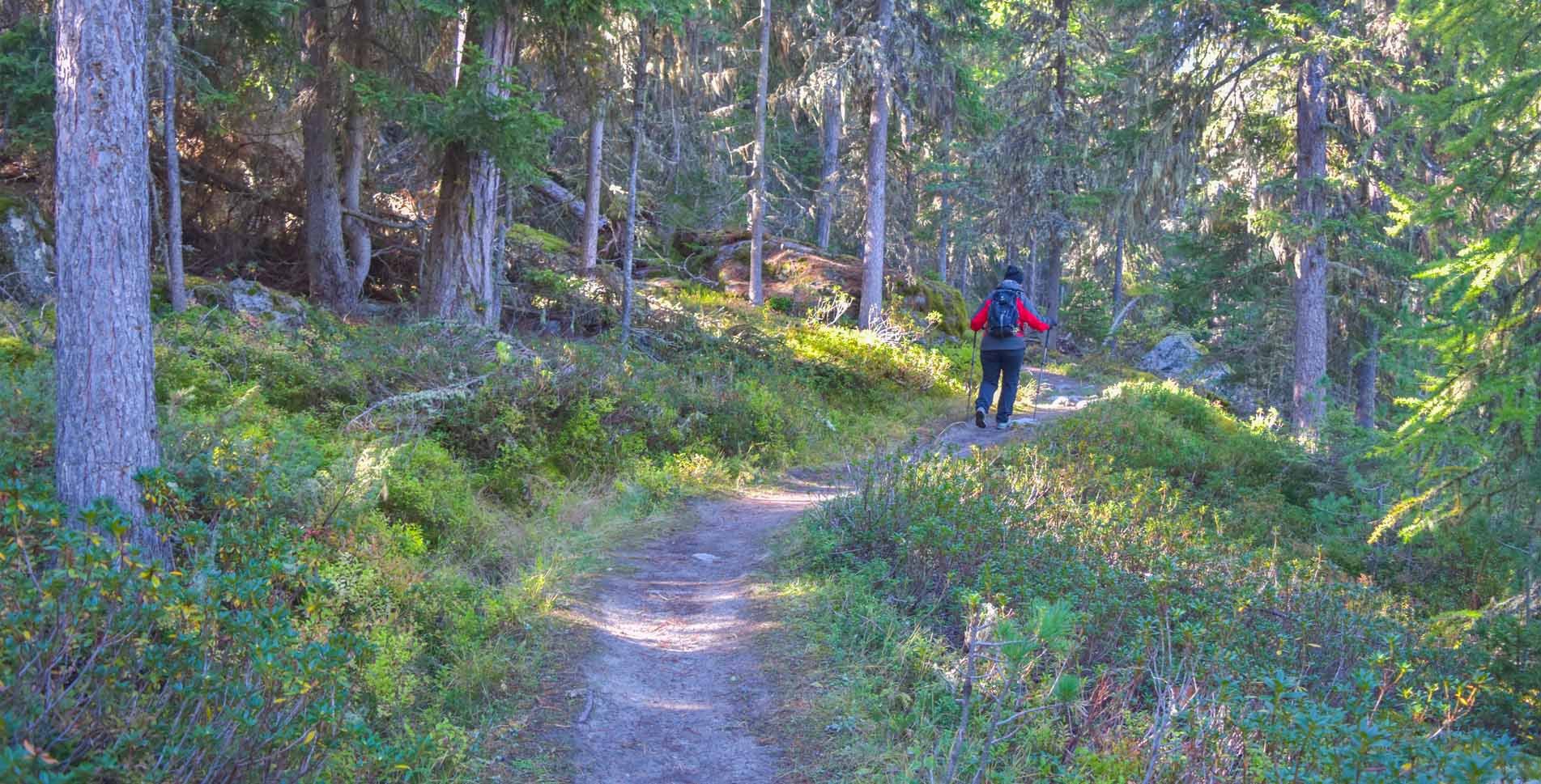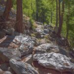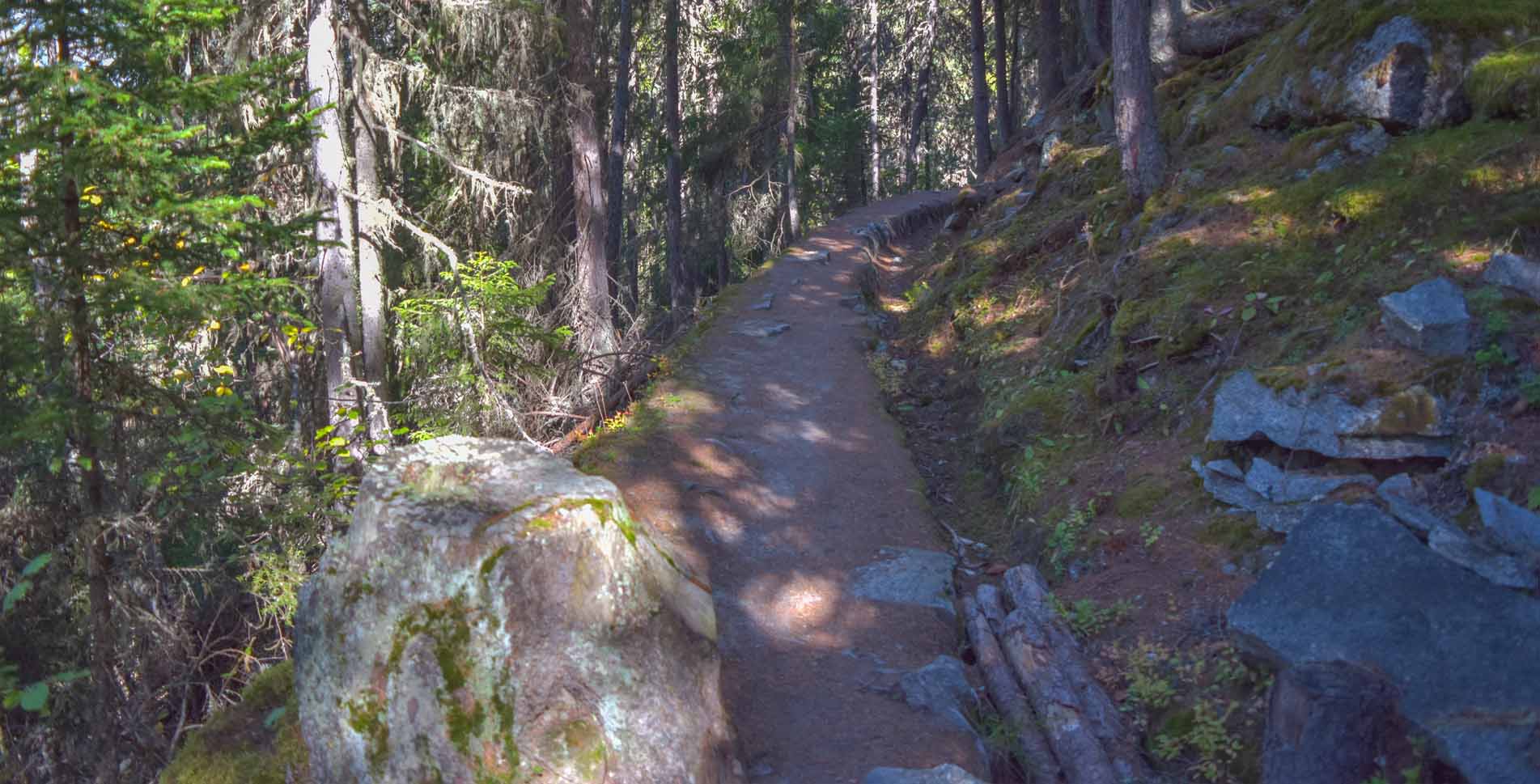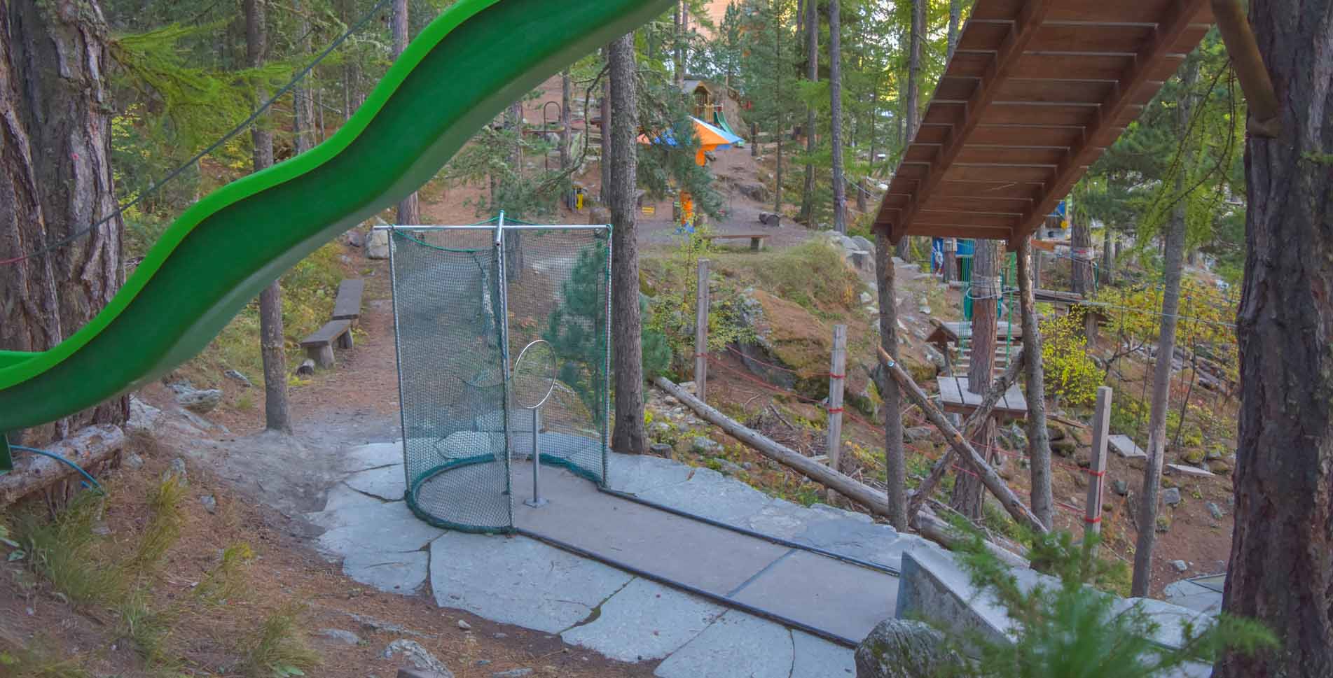 Zunächst führt der Weg durch Wald, dann durch offenes Gelände zum markierten Eingang der Wasserleite Chilcheri. Ab dort passiert man unterwegs auf dem Zauberwasser-Weg Grächen Infotafeln zum Thema Wasser. Immer am plätschernden Wasserkanal entlang durch den zauberhaften Lärchenwald, der da und dort durchsetzt ist mit riesigen Steinbrocken. Hinweistafeln mahnen, dass man sich nun in einem Gebiet mit erhöhter Steinschlaggefahr befindet. Dieses zügig ohne stehen zu bleiben durchqueren. Eindrücklich zeigt sich das Geschiebe im Ritigrabe mit wuchtigen Felsblöcken in der tief ausgewaschenen Runse, die man durchquert. Je nach Wegzustand ist dieser Abschnitt als T2 zu bewerten. Eine Tafel mahnt vor Murganggefahr. Ist der Ritigrabe passiert, wandert man weiter an der Chilcheri und gelangt nach rund 50 Minuten zu einem schönen Pausenplatz mit Klangschalen und einer Holzliege.
