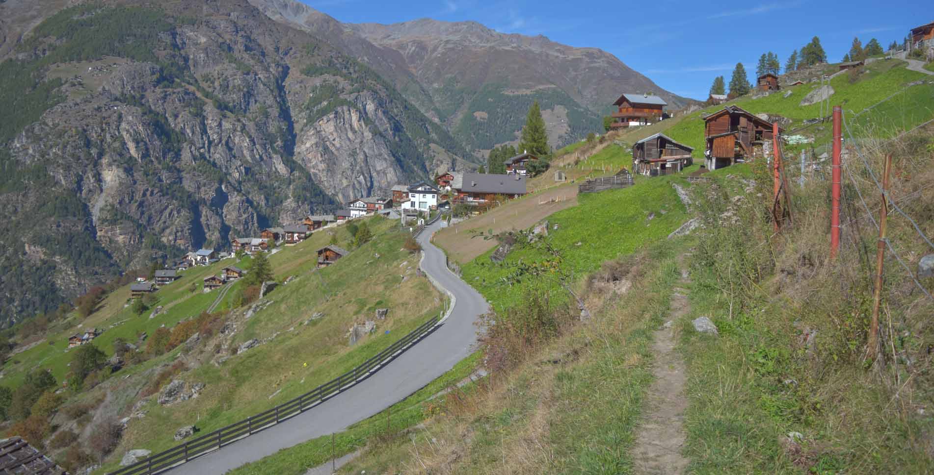 Auf dem schmalen Wanderweg folgt man der ausgetrockneten und nicht mehr gepflegten Wasserleite durch den Wald. Eindrücklich zeigt sich zuweilen die Bauweise der alten Wasserleite mit eingemauerten Steinen. Der Wald lichtet sich, führt als Höhenweg weiter, welcher oberhalb eine Kapelle passiert, und nach Gasenried führt. Der Weg verläuft oberhalb vom Weiler Gasenried an einem Gehöft vorbei und durch Weideland. Auch die schönen Schwarznasenschafe gibt es vielleicht zu sehen. Abwechselnd führt der Weg durch Wald und offenes Gelände. Zum Schluss durch eine Waldpassage und nochmals durch den Ritigrabe. Wenig später erreicht man den Wegweiser Bineri 1660m, wo man die Bineri verlässt und nach links in Richtung Heimine und Grächen abbiegt. Nach rund 10 Minuten, von dort bergab, ist man beim Wegweiser Heimine angekommen und wandert dann durch Grächen zurück zum Dorfplatz. Mehrere Restaurants rund um den Dorfplatz laden zur Einkehr ein, und die Bushaltestelle ist nur wenige Schritte davon entfernt.