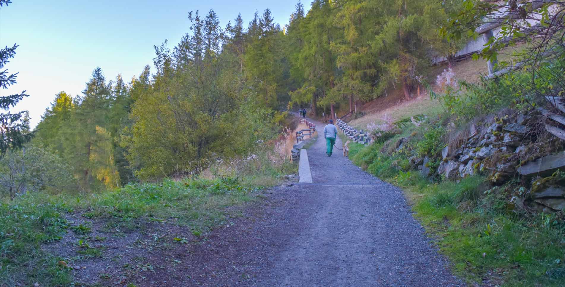 Von der Bushaltestelle Grächen Zentrum geht man zum Dorfplatz mit der markanten Pfarrkirche und folgt dem Wegweiser in Richtung Z’Seew auf der Route Alpenpässe-Weg Nr. 6. Der Weg führt bergauf, an den letzten Häusern von Grächen vorbei, zum Wegweiser Einstieg Riederi, dann am Robis Waldspielpark vorbei. Beim kommenden Wegweiser biegt man nach rechts auf den Zauberwasser-Weg Grächen Nr. 180 in Richtung Gasenried ab. Der Weg führt ein kurzes Stück oberhalb vom Robis Waldspielpark mit Seilpark, Minigolf, Grillstellen und Picknickplätze vorbei. Zunächst wandert man an der Drieri Wasserleite entlang. Schon zum Start der Tour ein wunderschöner Weg.