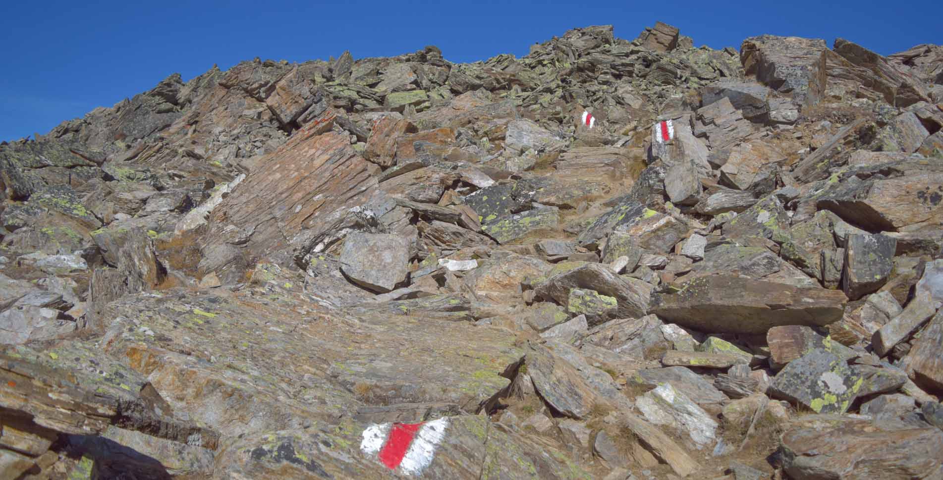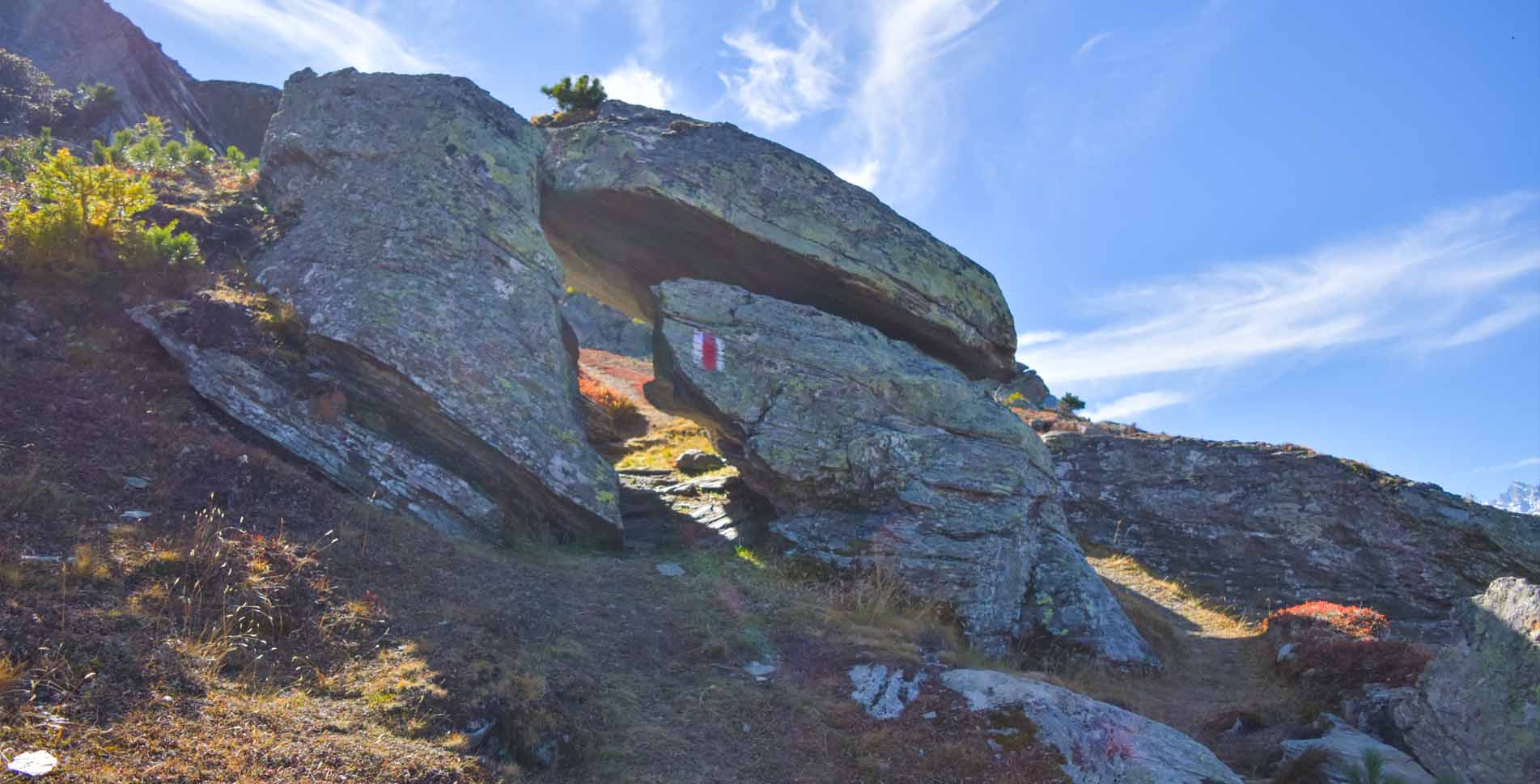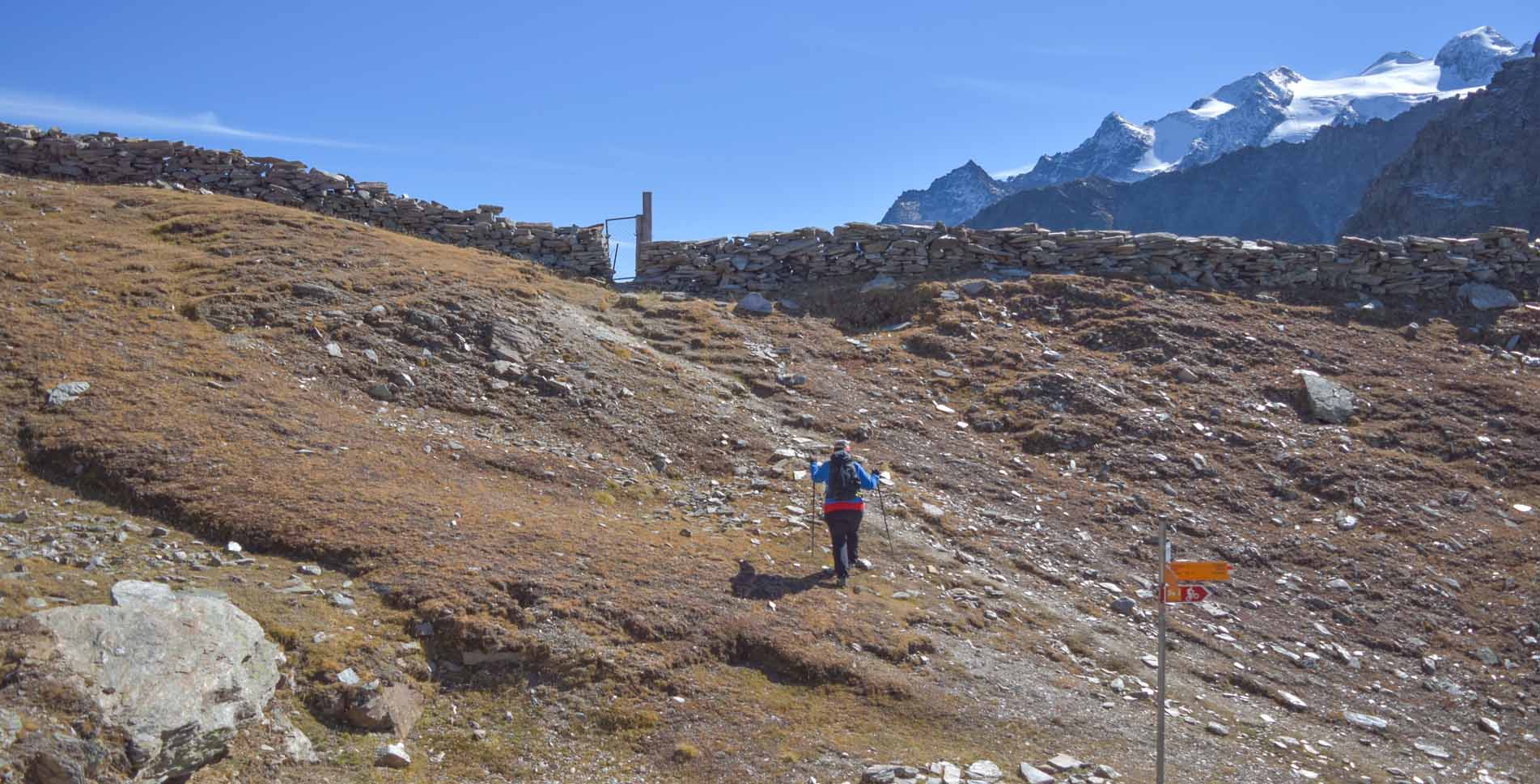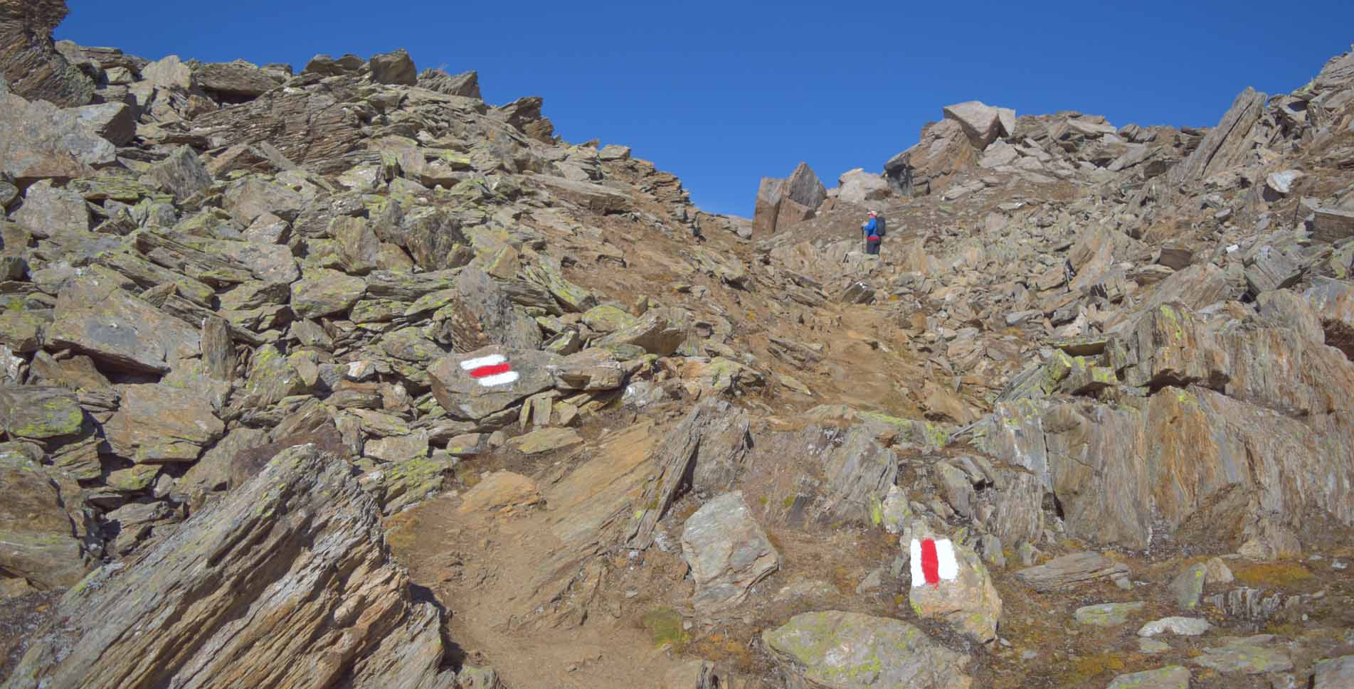 Schon bald ist man in einem steinigen Gelände mit grossen, zuweilen dunkeln Felsblöcken. Über Felsplatten und Steinstufen geht es stetig bergauf, dabei müssen über grössere Steinbrocken die Hände ab und zu zur Hilfe genommen werden. Bald hat man das Wannihorn – im Walliser Dialekt Wannihoru genannt – im Blick. Schliesslich erreicht man erneut den breiten Weg, der im Winter als Schneeschuhtrail dient. Diesem folgt man nun ein Stück und biegt dann nach links wieder auf den Bergweg ein.