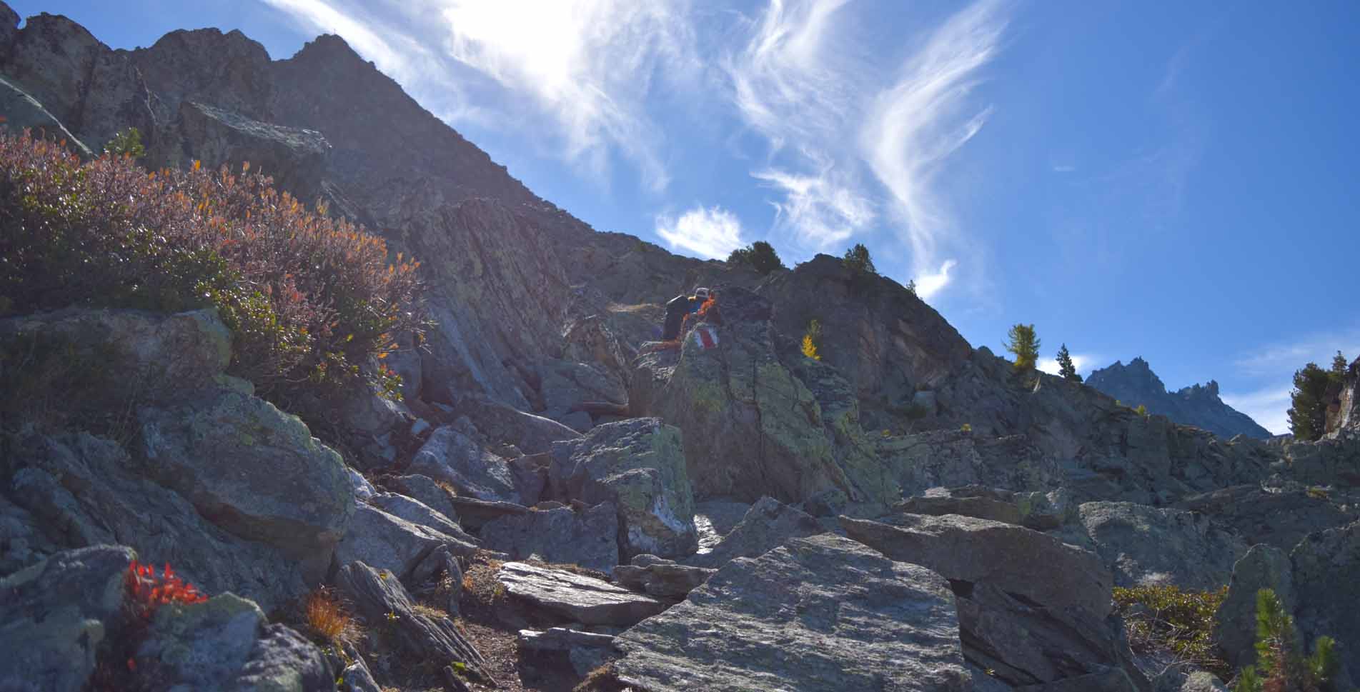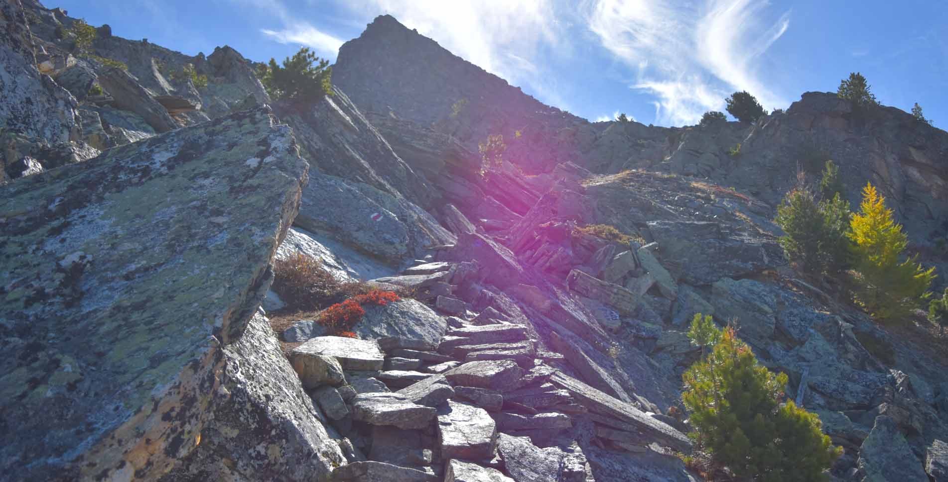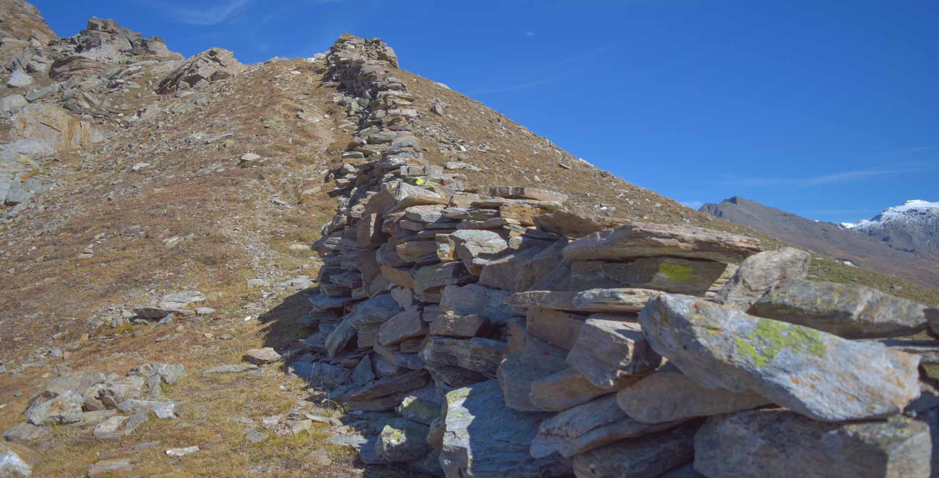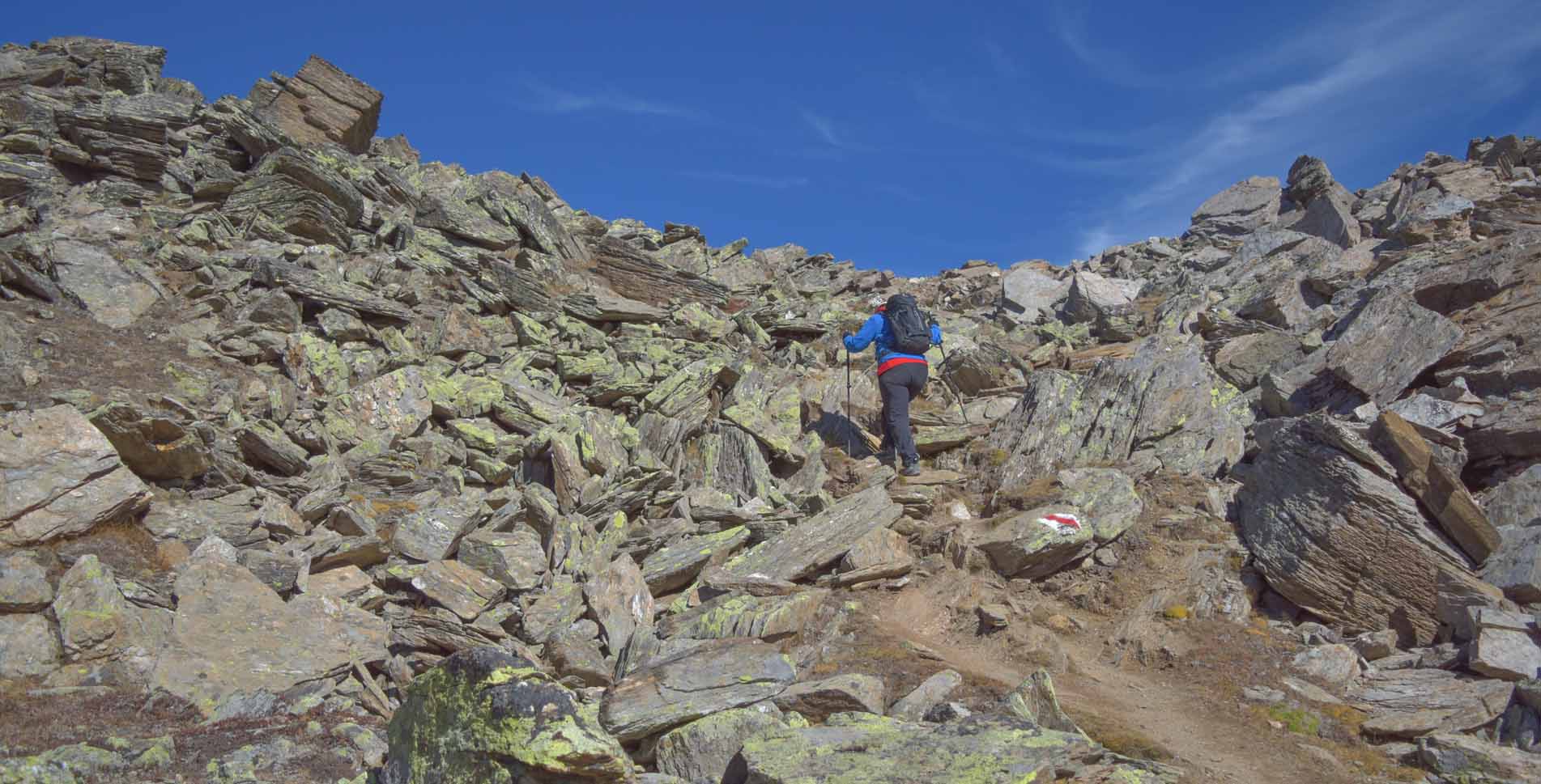 Schon bald ist man in einem steinigen Gelände mit grossen, zuweilen dunkeln Felsblöcken. Über Felsplatten und Steinstufen geht es stetig bergauf, dabei müssen über grössere Steinbrocken die Hände ab und zu zur Hilfe genommen werden. Bald hat man das Wannihorn – im Walliser Dialekt Wannihoru genannt – im Blick. Schliesslich erreicht man erneut den breiten Weg, der im Winter als Schneeschuhtrail dient. Diesem folgt man nun ein Stück und biegt dann nach links wieder auf den Bergweg ein.