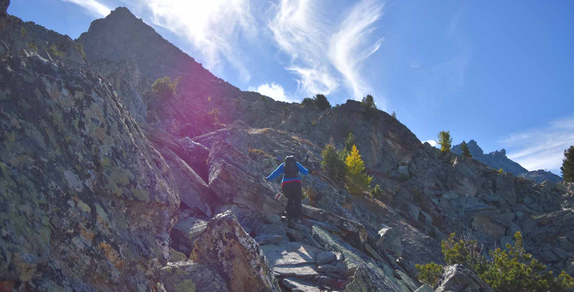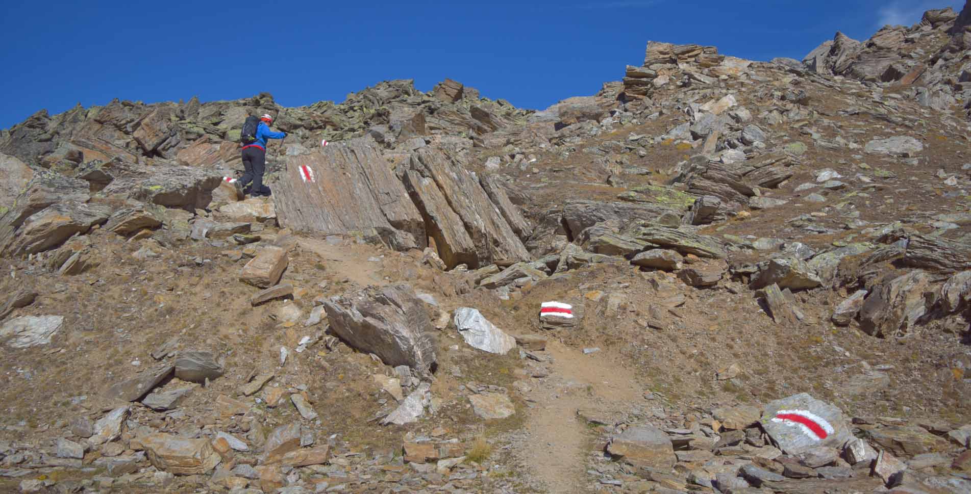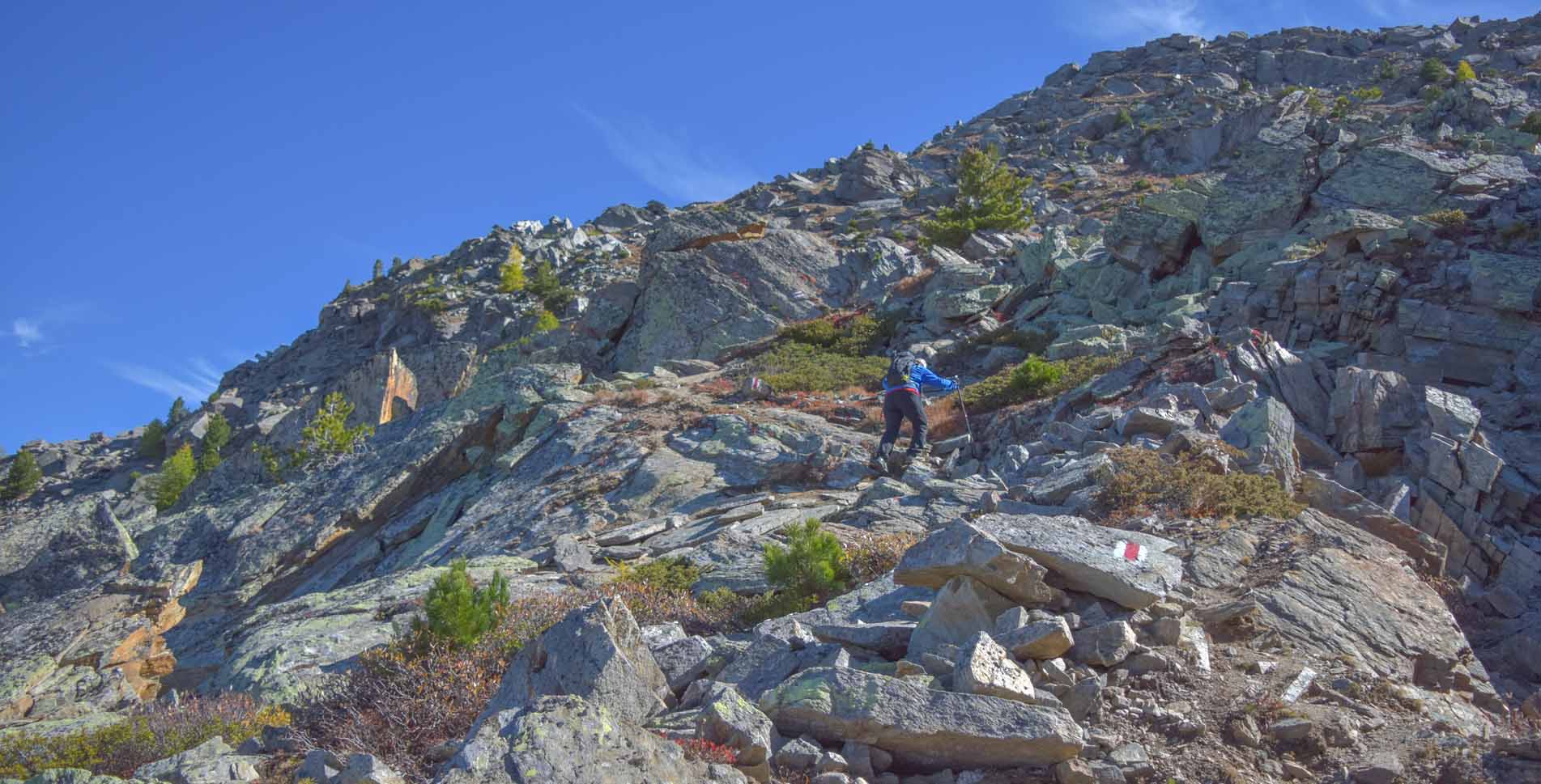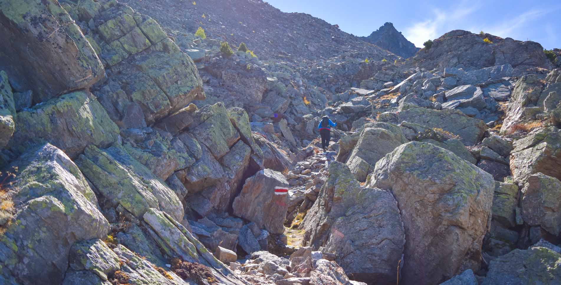 Schon bald ist man in einem steinigen Gelände mit grossen, zuweilen dunkeln Felsblöcken. Über Felsplatten und Steinstufen geht es stetig bergauf, dabei müssen über grössere Steinbrocken die Hände ab und zu zur Hilfe genommen werden. Bald hat man das Wannihorn – im Walliser Dialekt Wannihoru genannt – im Blick. Schliesslich erreicht man erneut den breiten Weg, der im Winter als Schneeschuhtrail dient. Diesem folgt man nun ein Stück und biegt dann nach links wieder auf den Bergweg ein.
