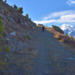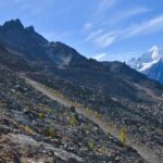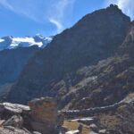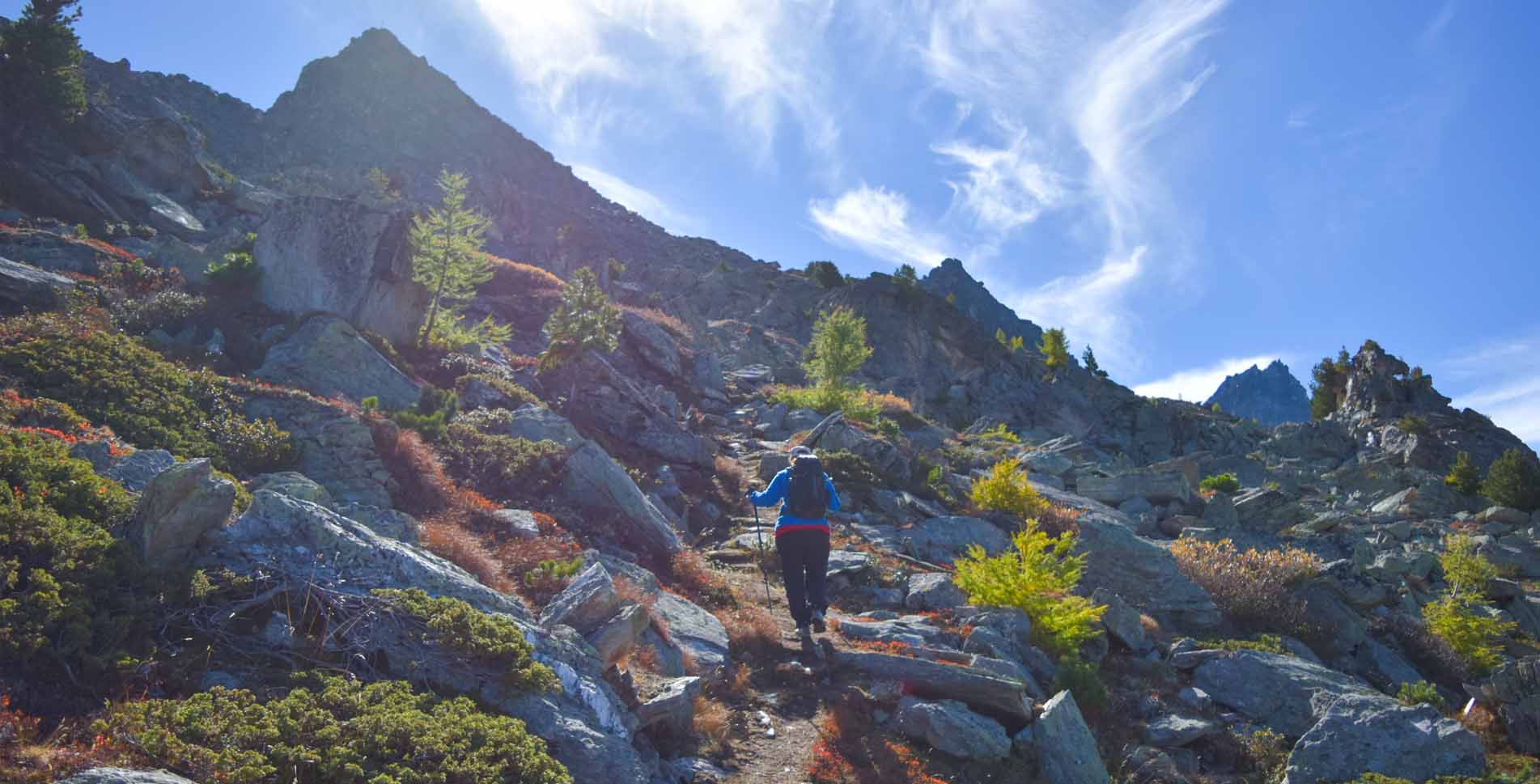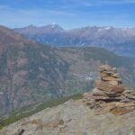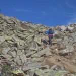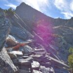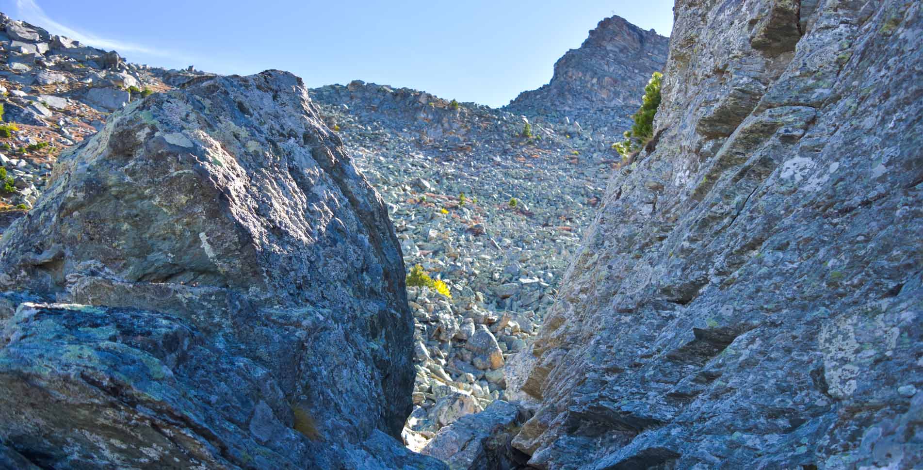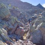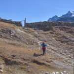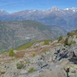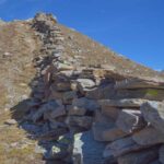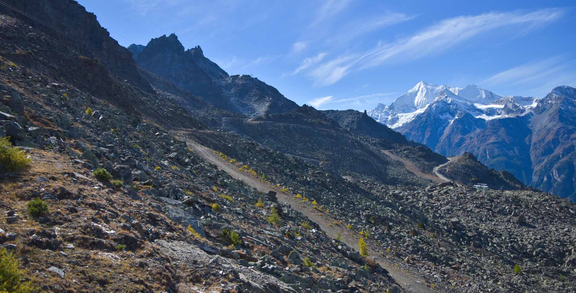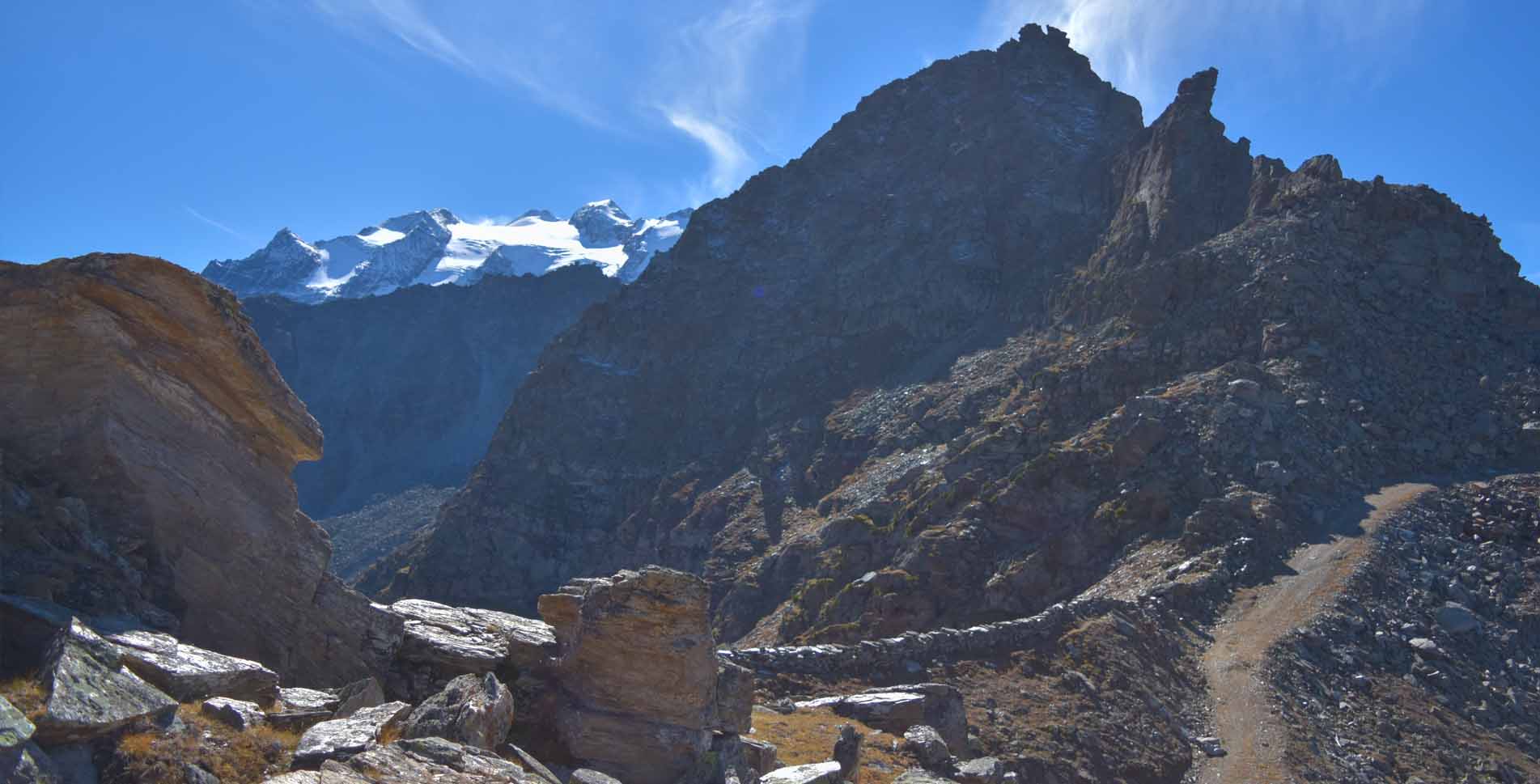 Schon bald ist man in einem steinigen Gelände mit grossen, zuweilen dunkeln Felsblöcken. Über Felsplatten und Steinstufen geht es stetig bergauf, dabei müssen über grössere Steinbrocken die Hände ab und zu zur Hilfe genommen werden. Bald hat man das Wannihorn – im Walliser Dialekt Wannihoru genannt – im Blick. Schliesslich erreicht man erneut den breiten Weg, der im Winter als Schneeschuhtrail dient. Diesem folgt man nun ein Stück und biegt dann nach links wieder auf den Bergweg ein.