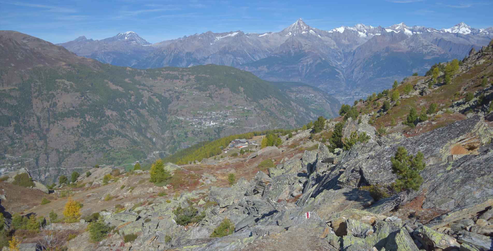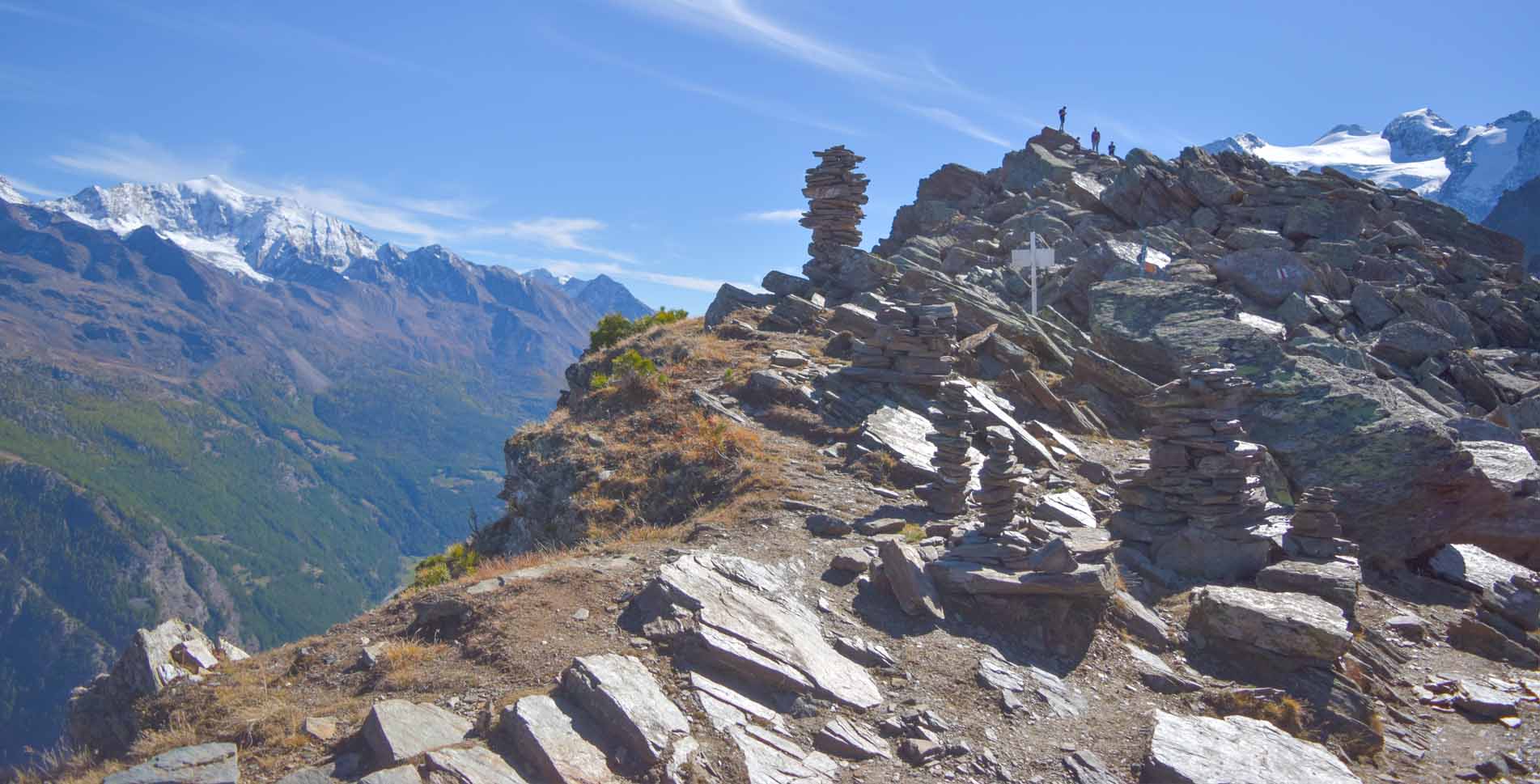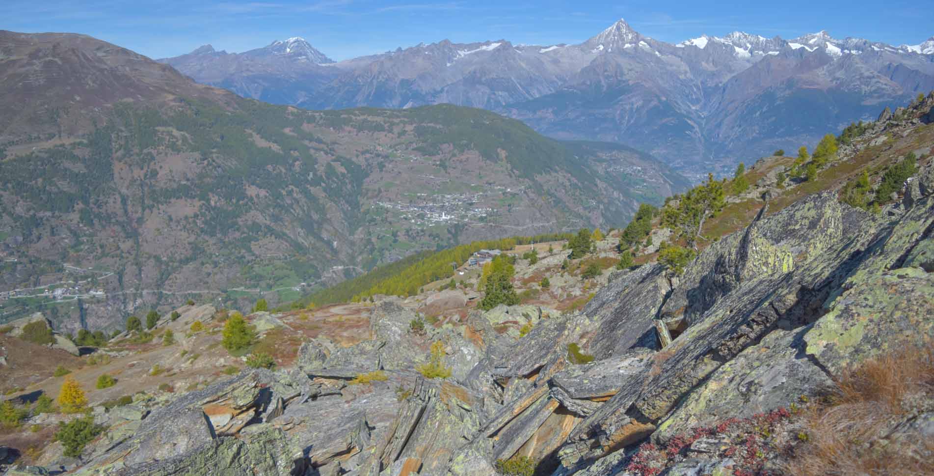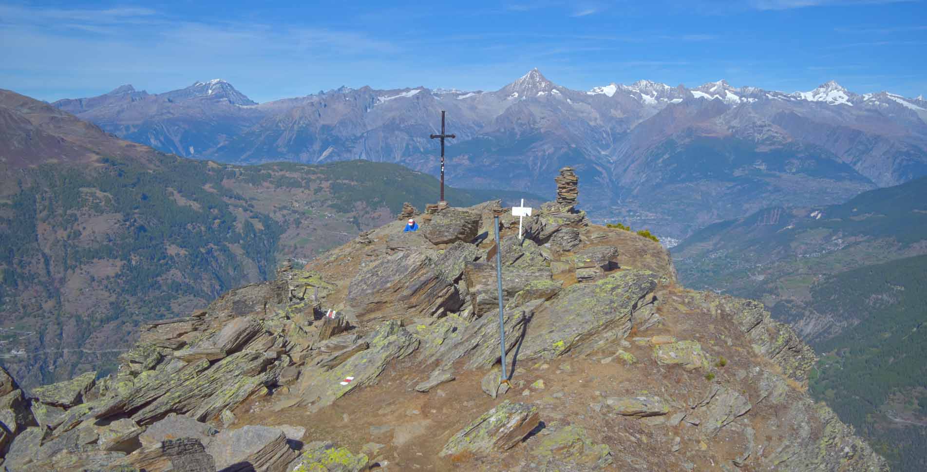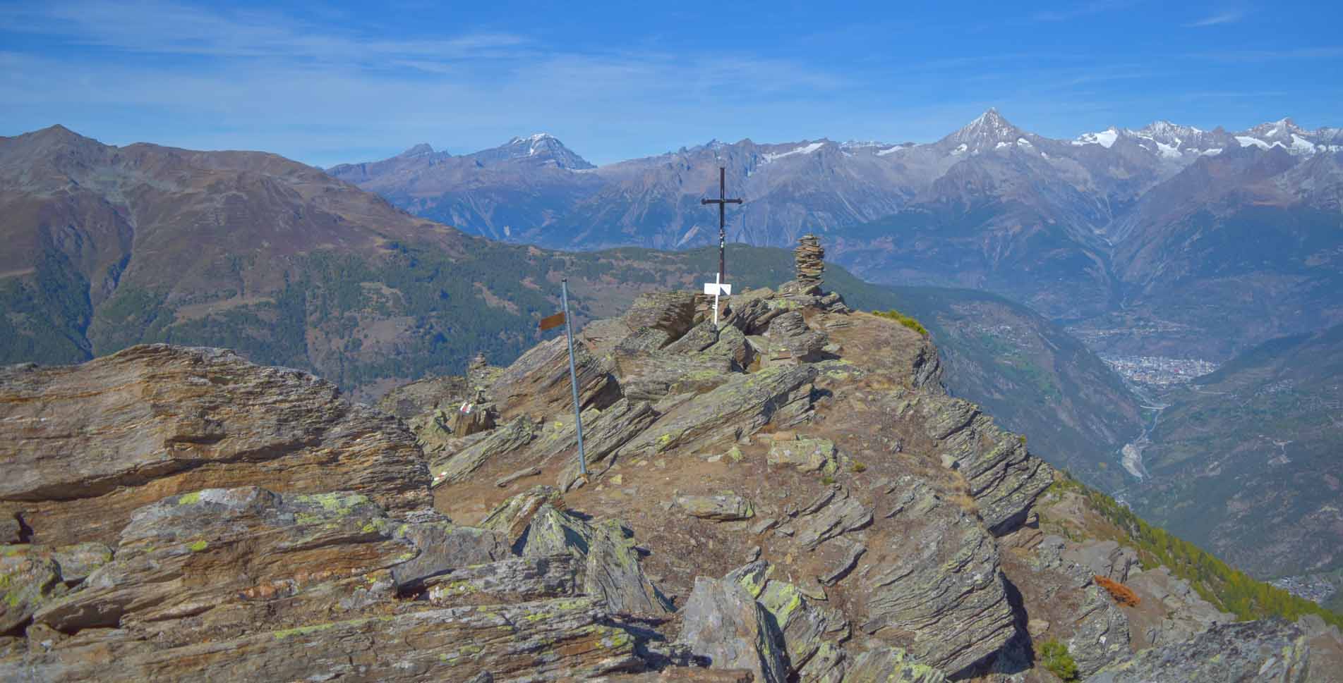 Der 360°-Rundblick vom 2669 Meter hohen Wannihorn ist schlicht atemberaubend! Auf der einen Seite das Saastal, auf der anderen das Mattertal. Dann das Vispertal mit Visp im Rhonetal, in der Ferne ist sogar der Aletschgletscher auszumachen. Gekrönt wird das fantastische Panorama von den majestätischen Bergriesen wie dem Weissmies, Lagginhorn und Fletschhorn gen Saastal und gen Mattertal ist das Weisshorn und Bishorn zu sehen. Sogar der Gipfel vom Dom ist auszumachen.