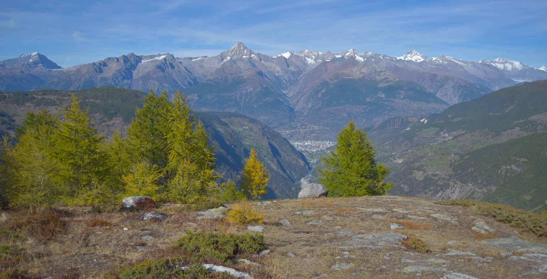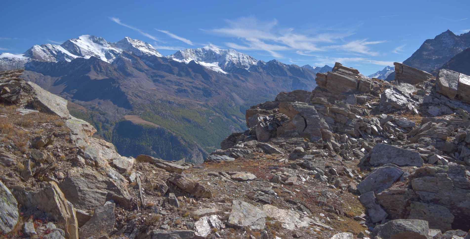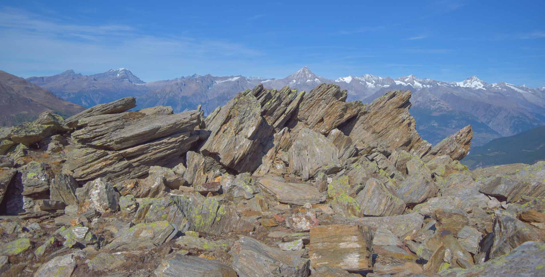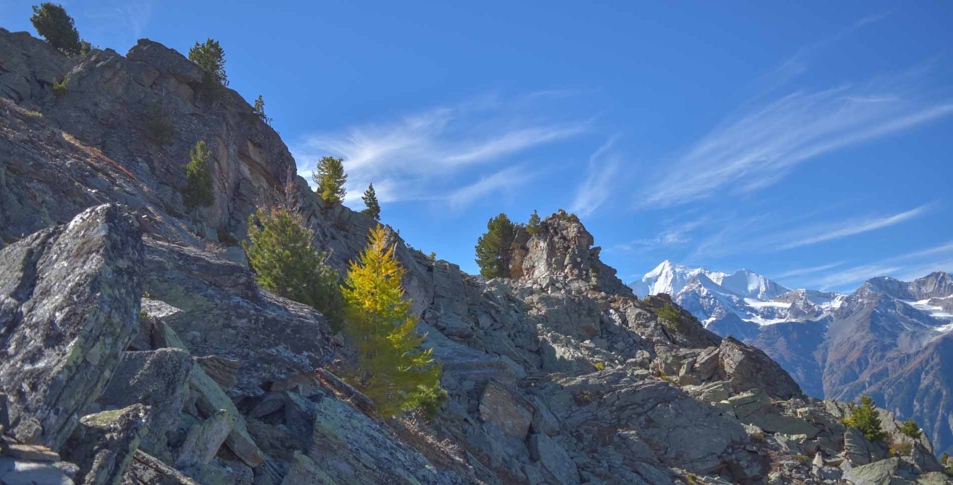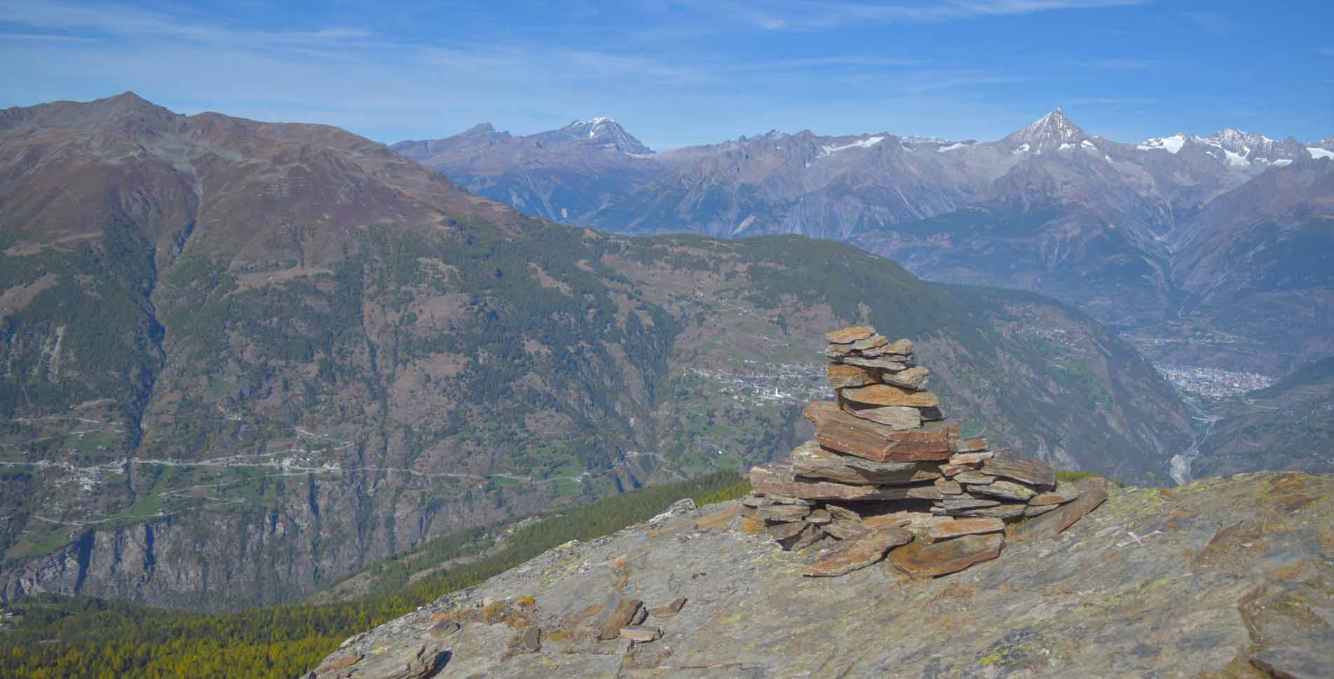 Der 360°-Rundblick vom 2669 Meter hohen Wannihorn ist schlicht atemberaubend! Auf der einen Seite das Saastal, auf der anderen das Mattertal. Dann das Vispertal mit Visp im Rhonetal, in der Ferne ist sogar der Aletschgletscher auszumachen. Gekrönt wird das fantastische Panorama von den majestätischen Bergriesen wie dem Weissmies, Lagginhorn und Fletschhorn gen Saastal und gen Mattertal ist das Weisshorn und Bishorn zu sehen. Sogar der Gipfel vom Dom ist auszumachen.