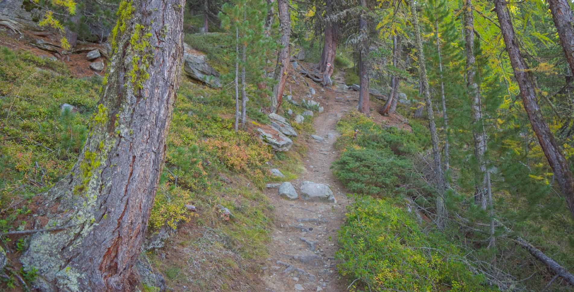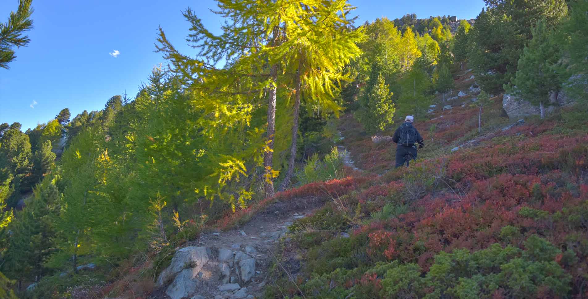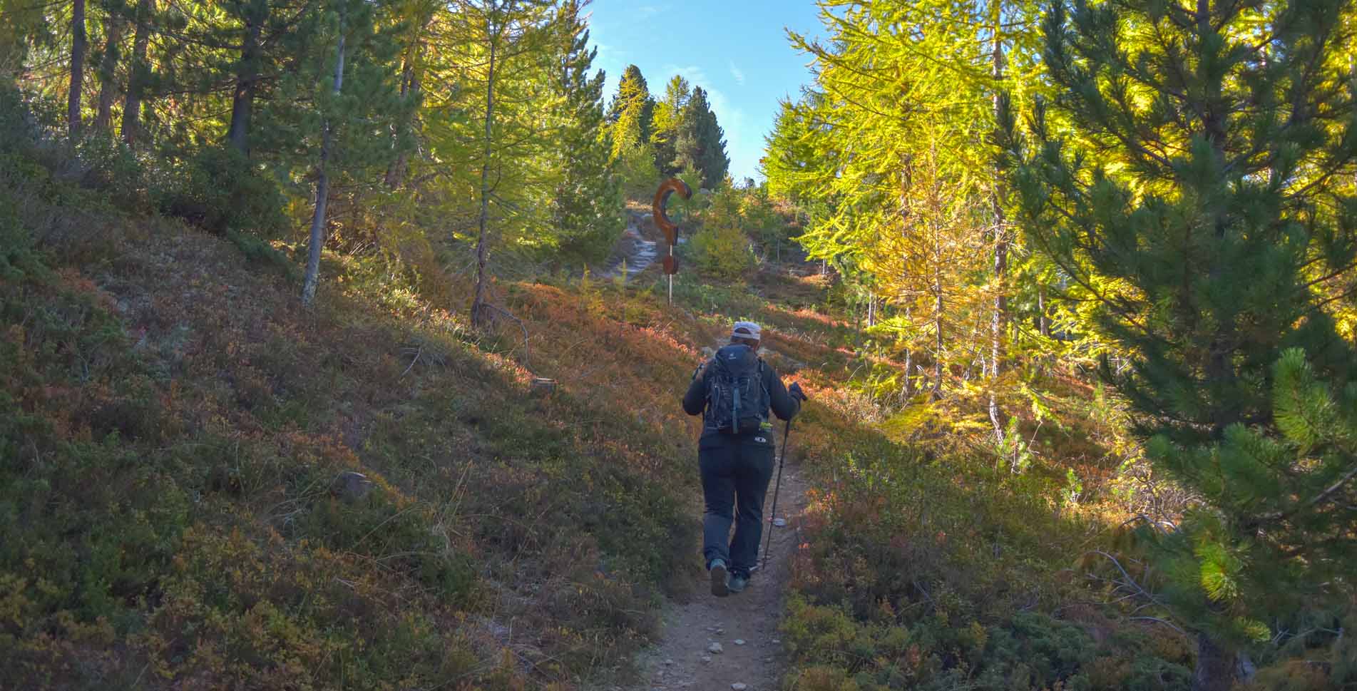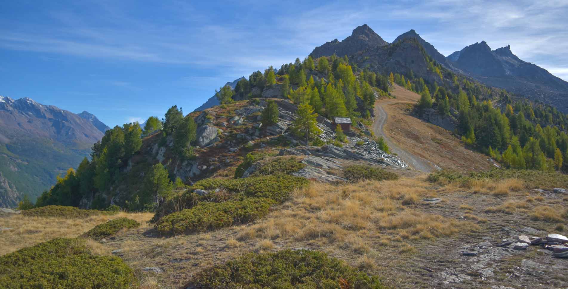 Von der Hannigalp folgt man dem Wegweiser in Richtung Chleinu Furgge und dann in Richtung Wannihoru. Kurz darauf beim nächsten Wegweiser, Punkt 2140m, folgt man nicht dem Gratweg Wannihoru, sondern dem Weg in Richtung Chuchiwang. Der Bergweg führt am Hang entlang und durch einen wunderschönen Lärchenwald bergauf. Vielleicht entdeckt man Eichhörnchen, Rotwild oder Steinwild. Nach rund 20 Minuten, Punkt 2268, erreicht man bereits einen schönen Aussichtspunkt mit Sitzbank. Weiter der Route in Richtung Chuchiwang folgend, wandert man stetig bergauf. Mit zunehmender Höhe lichtet sich der Wald. Beim Punkt 2348 ist man oberhalb der Waldgrenze angekommen. Hier biegt nach rechts auf den breiten Weg ein. Diesem folgt man wenige Minuten bis man nach links auf den bergaufführenden Wanderweg einbiegt.