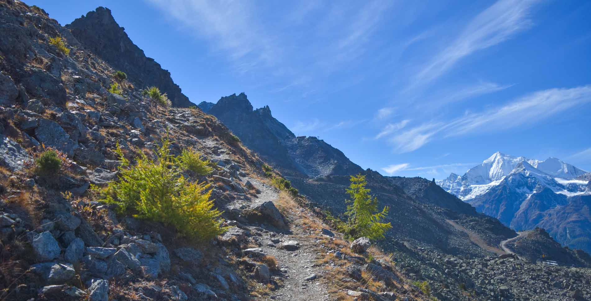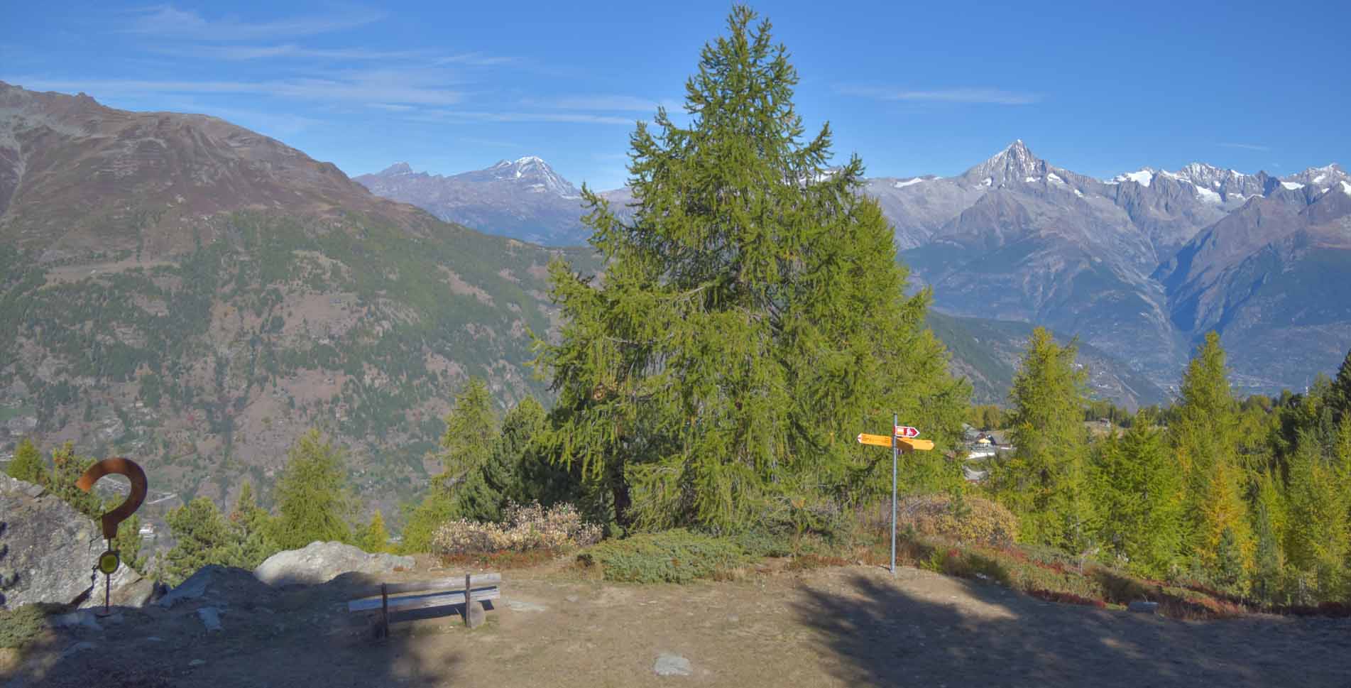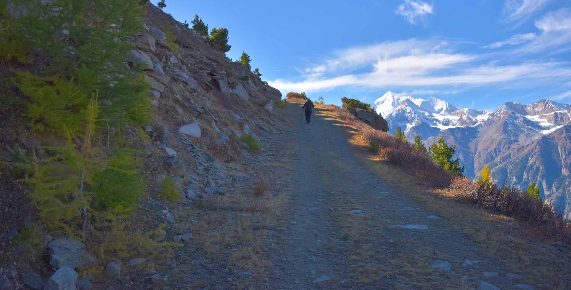 Von der Hannigalp folgt man dem Wegweiser in Richtung Chleinu Furgge und dann in Richtung Wannihoru. Kurz darauf beim nächsten Wegweiser, Punkt 2140m, folgt man nicht dem Gratweg Wannihoru, sondern dem Weg in Richtung Chuchiwang. Der Bergweg führt am Hang entlang und durch einen wunderschönen Lärchenwald bergauf. Vielleicht entdeckt man Eichhörnchen, Rotwild oder Steinwild. Nach rund 20 Minuten, Punkt 2268, erreicht man bereits einen schönen Aussichtspunkt mit Sitzbank. Weiter der Route in Richtung Chuchiwang folgend, wandert man stetig bergauf. Mit zunehmender Höhe lichtet sich der Wald. Beim Punkt 2348 ist man oberhalb der Waldgrenze angekommen. Hier biegt nach rechts auf den breiten Weg ein. Diesem folgt man wenige Minuten bis man nach links auf den bergaufführenden Wanderweg einbiegt.