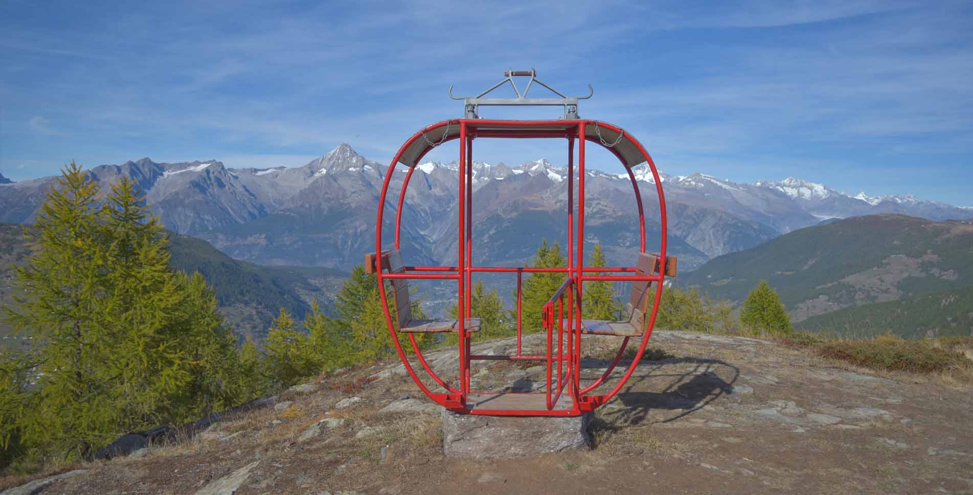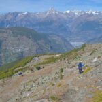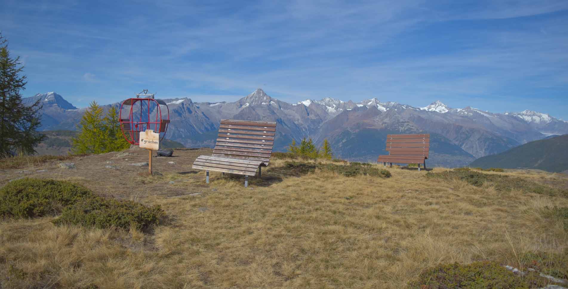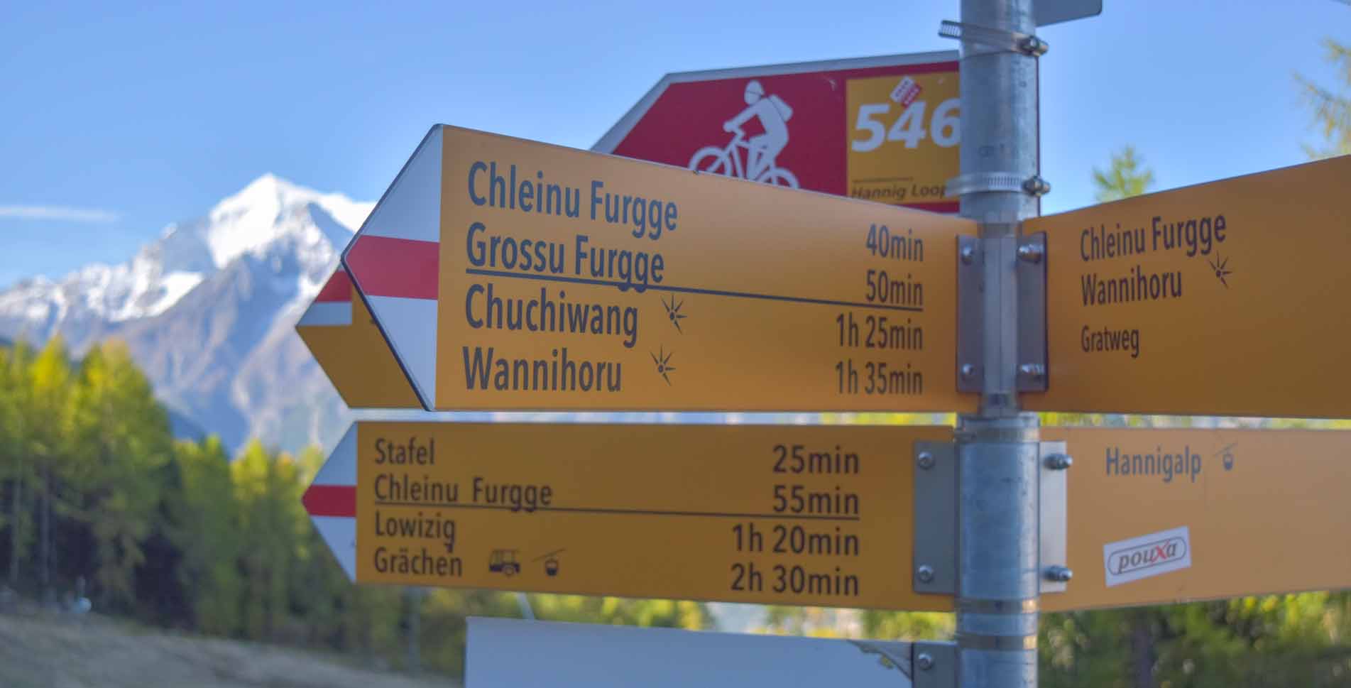 Der Abstieg erfolgt wie der Hinweg via Chuchiwang und an der Schutzhütte vorbei zum Wegweiser Punkt 2348. Von dort folgt man nun aber dem breiten Weg geradeaus (nicht signalisiert). Beim kommenden Wegweiser geht’s weiter geradeaus (nicht signalisiert) und bei der nächsten Weggablung folgt man dem linken, breiten Weg. Kurz darauf ist man beim Aussichtspunkt Chleinu Furgge angekommen. Hier gibt es zum Ausruhen Holzliegen und eine alte, offene Gondel. Auch hier geniesst man eine fantastische Aussicht. Vom Chleinu Furgge wandert man in rund 20 Minuten hinab zum Ausgangspunkt, der Hannigalp.