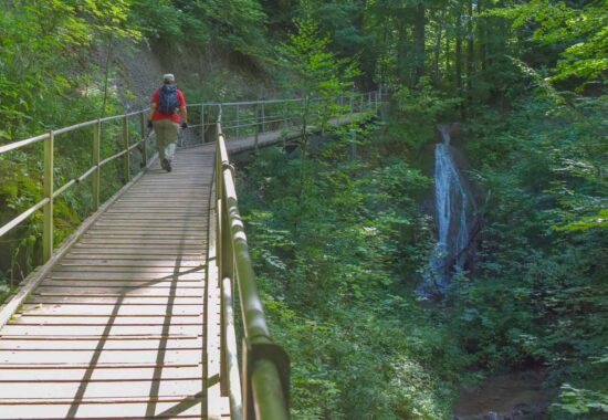 Vom Wasserfall geht es über Treppen bergauf, dann über Brücken zum Aquädukt und Tobelweiher und an den beiden Tobeltürmen vorbei. Kurz darauf erreicht man eine Abzweigung, wo man alternativ auch weiter zum Restaurant Rosinli und zurück nach Kempten weitergehen kann.